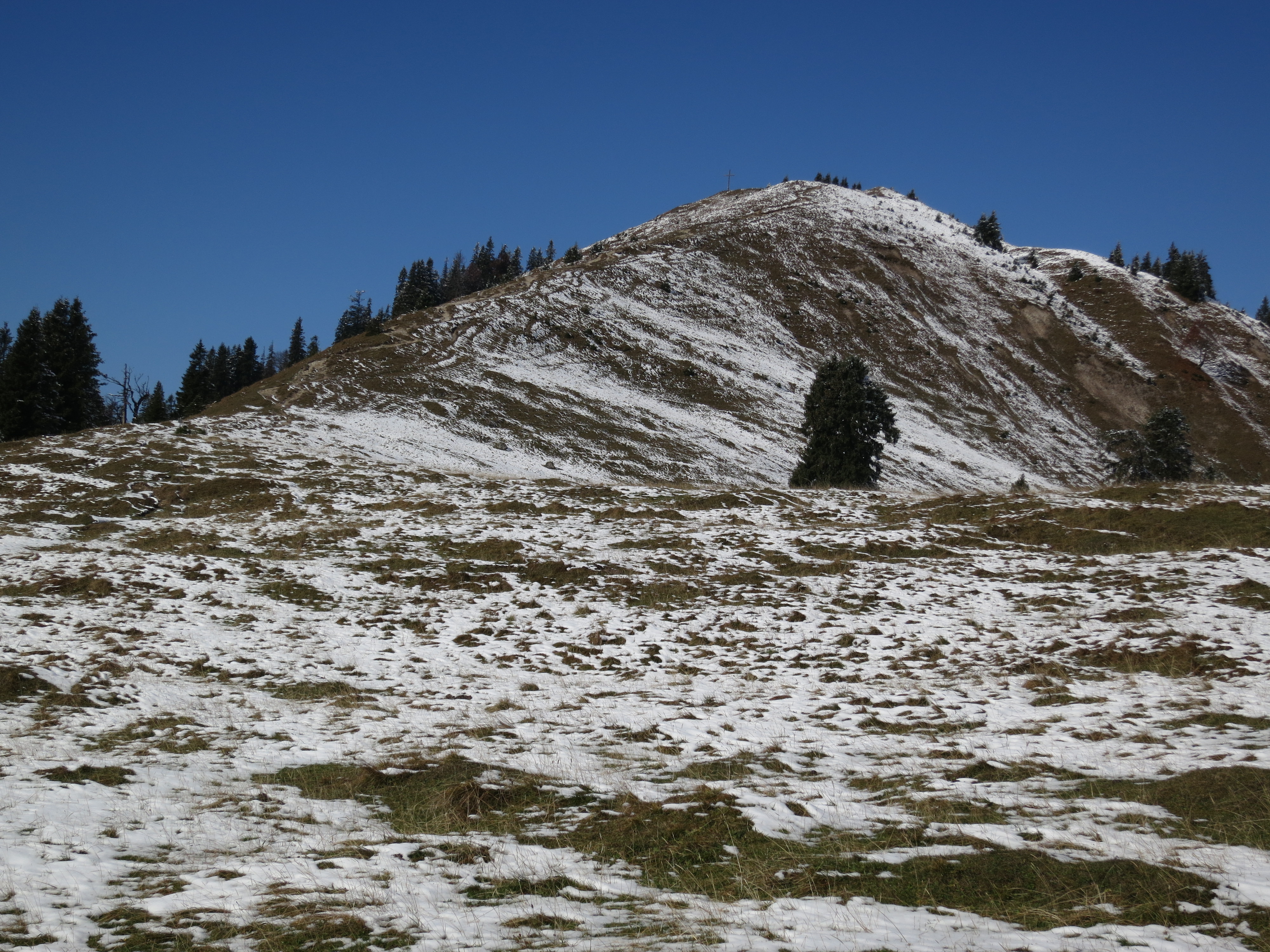 Aufstieg auf der Südseite über die Pfundalm: Wege meist feucht, abschnittsweise auch etwas batzig, der Schnee am Gipfelhang (Bild 1) ist nicht hinderlich.