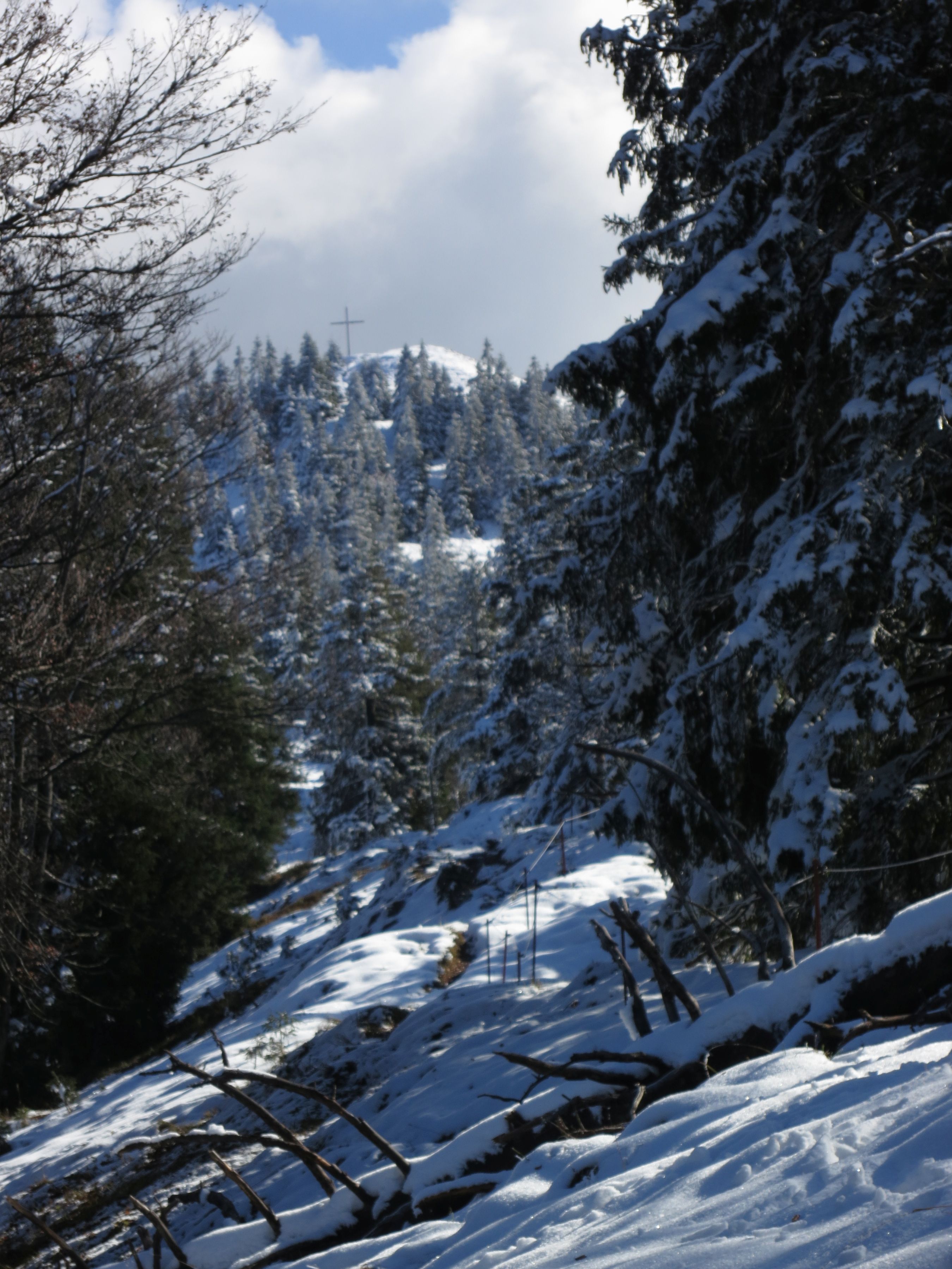 Abstieg direkt vom Gipfel über Pfadspuren (diese waren im oberen Teil noch unter Schnee, aber meist gut erkennbar) auf dem Nordwestkamm (Bild 5, Blick zurück zum Gipfelkreuz) bis zur Kotalm (Bild 6). Dieser Weg ist nicht beschildert und markiert. Von der Kotalm auf der Forststraße weiter. Eigentlich biegt man alsbald von der Forststraße nach links auf einen beschilderten Fußweg zum Bach ab. An dieser Stelle kam mir aber ein Wanderer entgegen, der von diesem Abstieg abgeraten hat. Durch Forstarbeiten gibt es sehr matschige Abschnitte (ich konnte seine Schuhe begutachten). Deshalb bin ich auf der langweiligen Forststraße geblieben.