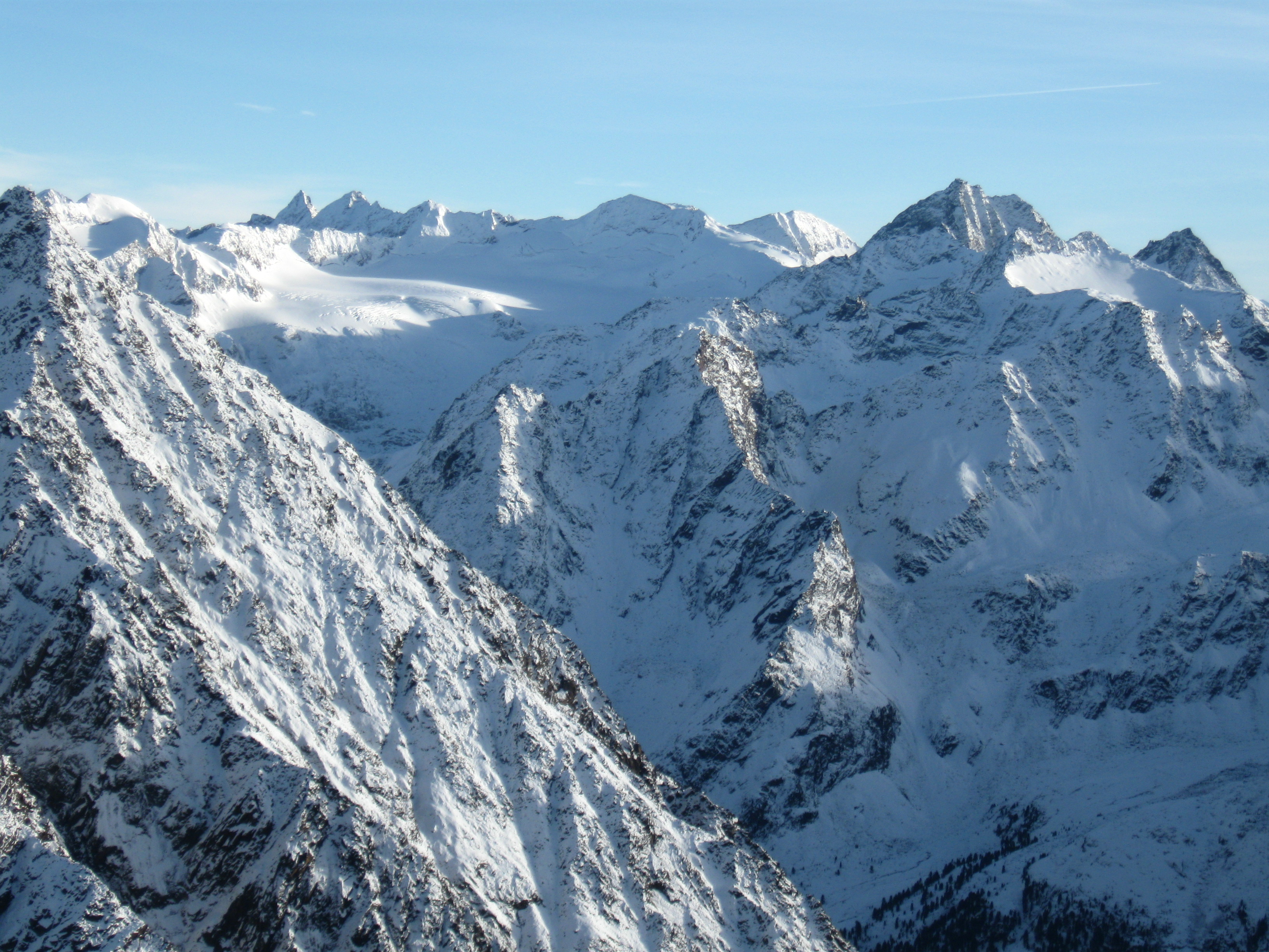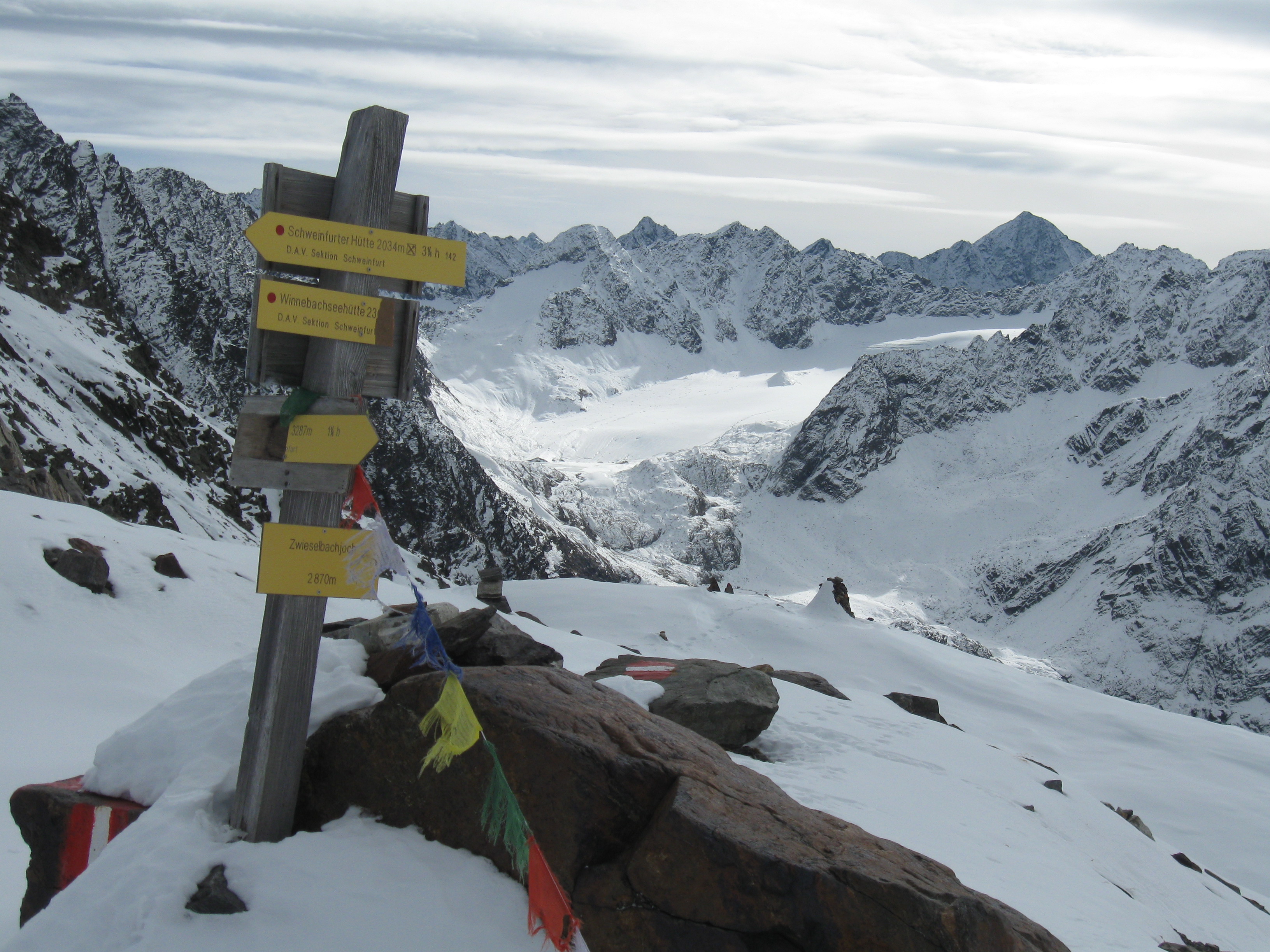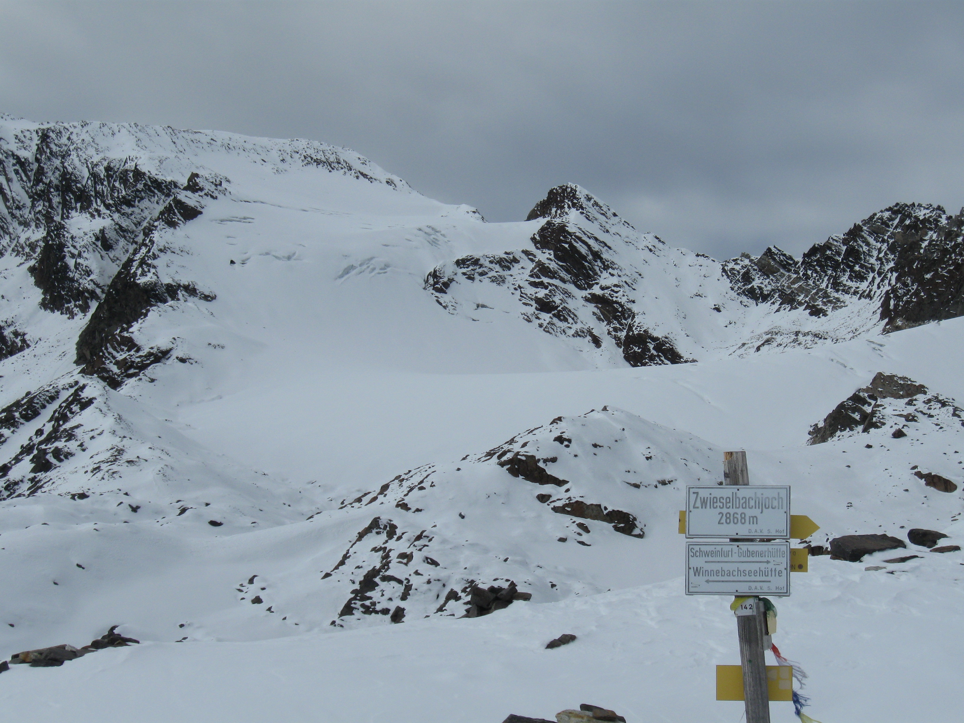 Tourenverhältnisse: Der Weg zur Hütte ist faktisch schneefrei. Der Steig zum Gänsekragen ist ebenso bis auf die untersten, flachen und die obersten, steilen ca. 50 Hm schneefrei, im Gipfelbereich am Samstag noch schneebedeckter plattiger Fels. Dazwischen ein kleiner Steig durch sehr steile, schneefreie Südhänge. Der Weg zum Zwieselbachjoch führt fast durchgehend durch Schnee, zunächst ca.5-10 cm tief, weiter oben etwa 20 cm tief. Keinerlei Probleme. Auch der Breite Grieskogel wurde am Sonntag bestiegen. Die Besteiger mussten alles spuren und brauchten rund fünf Stunden. Nachmittags taute es an beiden Tagen. Nachts ziemlich klar bei null Grad.