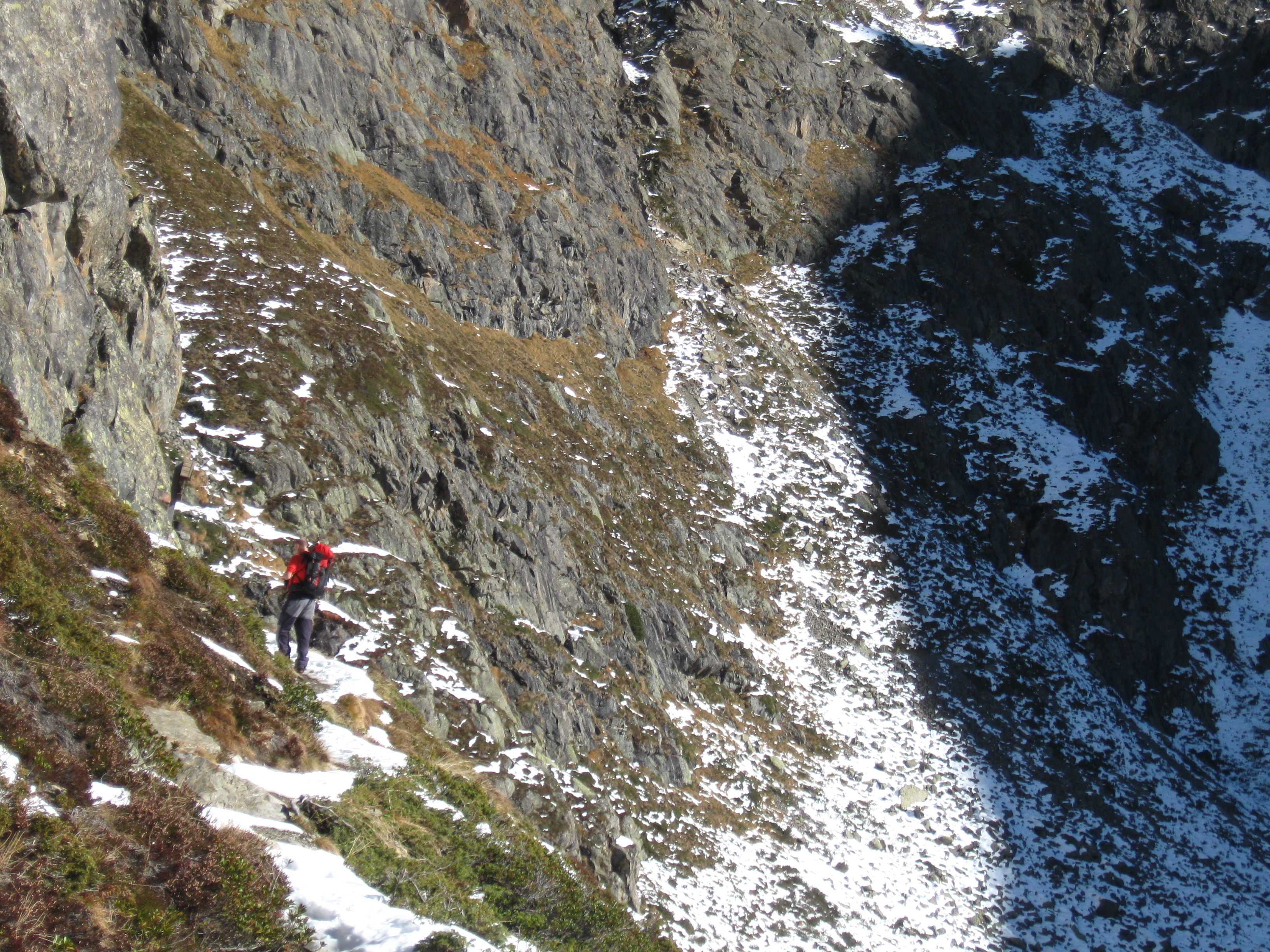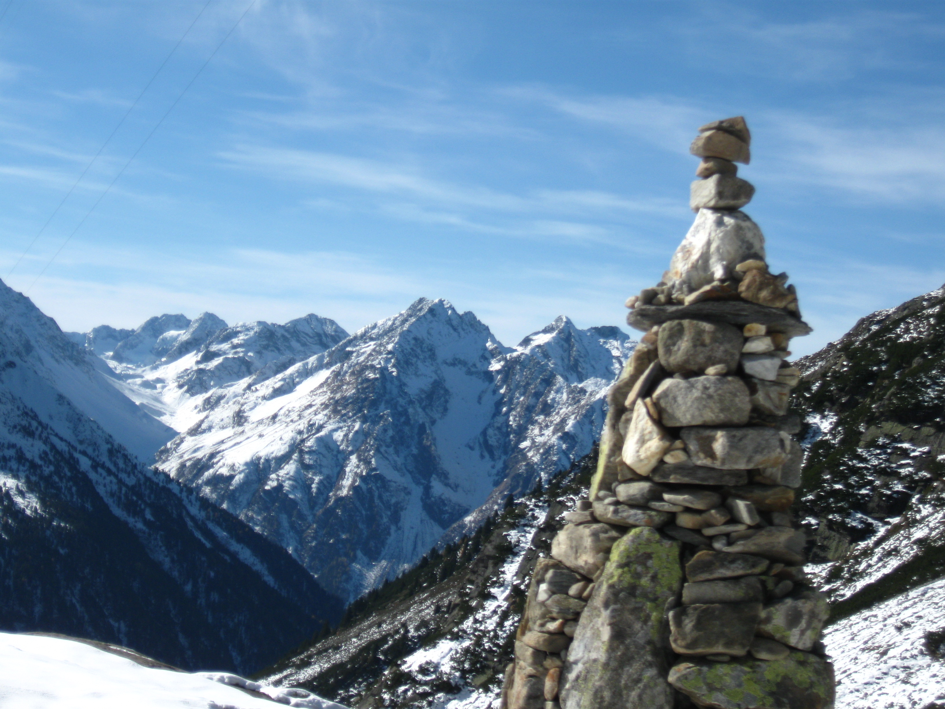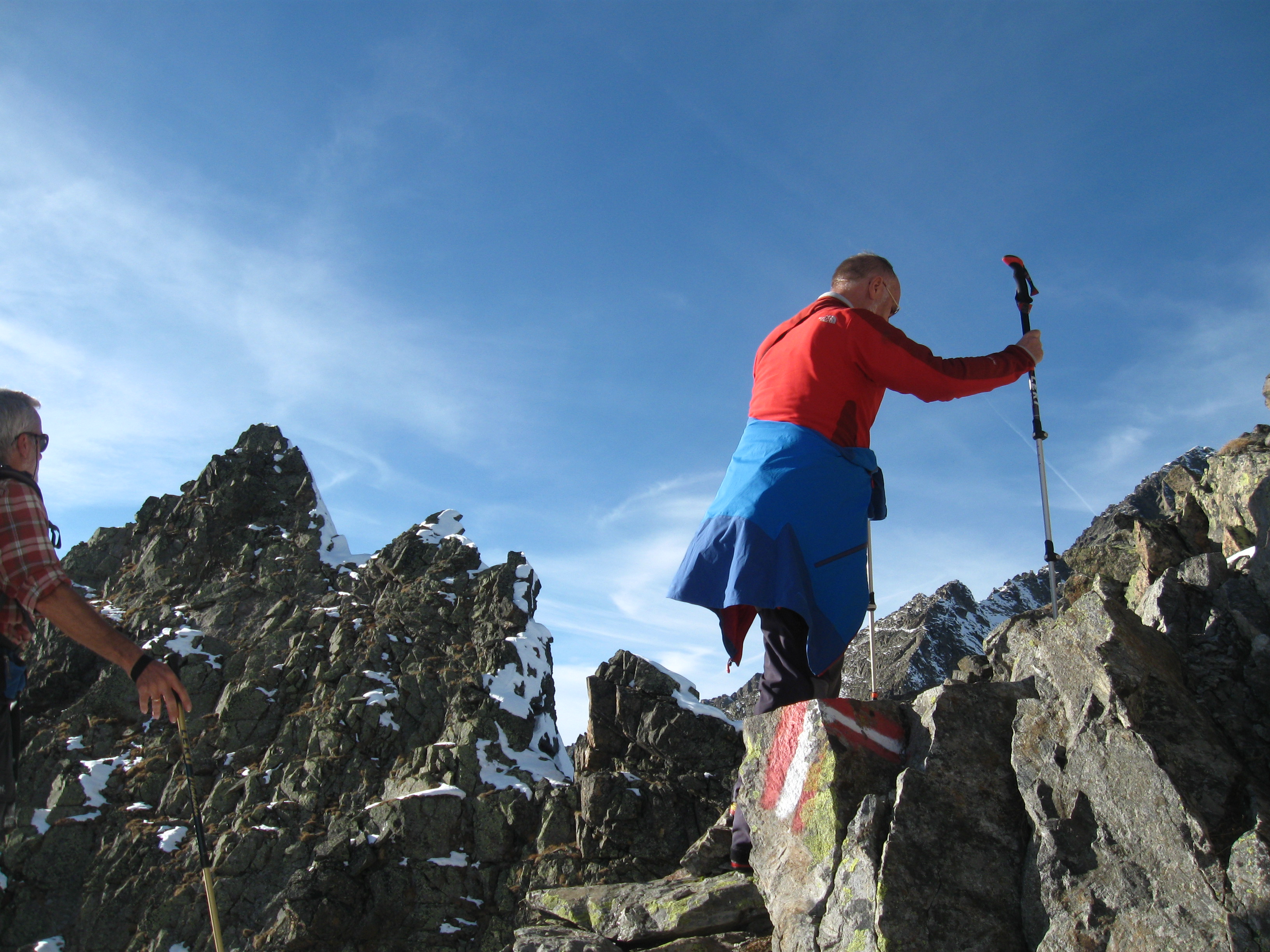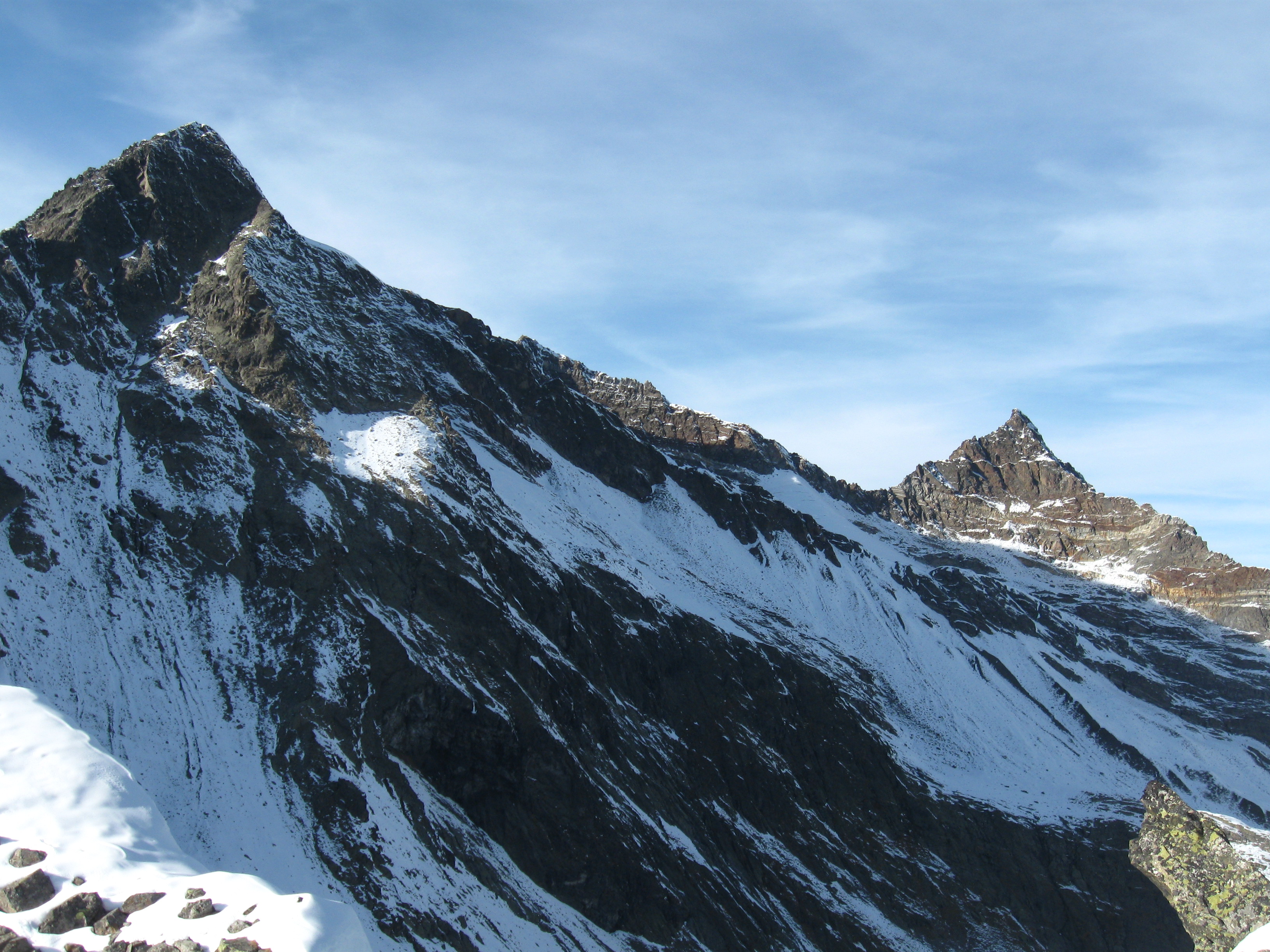 Tourenverhältnisse: Der Weg zur Hütte ist faktisch schneefrei. Der Steig zum Gänsekragen ist ebenso bis auf die untersten, flachen und die obersten, steilen ca. 50 Hm schneefrei, im Gipfelbereich am Samstag noch schneebedeckter plattiger Fels. Dazwischen ein kleiner Steig durch sehr steile, schneefreie Südhänge. Der Weg zum Zwieselbachjoch führt fast durchgehend durch Schnee, zunächst ca.5-10 cm tief, weiter oben etwa 20 cm tief. Keinerlei Probleme. Auch der Breite Grieskogel wurde am Sonntag bestiegen. Die Besteiger mussten alles spuren und brauchten rund fünf Stunden. Nachmittags taute es an beiden Tagen. Nachts ziemlich klar bei null Grad.