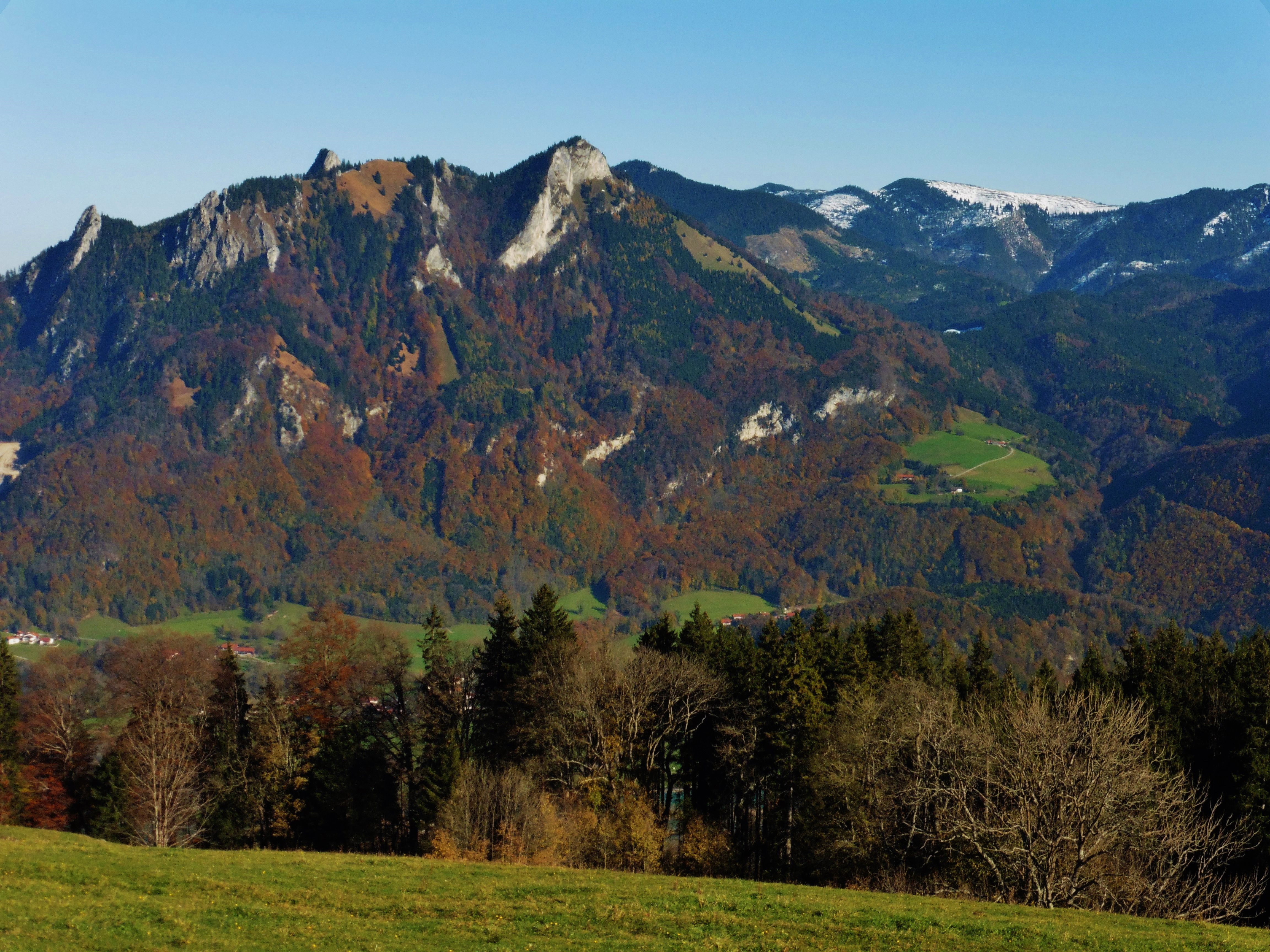zu Bild 1: ein Foto der Heuberggruppe vom Herbst 2014; ganz links die Kindlwand, in der Mitte der grasige Gipfel des Heubergs, darüber der felsige Gipfel der Wasserwand und ganz rechts der markante Kitzstein;