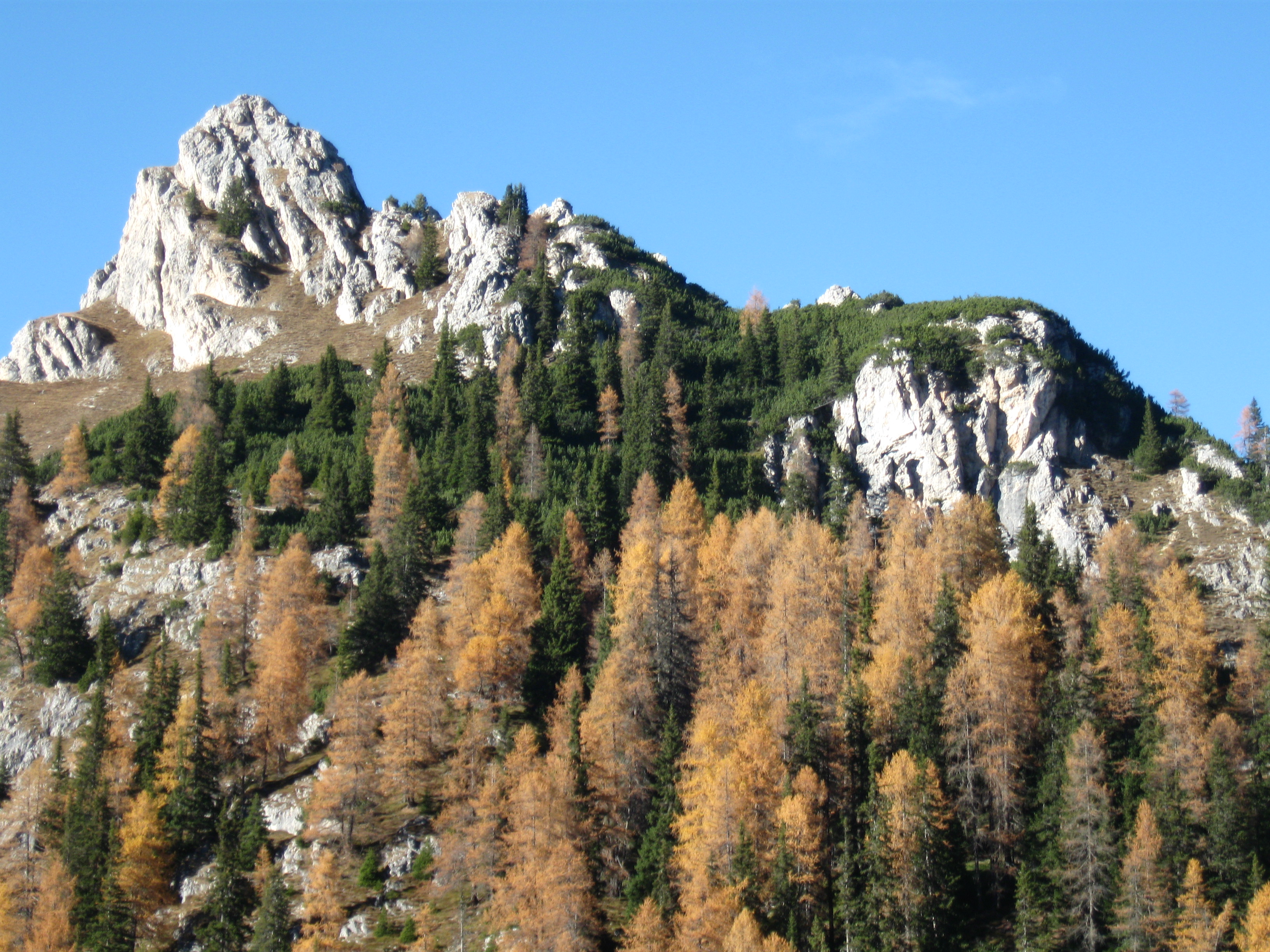 Tourenverhältnisse: Vom See auf einer Forststraße bis zur Grünwaldalm. Von dort auf Weg 22a zu P. 2033m (Sattlhüttl). Ab hier weglos durch dichte Latschen über den Ostgrat. Absolut abzuraten! Zum Schluss Schrofenkletterei (I+) bis zum Gipfel. Abstieg dann ebenfalls weglos durch die Südflanke. Von den in der Kompasskarte eingezeichneten Wegspuren war nichts zu finden.