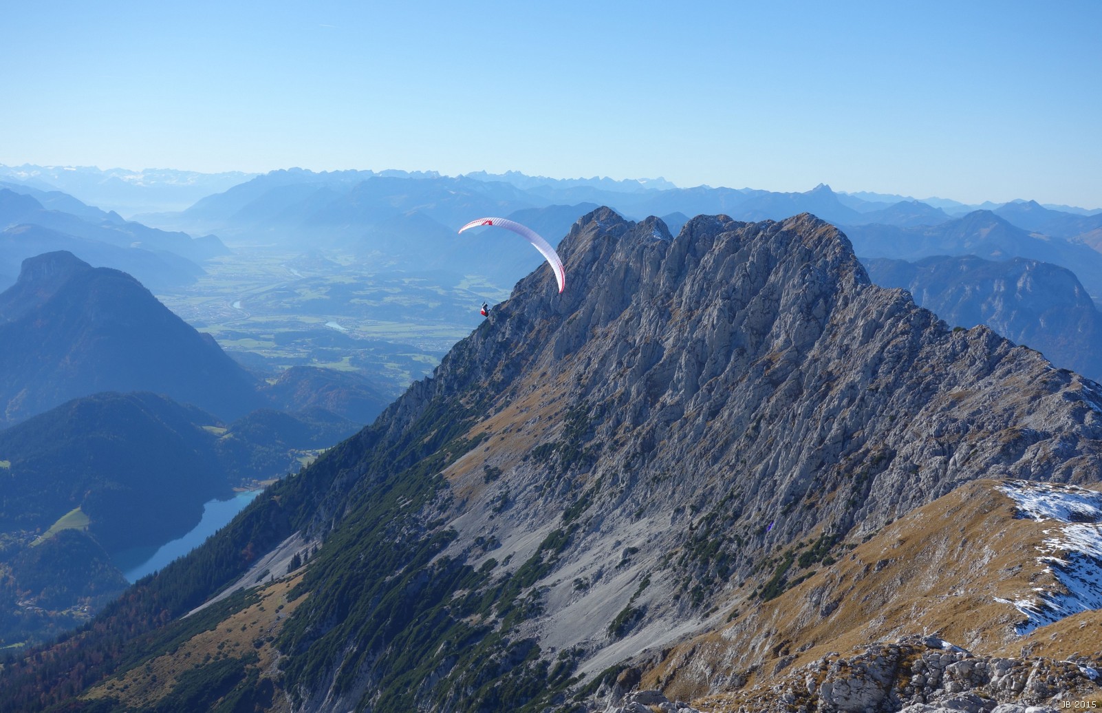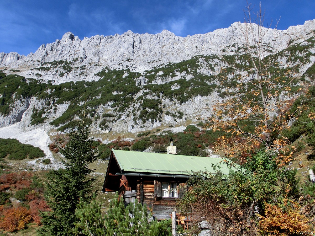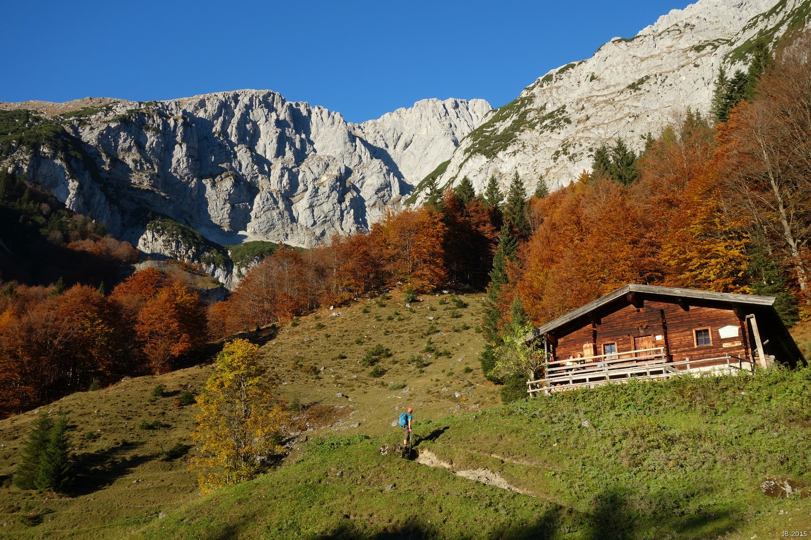 Traumhaft schöne Herbststimmung, blauer Himmel mit weißen Kaiserfelszacken.
