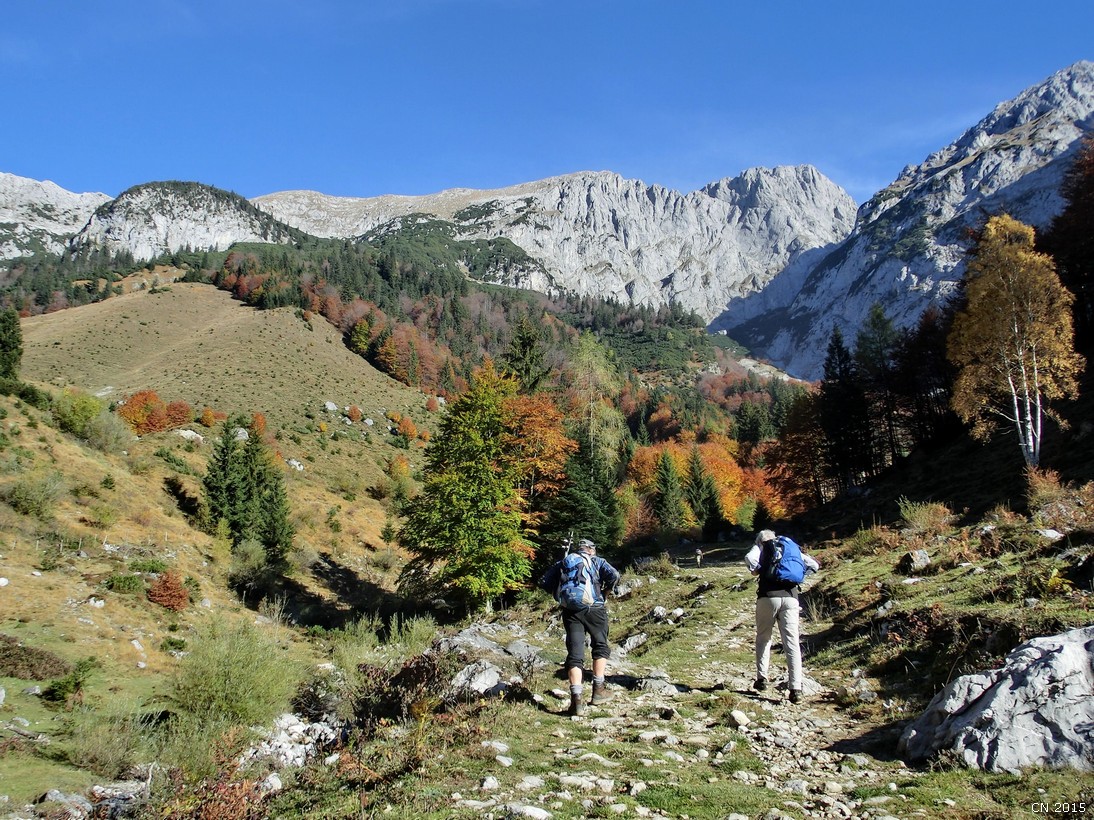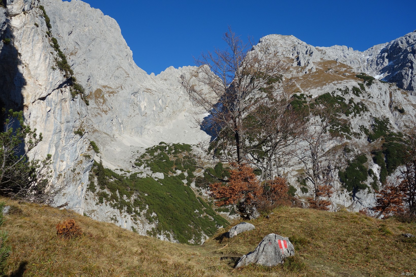Vom PP Jägerwirt über die Kaiser Hochalm 1417m unter der Südwand des Sonnensteins steil auf die Kopfkraxen.