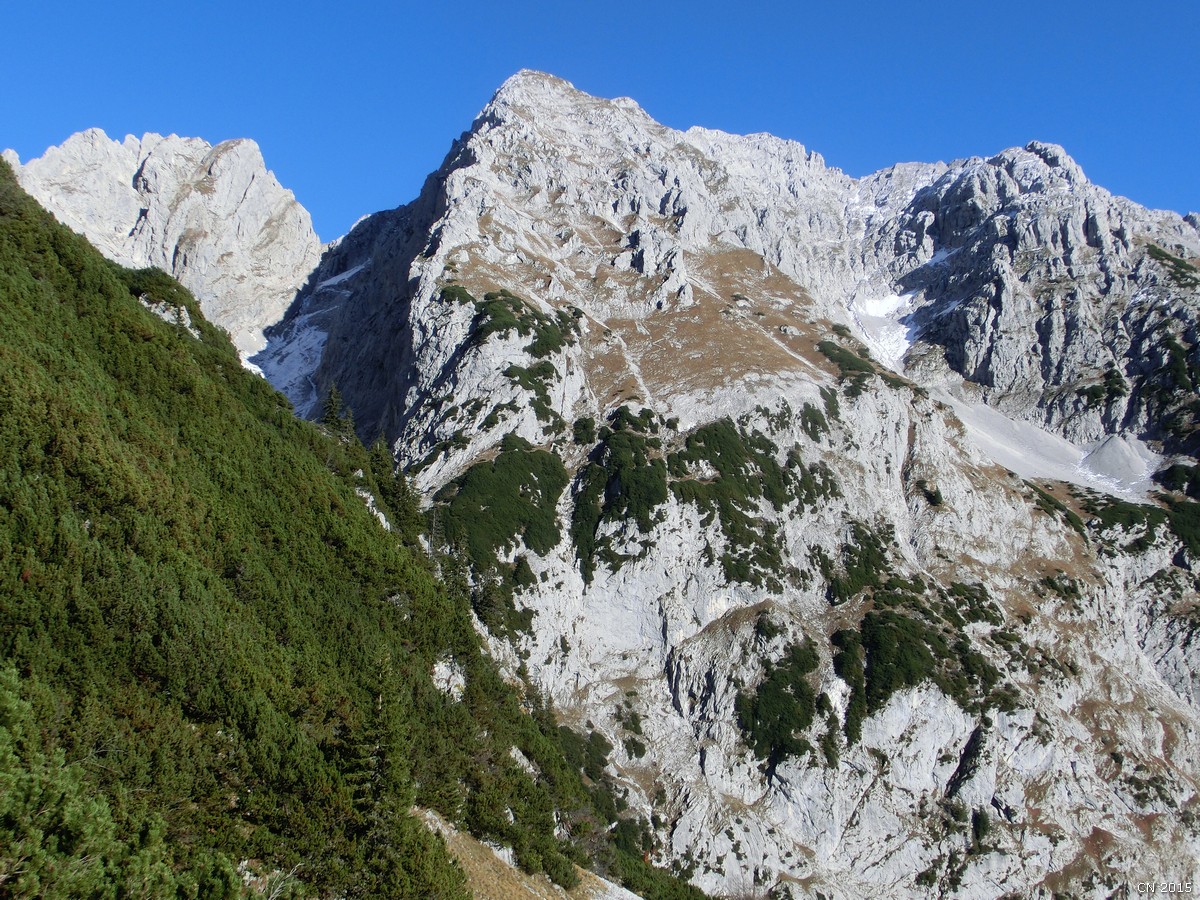 Man erreicht 100m unter der Abzweigung den Weg 826, der bis zum leider trockenen Wasserfall am unteren Ende des Schneekars verfolgt wird.