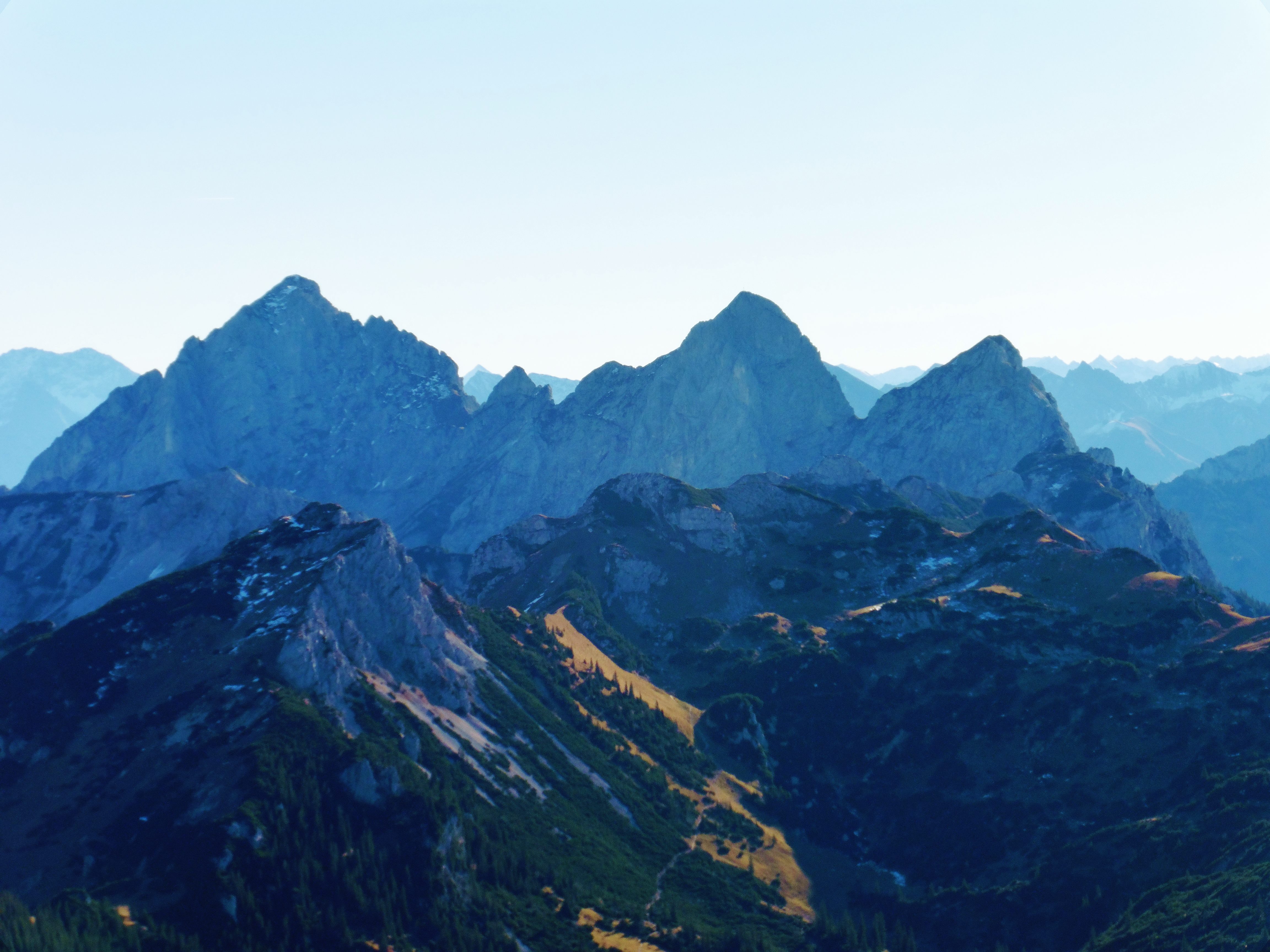 zu Bild 3: Blick in die zentralen Tannheimer Berge; von links - Kellespitze, Gimpel und Rote Flüh;