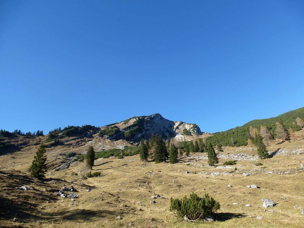 Parken am Wendeplatz für Räumfahrzeuge noch vor Melleck. Vielleicht einen Kilometer über Forststraße, dann auf den bezeichneten Steig „Sonntagshorn über Rosskar“. Sehr schöner, kaum begangener Steig. Oft im Steilgelände, gut befestigt, aber nicht bei Schnee empfehlenswert. Das Rosskar zeigt sich sehr idyllisch. Im Sattel zwischen Peitingköpfl und Sonntagshorn würde man auf den normalen Aufstiegsweg stoßen. Wir sind jedoch vorher schon weglos gequert und so nur knappe 250 Höhenmeter auf dem Hauptweg gegangen. Selbst da waren nur wenige Leute auf Tour. Die übrigen 17 km kein Mensch.