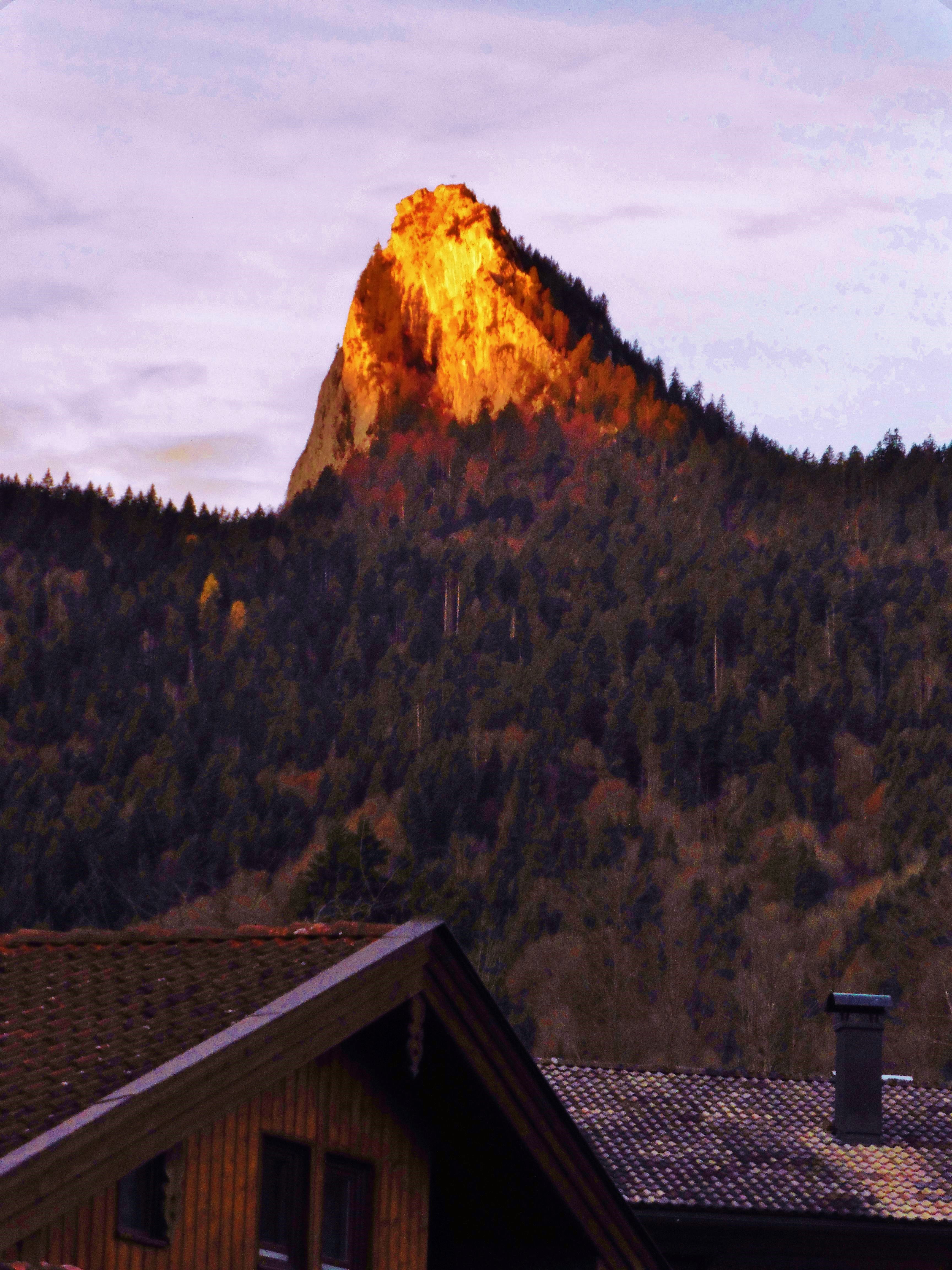 zu Bild 1: Sonnenaufgang am Leonhardstein; über die bewaldete Rampe in der Südwand vollzieht sich der Aufstieg;