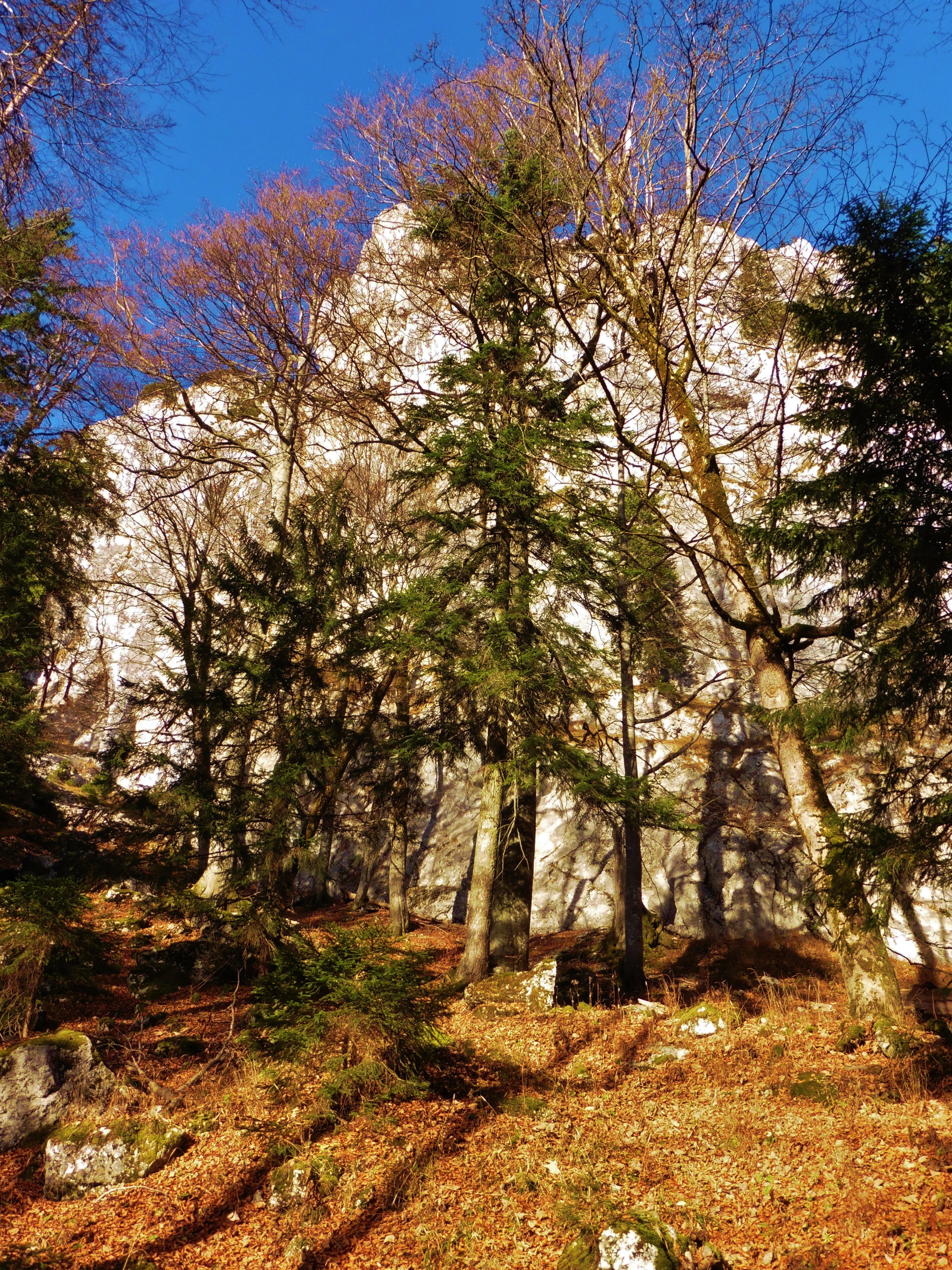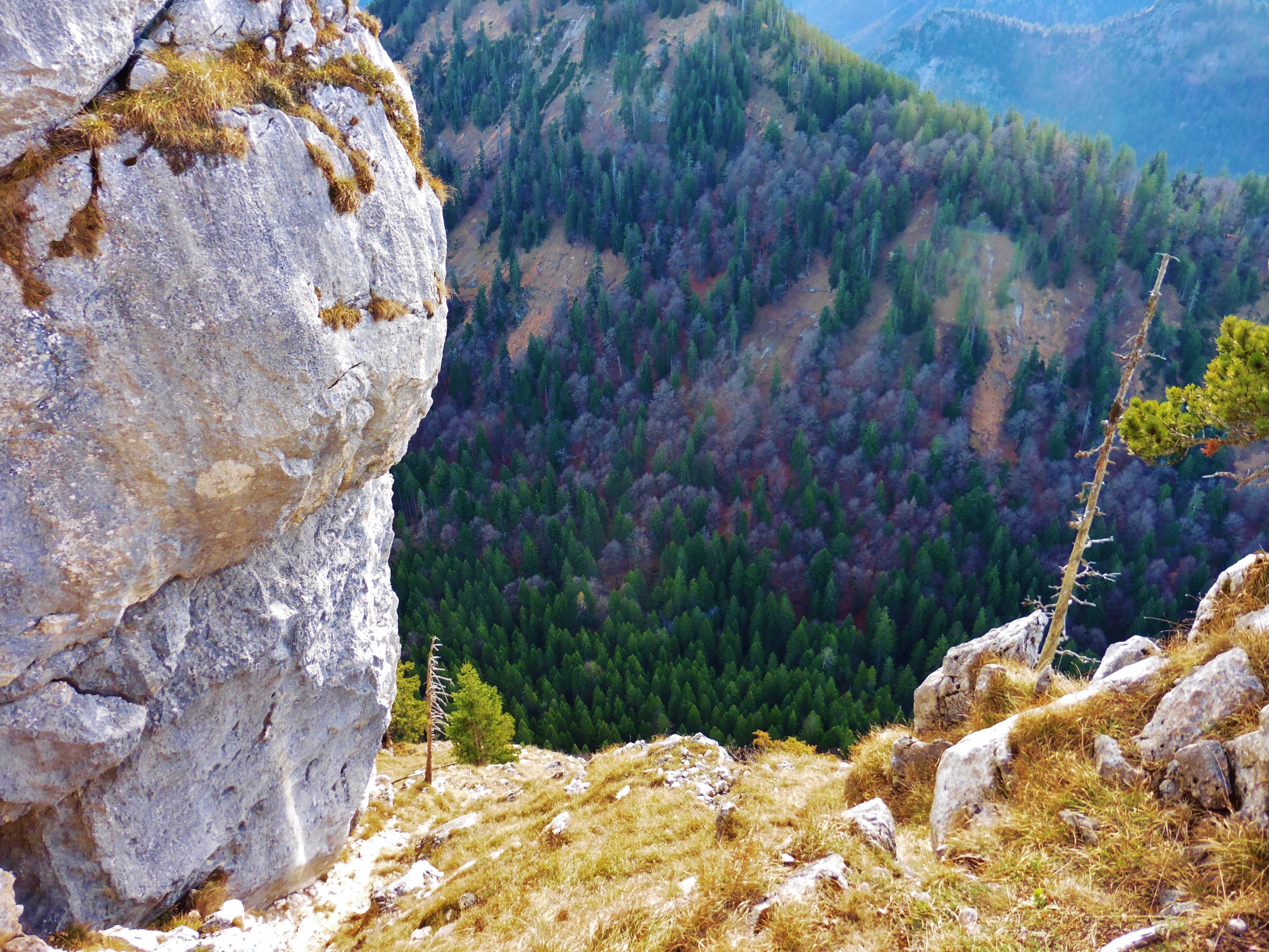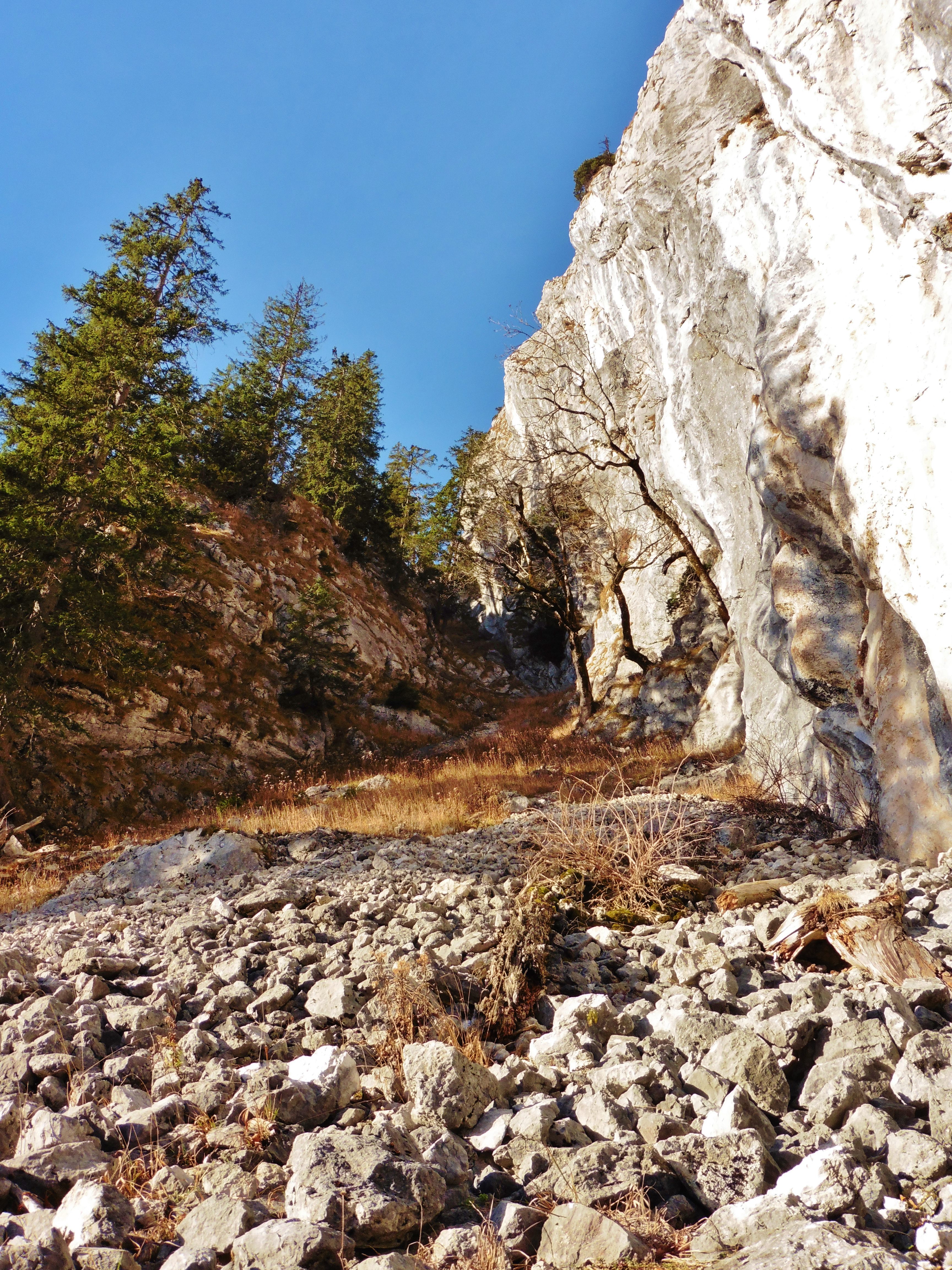 Sonstiges: vom Parkplatz auf dem markiertem Weg "Leonhardstein" bis zu breiter Forststraße auf der Duslaualm; der Straße nach links bis zu deren Ende folgen; jetzt scharf rechts / nördlich in der urwaldähnlichen Landschaft (Riesensteine, Totholz etc.) steil in Richtung Südwand; falls Trittspuren existieren, so sind diese derzeit unter dem dichtem Laub nicht erkennbar; am Fuße der Wand nach links bis zu markanter Rinne (Steigspuren im Geröll);
