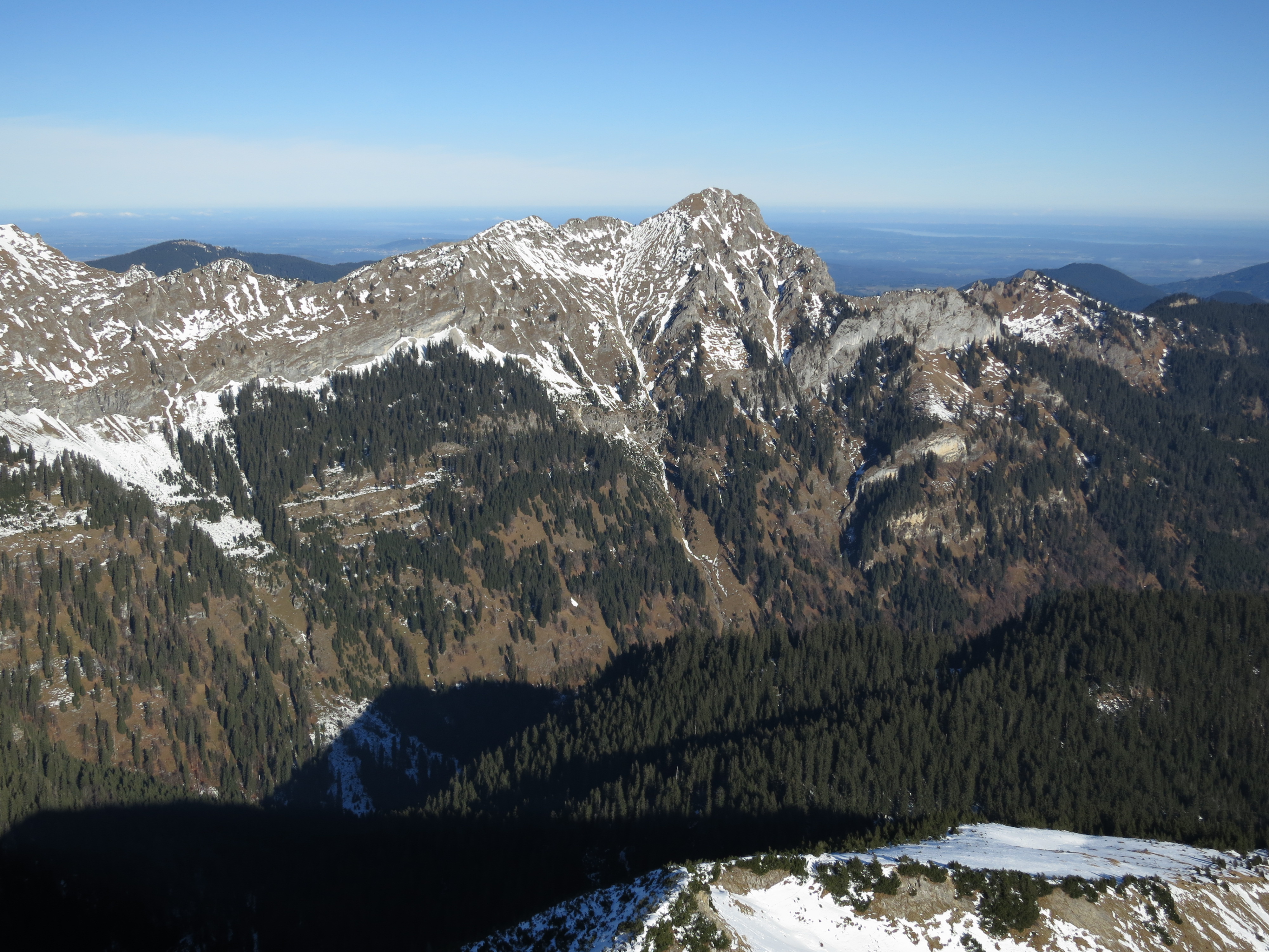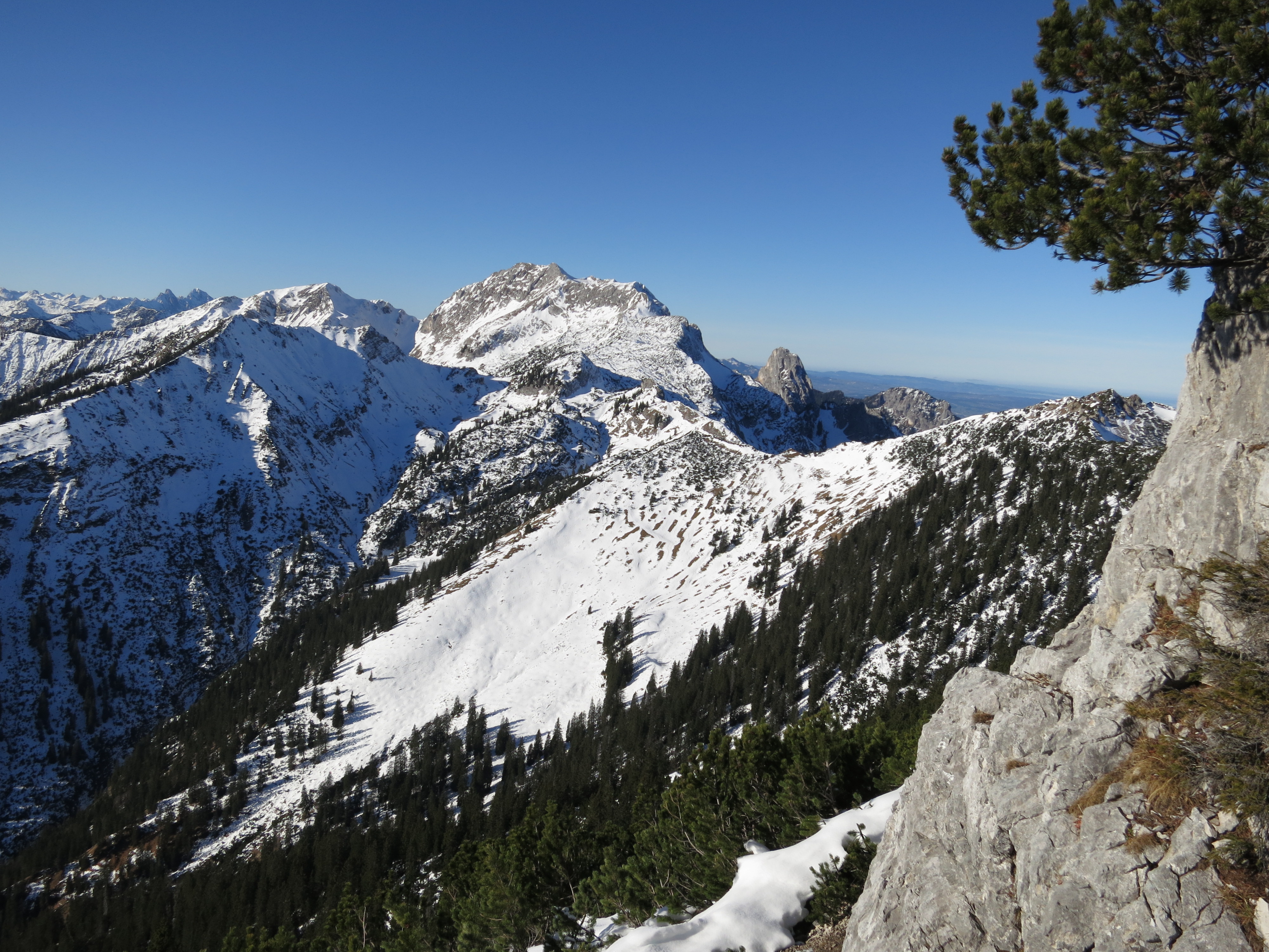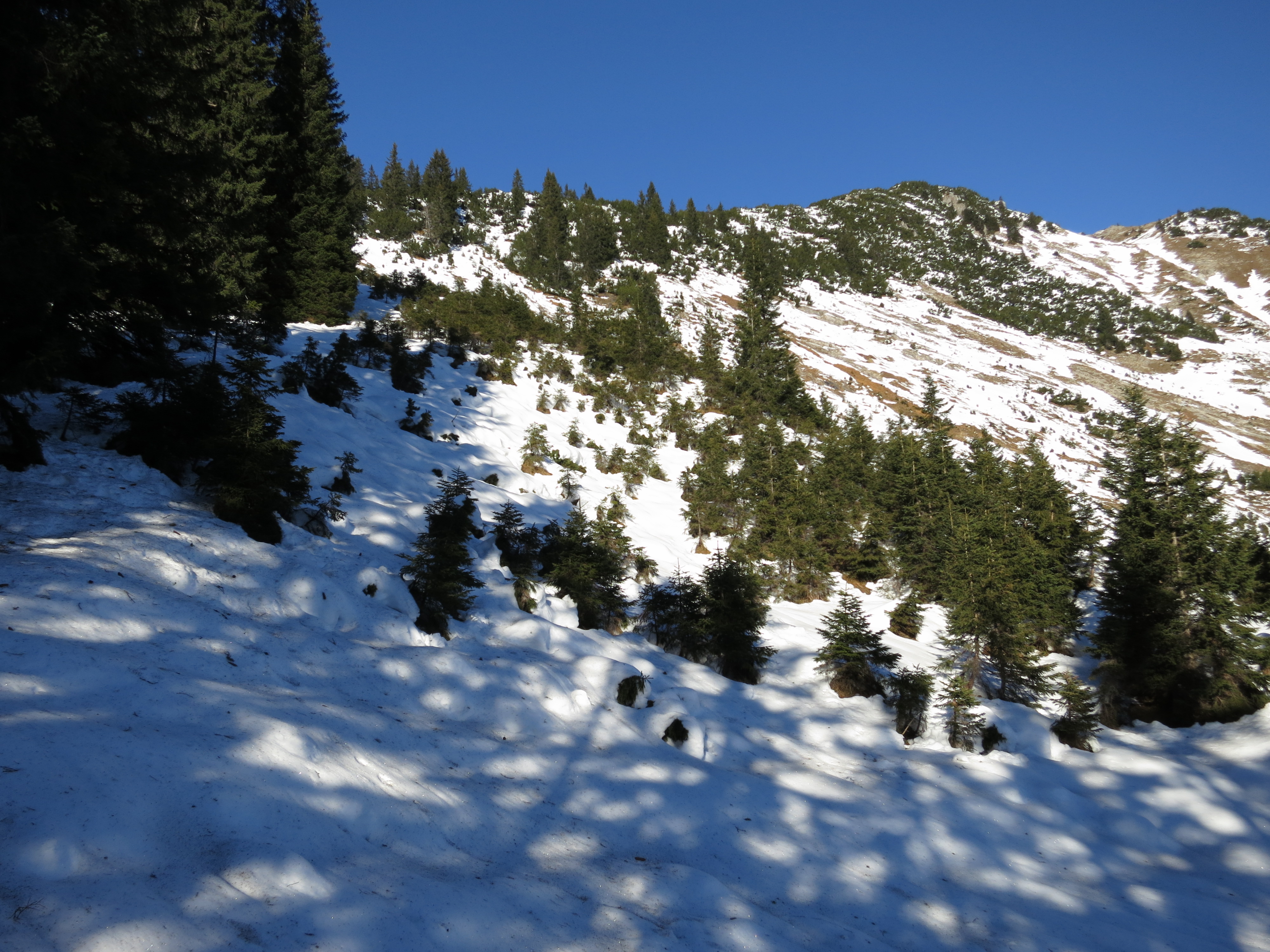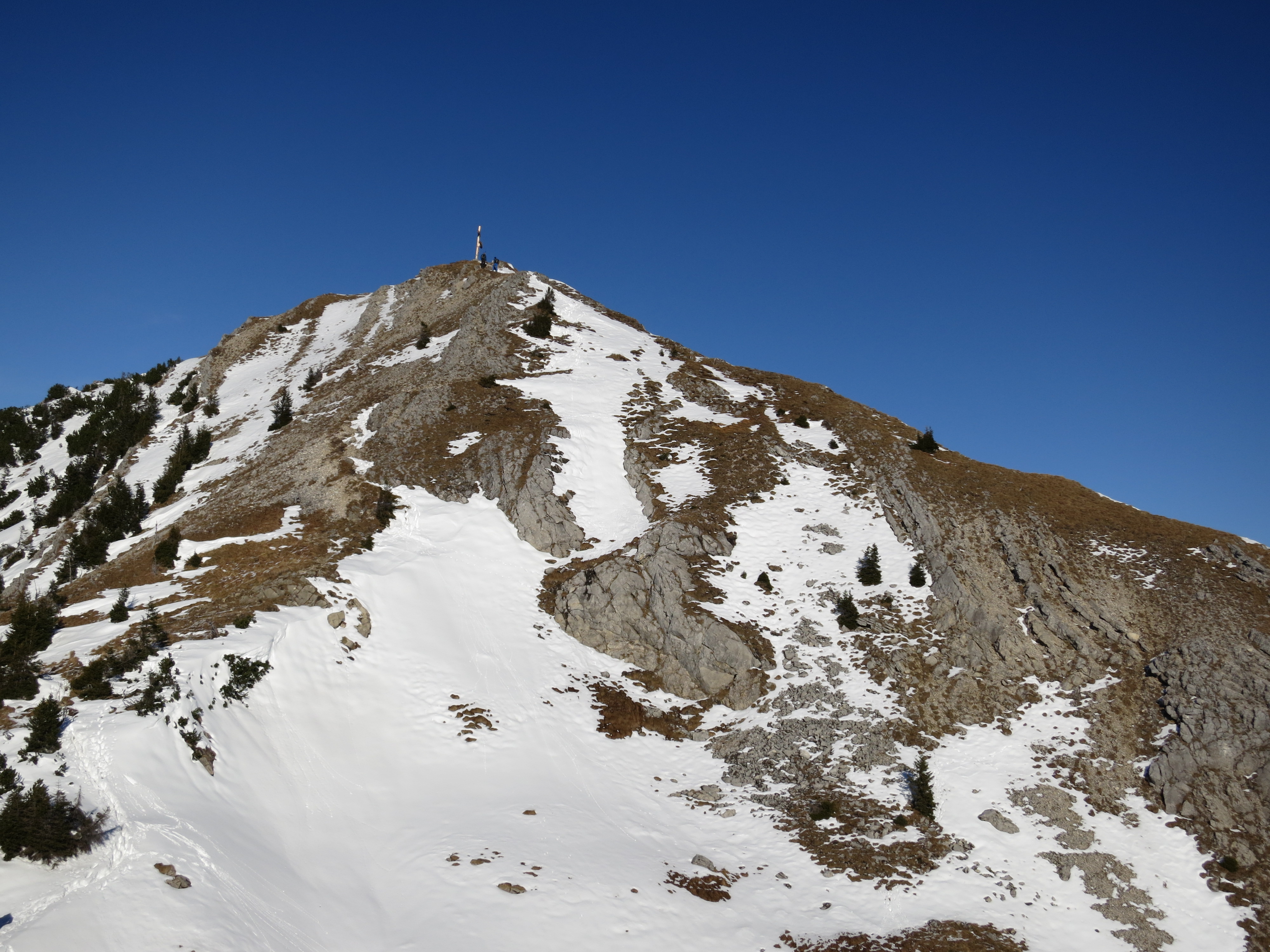 Tourenverhältnisse: gute Wanderverhältnisse. Ab ca. 1400 m Schnee mit vielen Unterbrechungen am Weg; ab ca. 1600 m (Beginn des Latschenabschnitts; Bild 1) deutlich mehr Schnee bis zum Vorgipfel und der Senke danach (aber bereits gute Spur vorhanden); der kurze Aufstieg zum Hauptgipfel ist wiederum ziemlich schneefrei. Insgesamt kaum batzige Abschnitte.