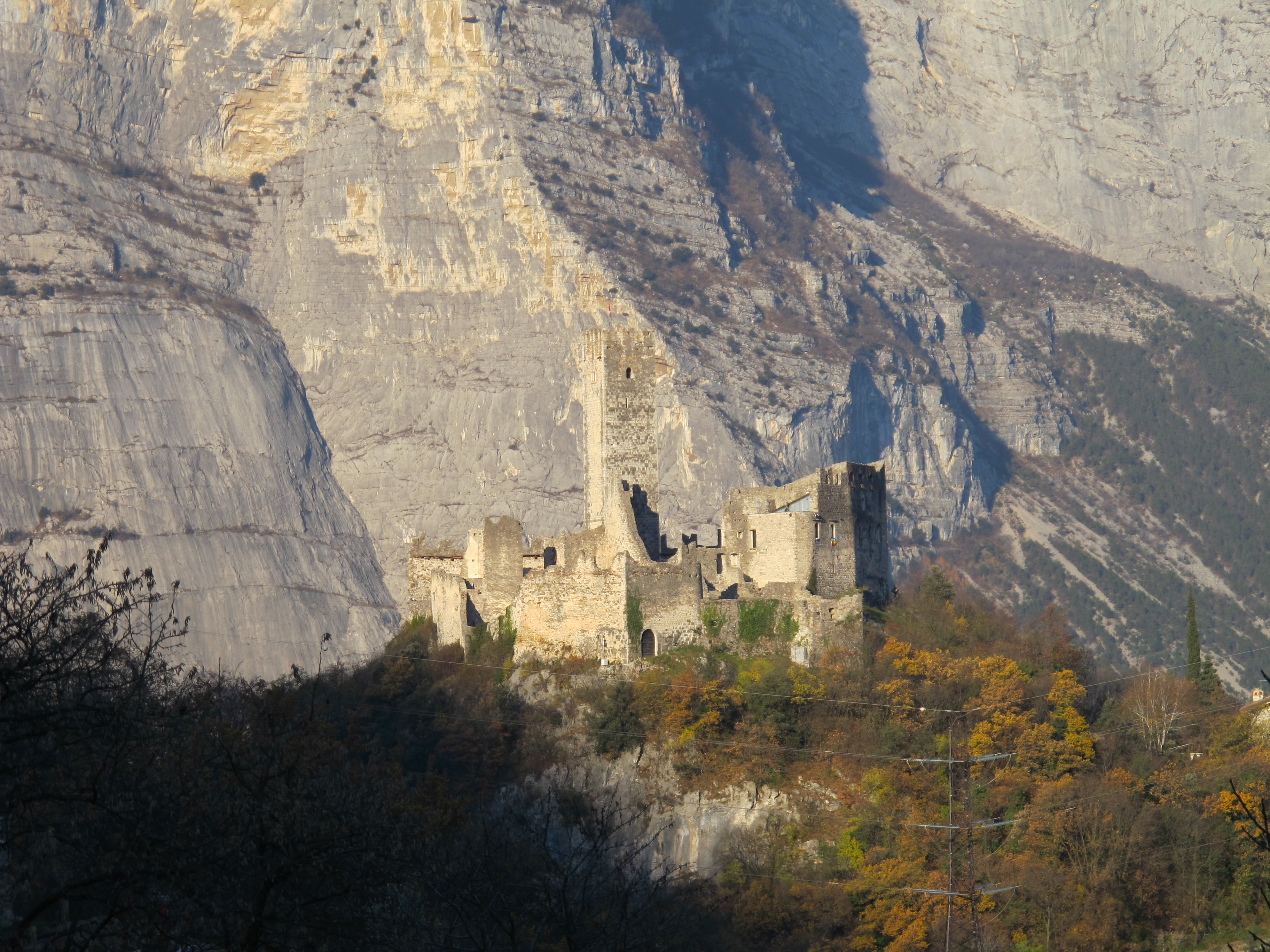 Bilder / GPS-Track: 1.Weihnachtsstimmung in Canale/Tenno, 2. Burg von Drena, vor Cima al Coste und Monte Brento, 3.-5. Piazschuppe in der dritten SL, 6.- 8. schwere Platte in der 5. SL, 9. Arco