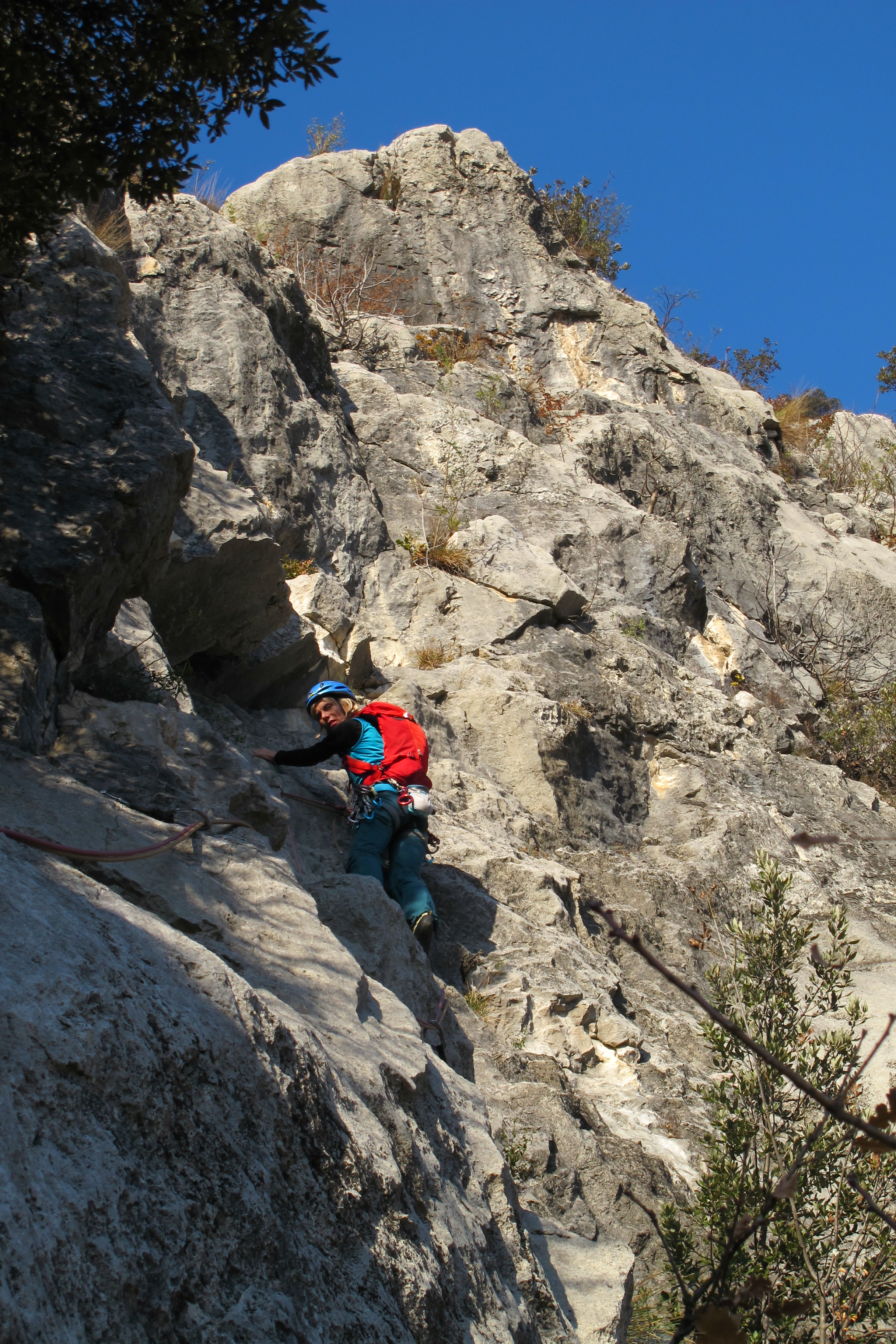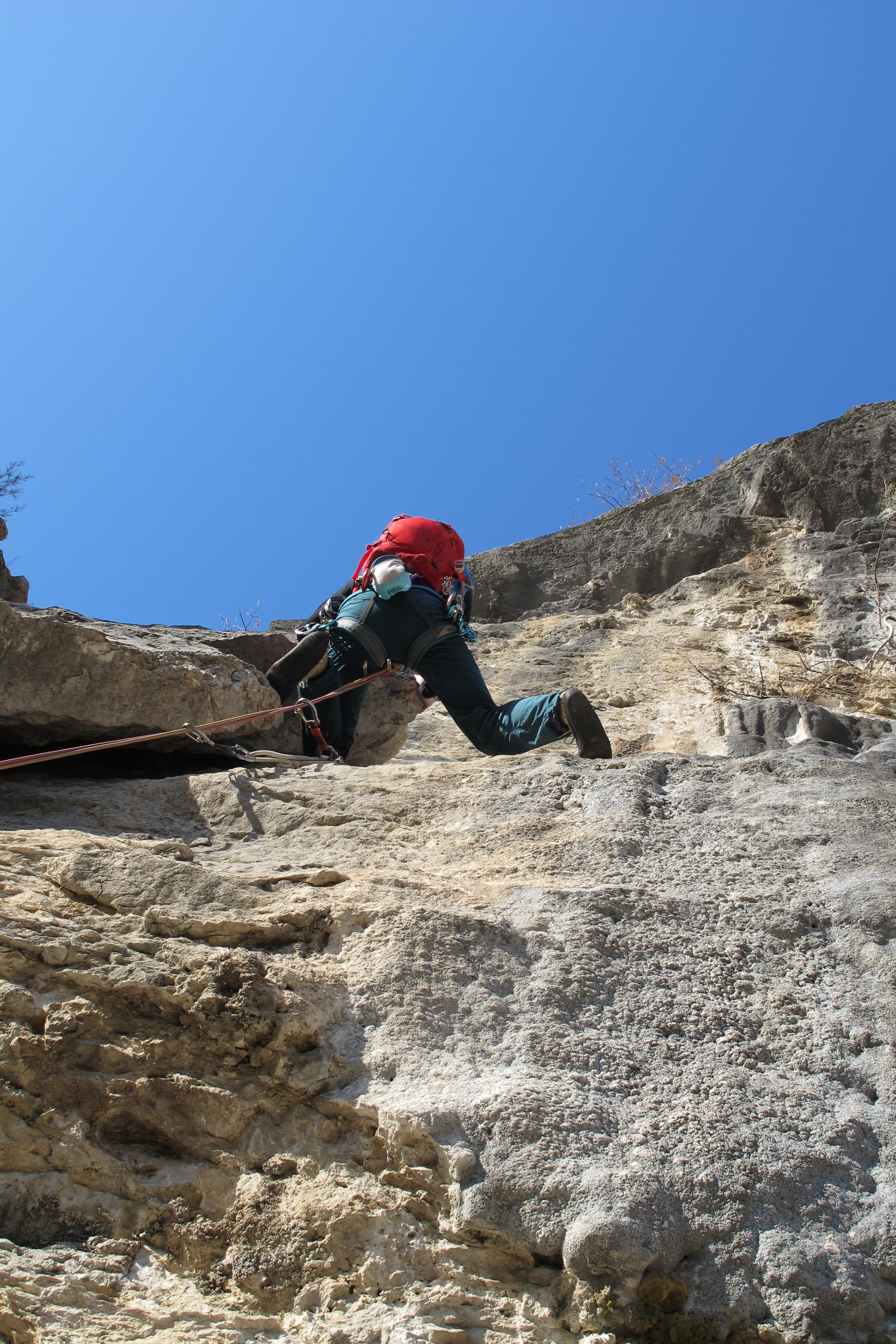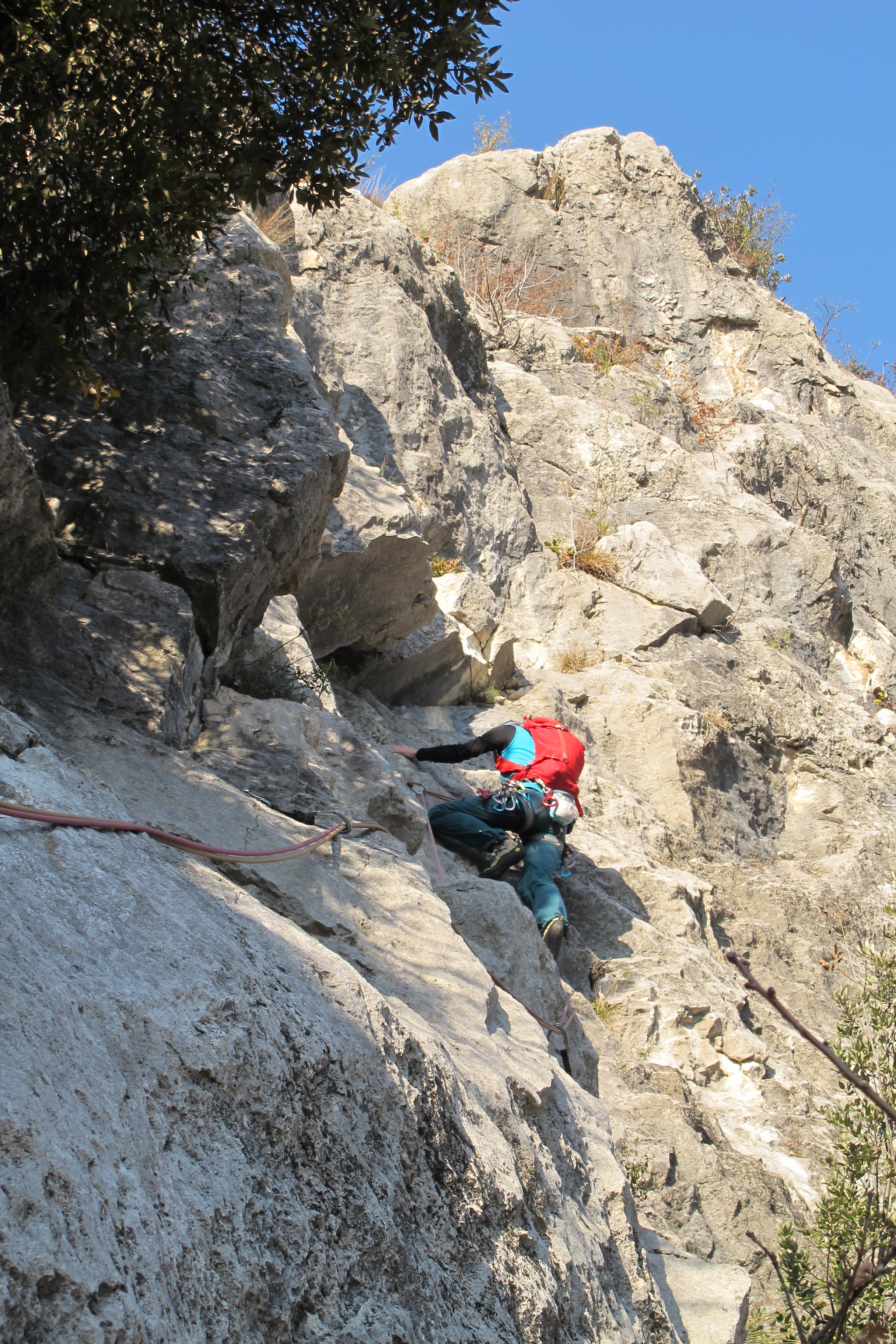 Gefahreneinschätzung: Alpine Tour, Stände gebohrt, Bohrhaken, Normalhaken und Sanduhrschlingen.