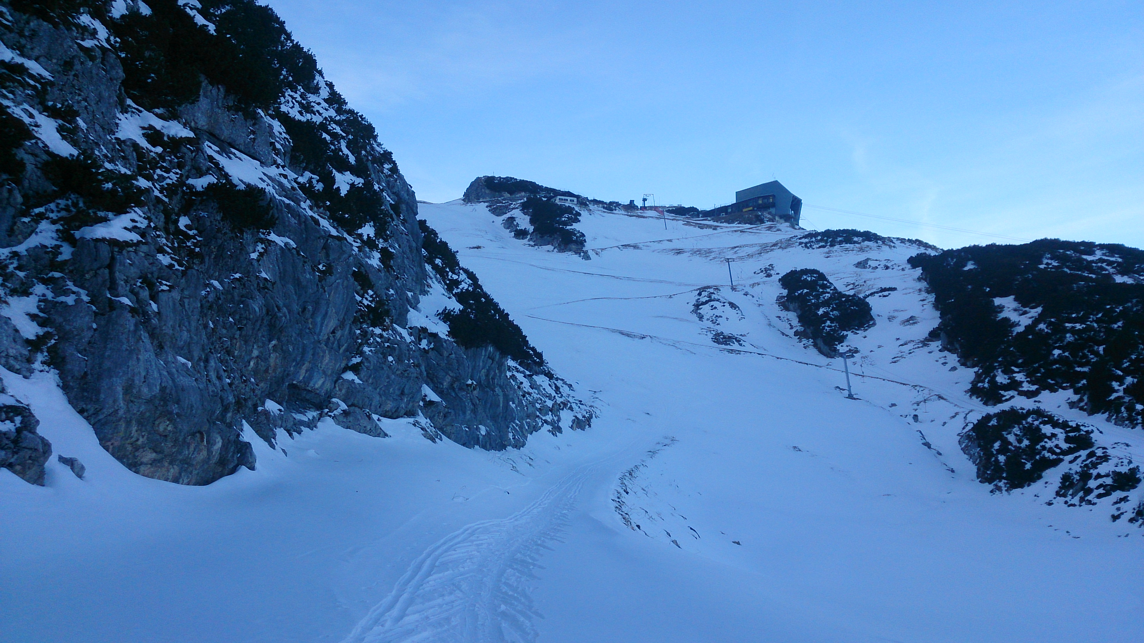 Blick zurück auf die Abfahrt vom Osterfelderkopf - wenig Schnee: