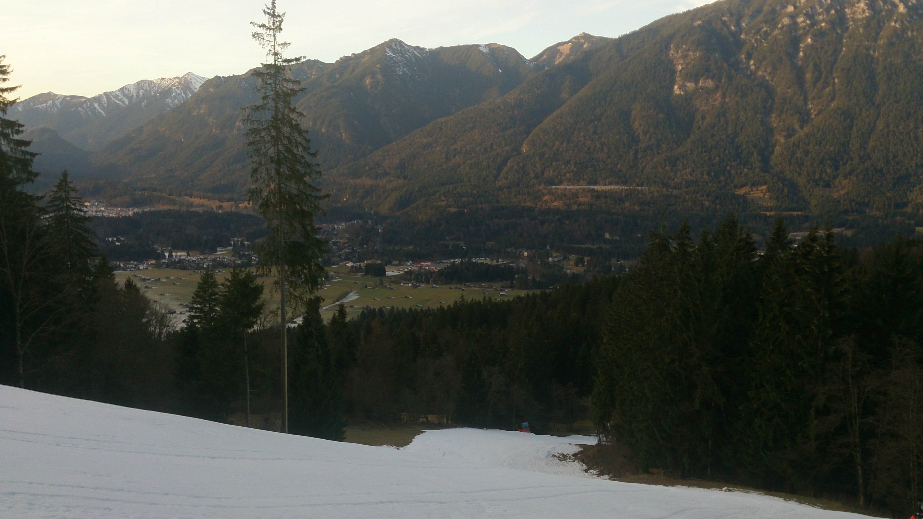 Sonstiges: Nach der gestrigen, wanderlastigen Skiunternehmung wollte ich heute doch den Skicharakter betonen. Von Garmisch ging es zunächst zu Fuß bis auf ca. 920 m, dort auf der Dreh Schneebeginn (darunter nur unterbrochene Kunstschneeinseln). Harscheisen für den Anstieg auf der steilen und die ersten gut 100 Hm nicht präparierten Piste sinnvoll. Ab dem Adamswiesenlift ist Skibetrieb, ich floh deshalb auf den Ziehweg zum Bayernhaus, der hat aber nur die ersten Meter Schnee - also doch besser auf der Piste bleiben. Ab dem schon recht gut geleerten Speicherteich geht es dann problemlos mit Skiern weiter, und nach kurzer Zeit hat man auch den Trubel rund um das derzeitige Skitreiben am Kreuzwankl hinter sich (heute wenig Schnee, viele Leute und der Party-Beschallung kommt man auch nicht aus). Der Hochalmweg hat wenig Schnee, für den Aufstieg geht es, abfahren würde ich da nur mit sehr alten Skiern. Da dieser in der Sonne liegt, wird das wohl auch eher schlechter. Oberhalb der Hochalm dann wie immer landschaftlich sehr schön aber wenig Schnee, allerdings keinen Steinkontakt. Der Hang beim Osterfelderkopflift ist noch nicht durchgehend verschneit, mit etwas Vorsicht ging es aber herauf und herab. Um das ganze abzurunden, ging es danach noch auf den Längenfelder (oben extrem wenig Schnee, weiter unten recht passabel) und das Kreuzjoch (Ziehweg gut). Im Kreuzeck-/Hexenkesselgebiet wurde schon fleißig geschoben, da dürfte der Skibetrieb wahrscheinlich bald losgehen, die Kunstschneelage gibt das auch her. Die Talabfahrt habe ich über die Olympia gemacht, bis zur Talstation des Kandahar-Expresses recht gut, danach komplett vereist oder gleich blankes Eis! War mit den Steinski selbst zum Abrutschen kaum zu kontrollieren. Vorsicht, wer hier zügig unterwegs ist macht unter Umständen einen Abflug. Das wird erst besser, wenn präpariert wird. Die letzten ca. 150 Hm gibt es dann nur noch unterbrochene, sehr harte Kunstschneeinseln. Kandahar geht ebenfalls nicht herunter, Horn sowieso nicht.
