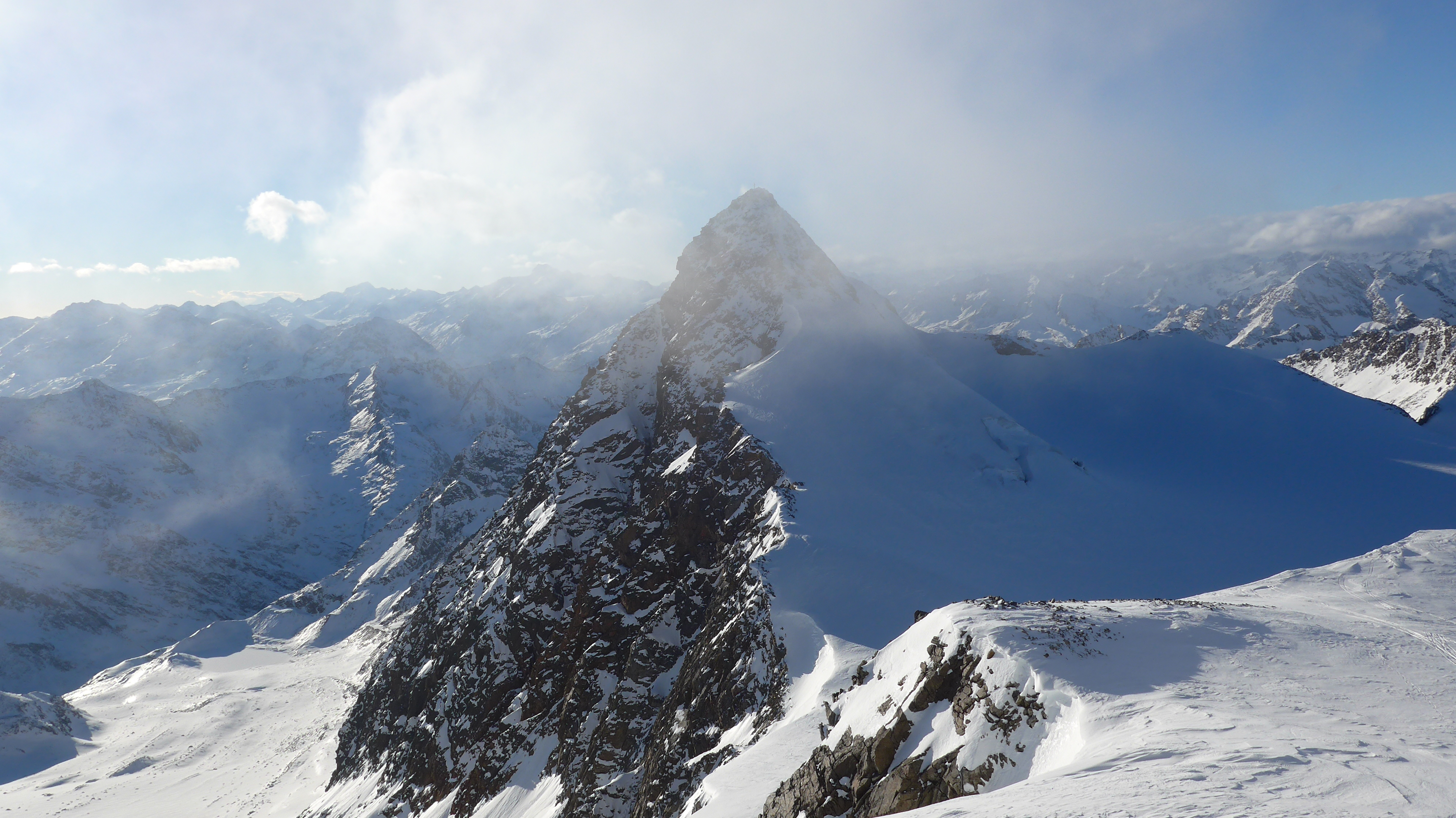 Tourenverhältnisse: Querung nach Ost. Abfahrt über Gaiskarferner am Schlepplift vorbei auf 2800 m. Aufstieg über Pfaffenferner zum Pfaffenjoch.