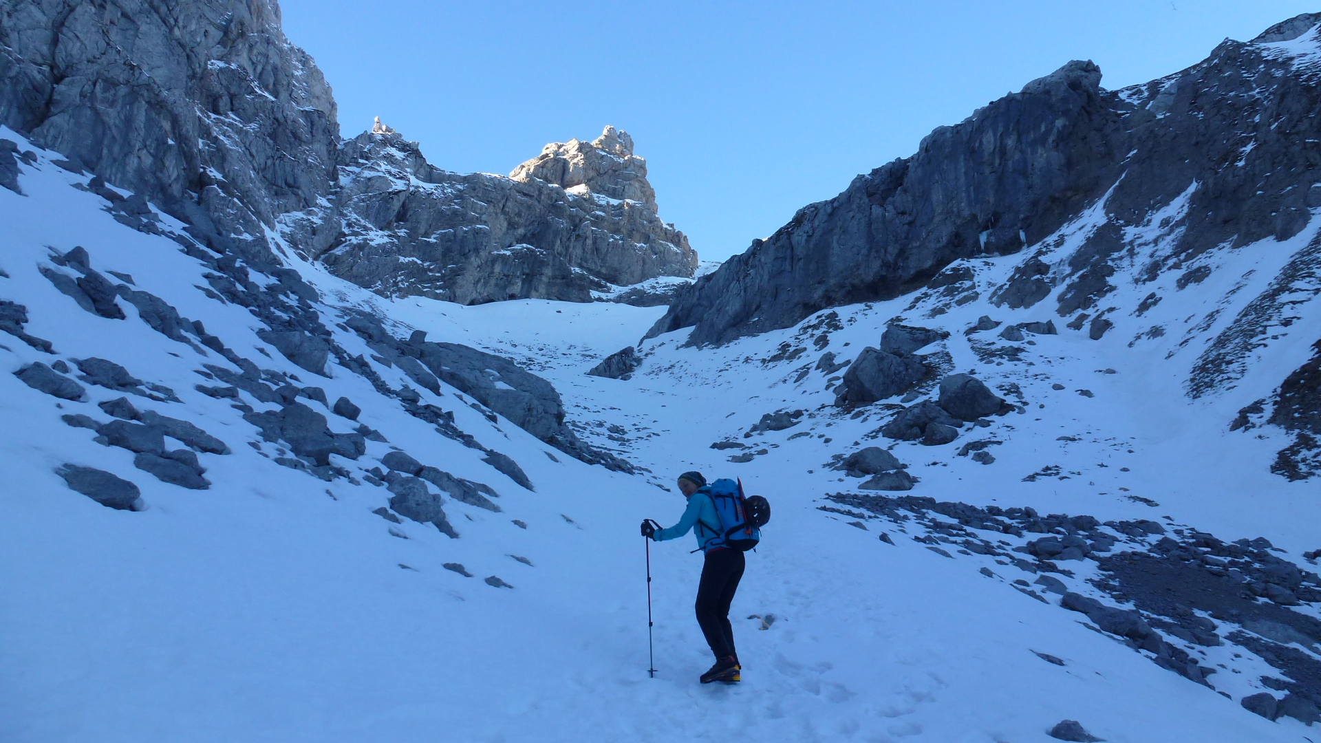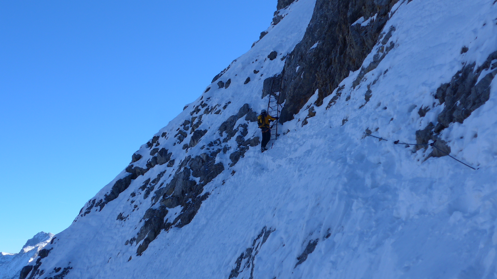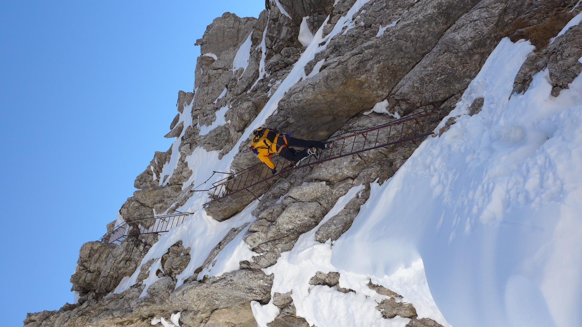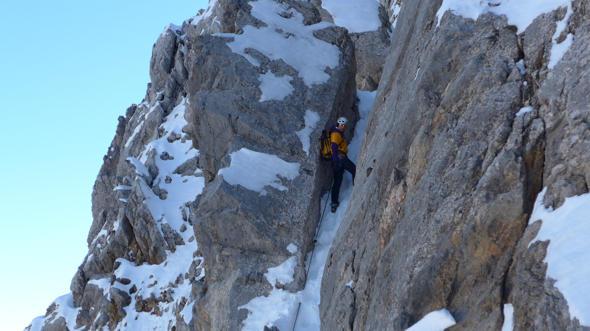 Steile Querung an der Sulzleklammspitze mit viel Schnee + relativ guter Spur + Seil meist eingeschneit.