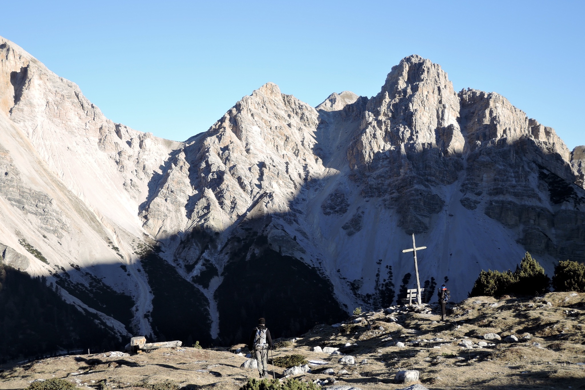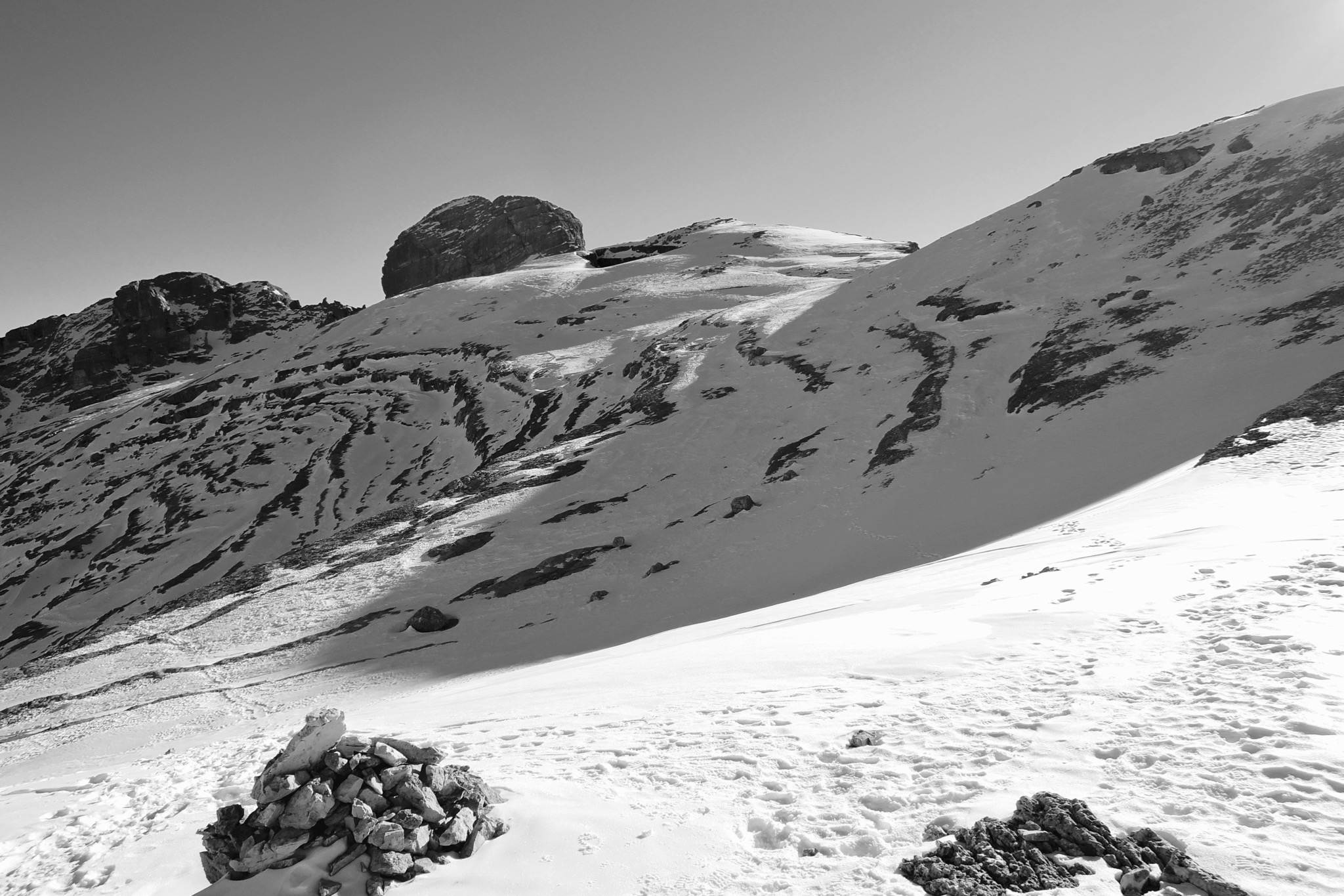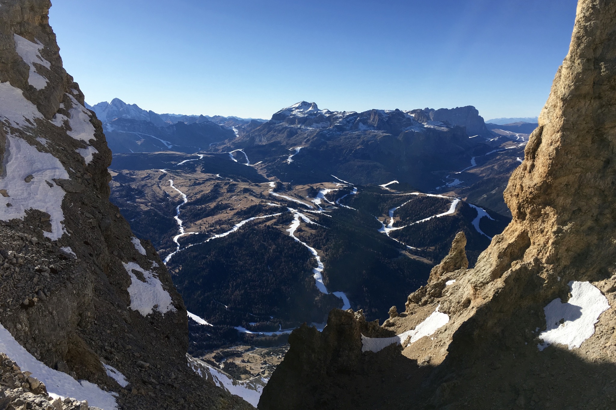 Tourenverhältnisse: Sonnseitig völlig aper, schattseitig Schneereste vom Oktober. Piz Lavarela wurde auch gemacht (Aufstieg von der Lavarelascharte, Abstieg mit Steigeisen nach Norden)