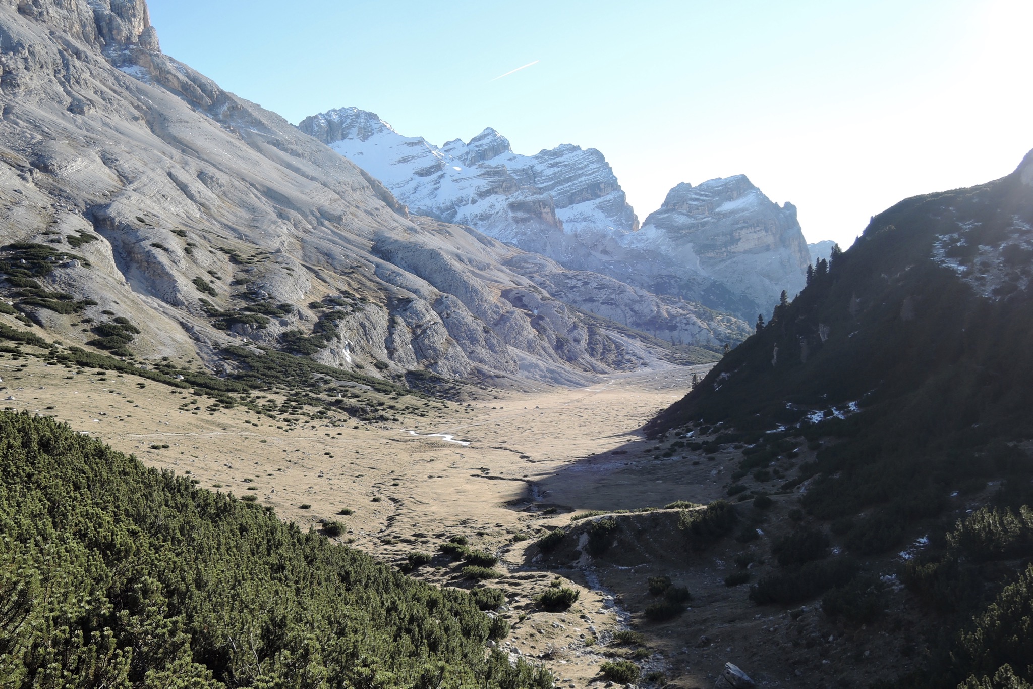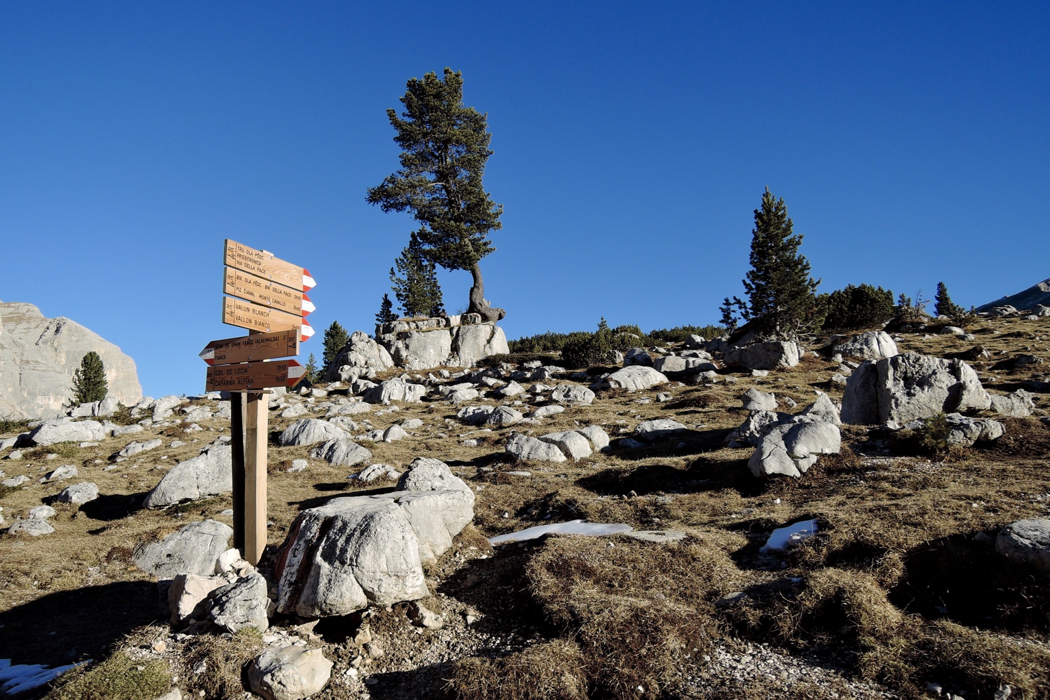 Sonstiges: Von der Lavarellahütte (2050m) Richtung O an der Faneshütte (2060m) oberhalb vorbei auf dem Dolomiten Höhenweg (11) aufs Limojoch (2180m) hinauf. Am ausgetrockneten Limosee (2160m) vorbei in Richtung S zur Ücia de Gran Fanes (2100m). Von dort weiter auf dem Dolomiten Höhenweg (11) Richtung SW an hausgroßen Blöcken eines Felssturzes auf der Südseite des Tals vorbei. Kurz vor dem Ju da l’Ega (2157m) rechts auf den Pfad durch die Latschen Richtung W nach Busc da Stlü. Auf dem weiß-rot markierten Weg rechter Hand des felsigen Tales am Cunturinessee vorbei Richtung WSW hinauf zur Lavarelascharte (2900m) mit Blick auf Piz Vernel, Piz Boé und Langkofel.