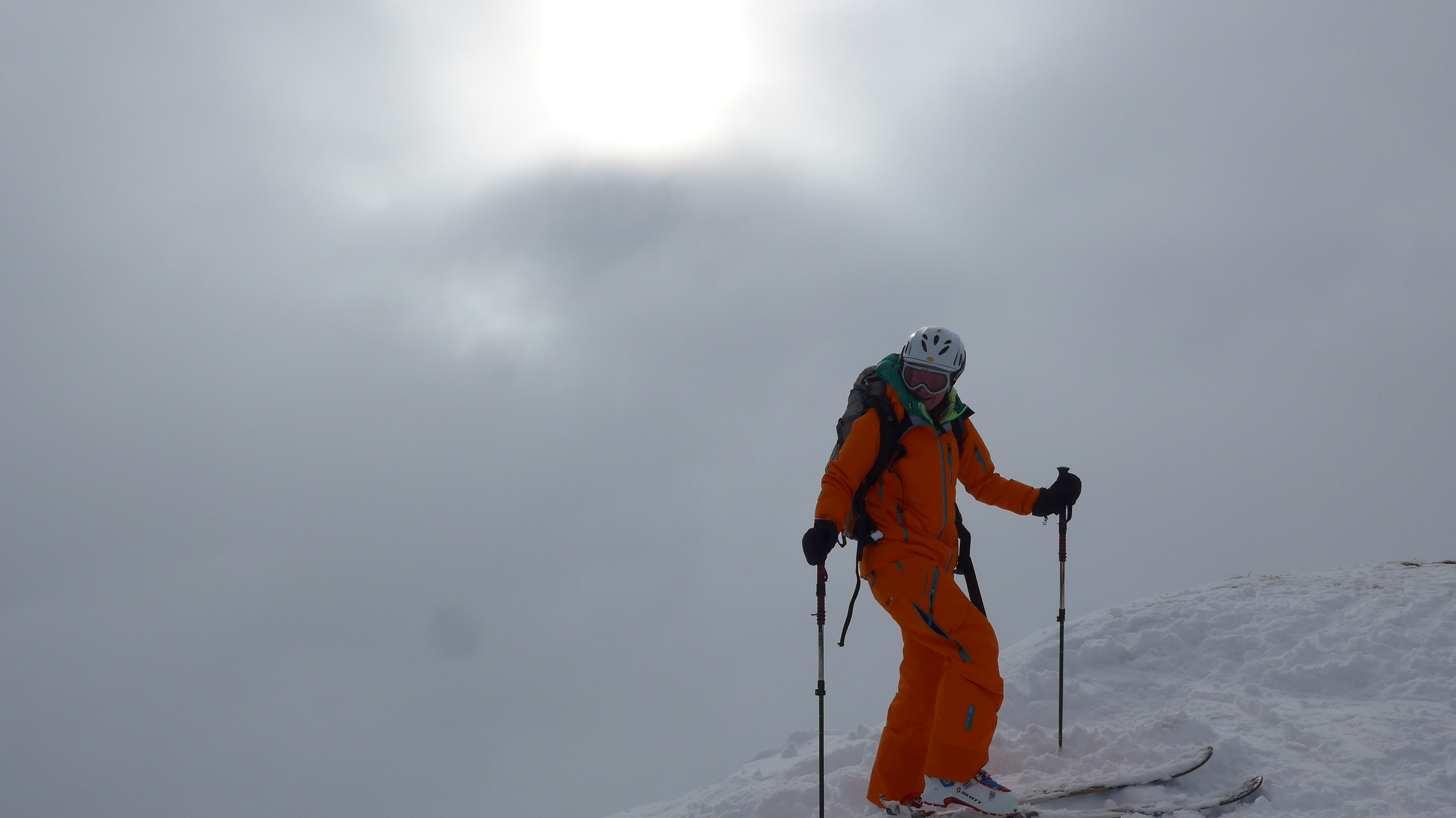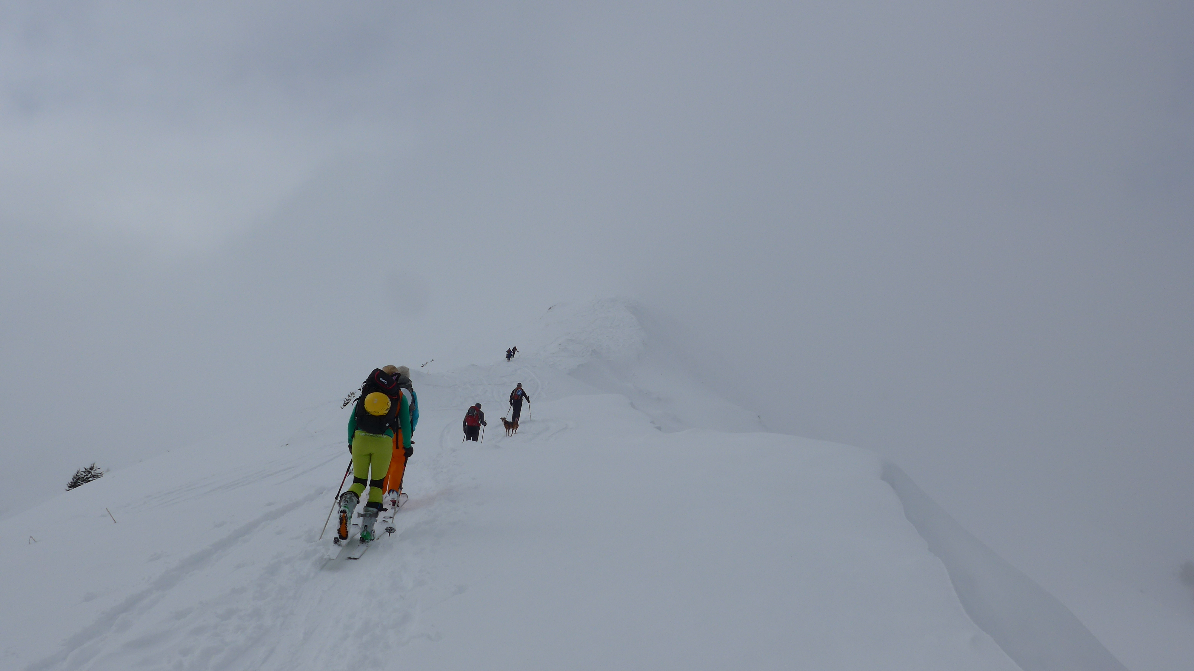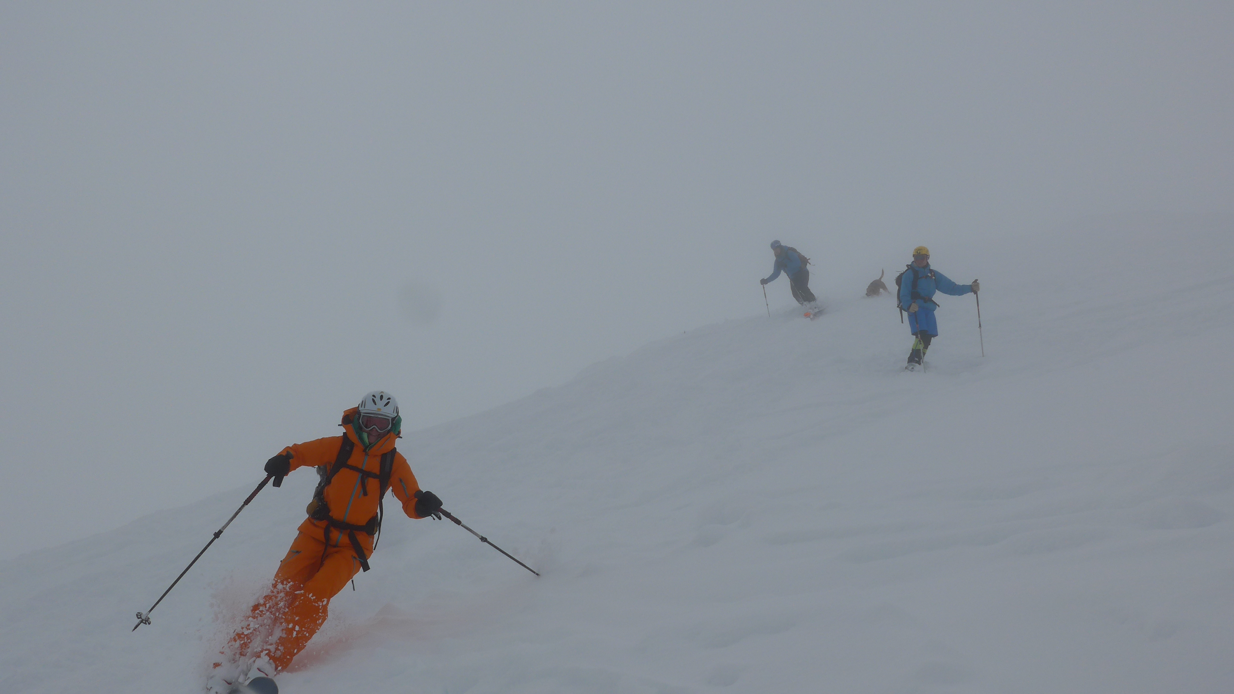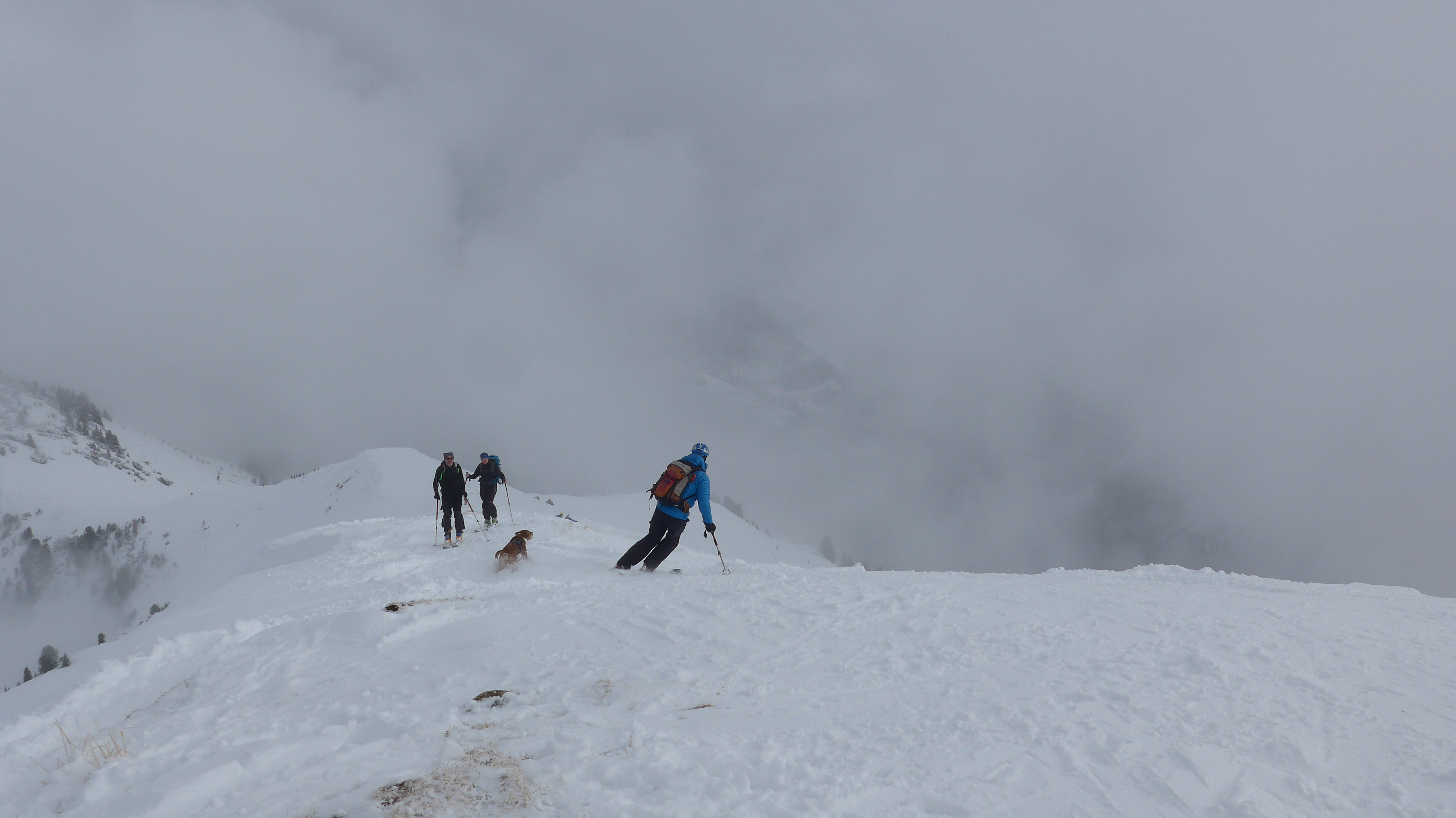 Eigentlich hatten wir noch vor, den Rainberg nebenan einen Besuch abzustatten, doch es zog zu. So fegten wir lieber die ersten 300 Hm Abfahrt bei halbwegs guter Sicht hinunter.