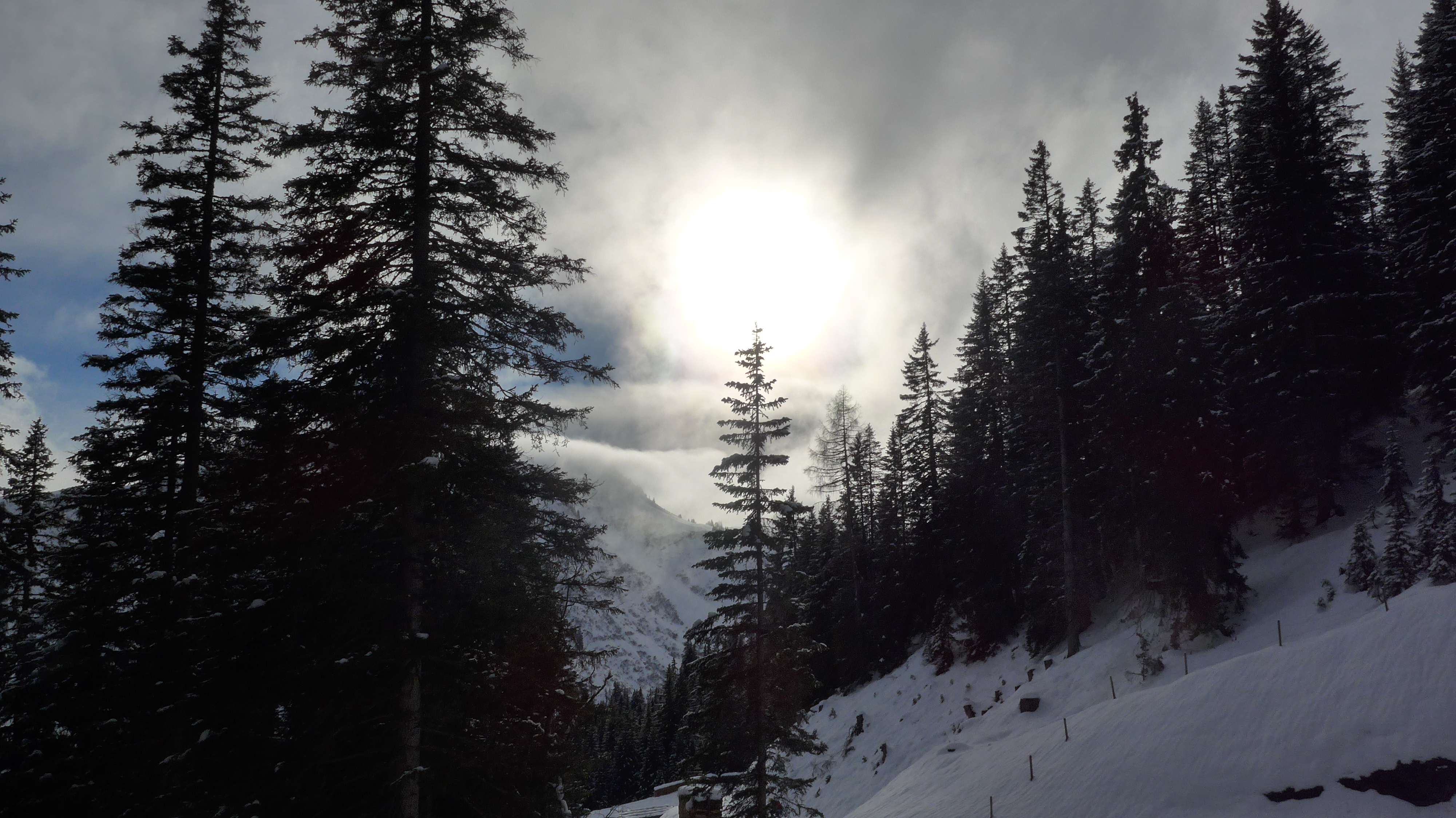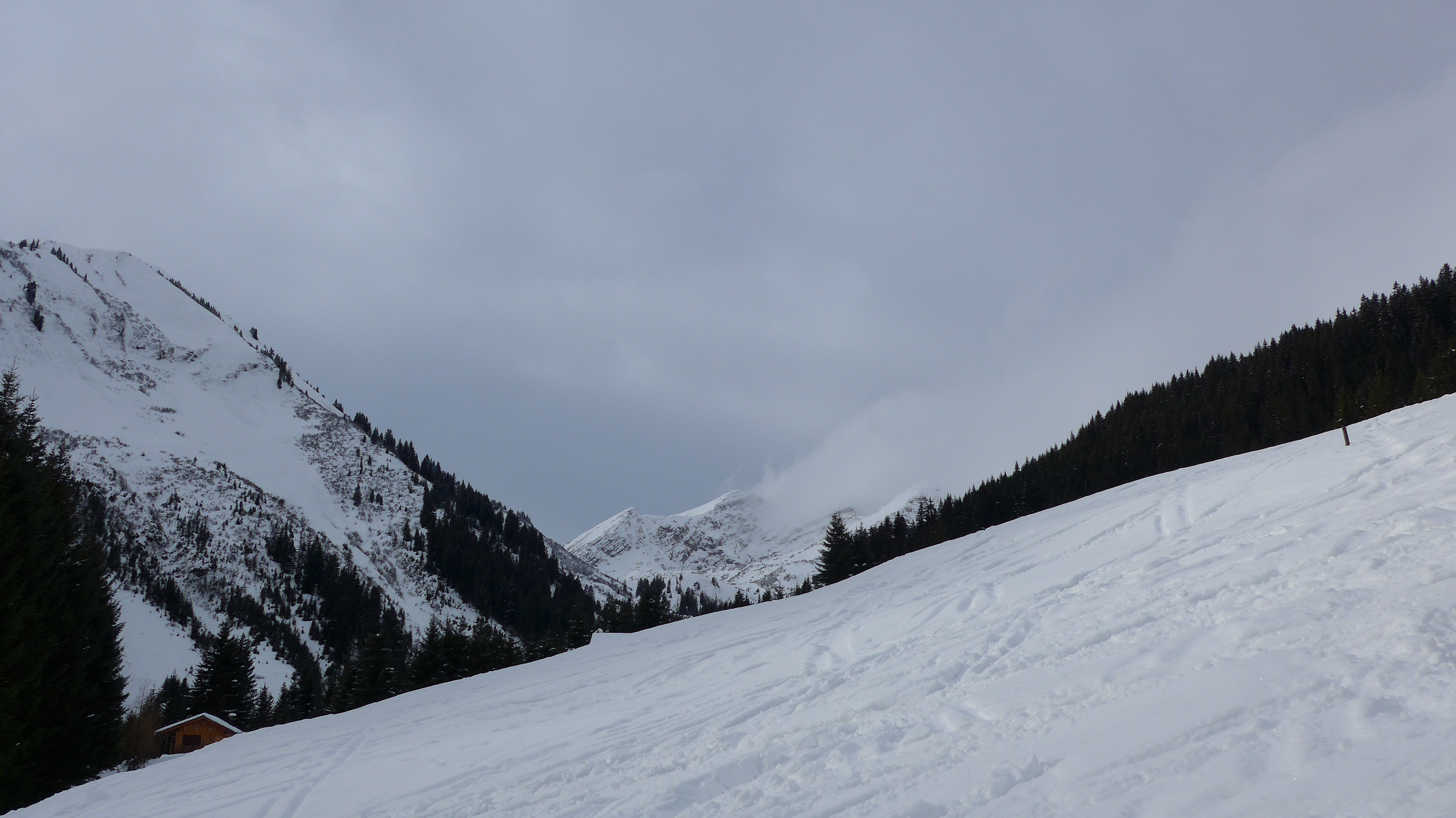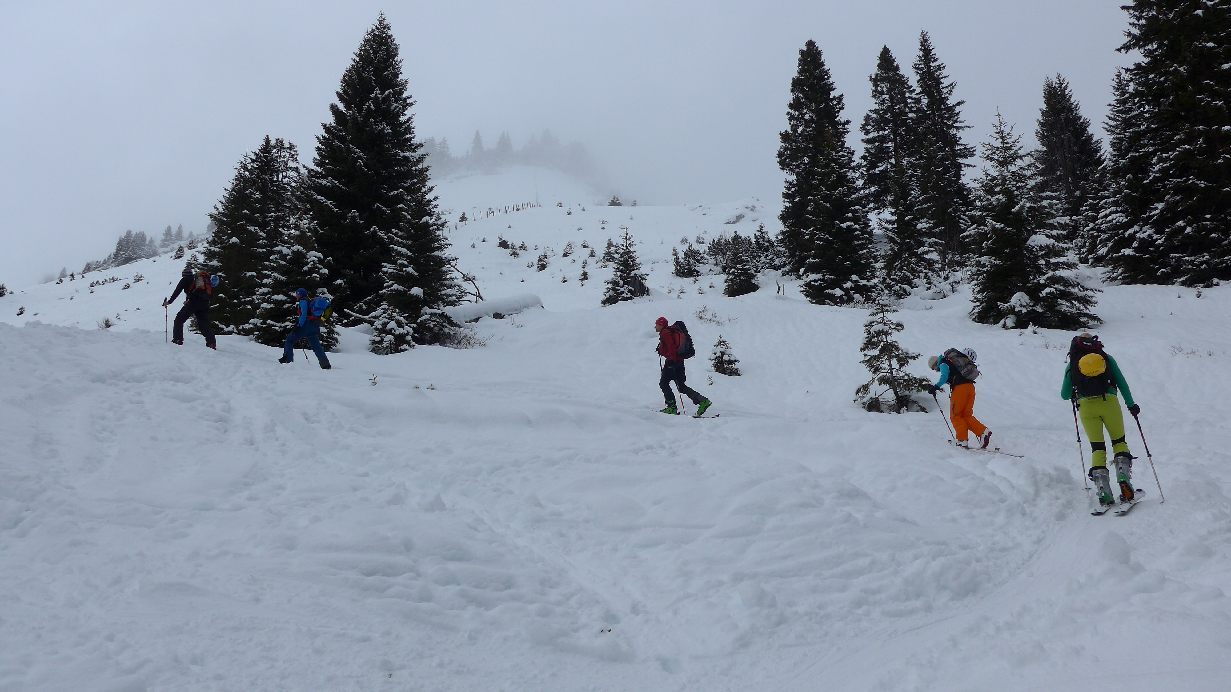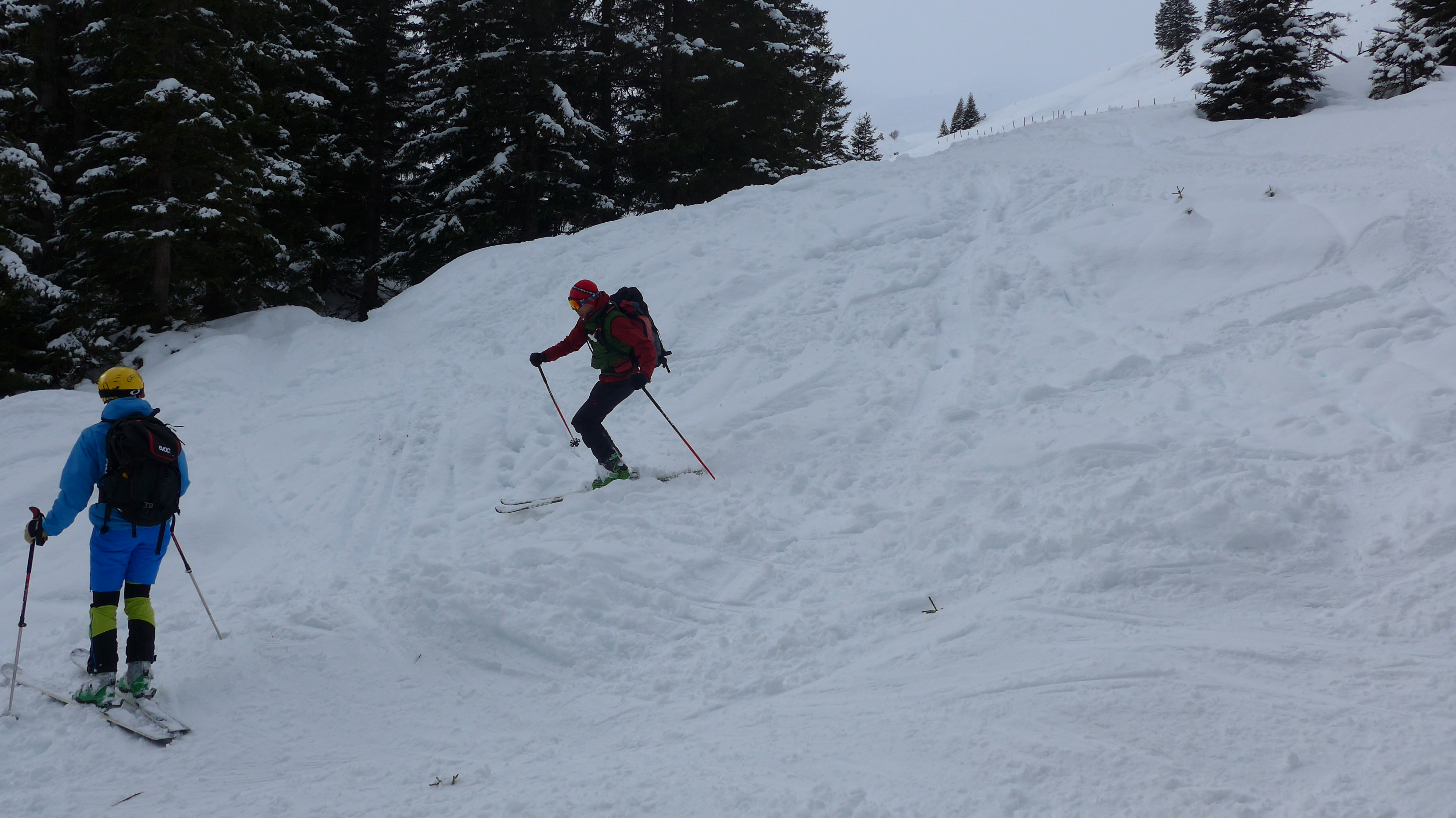 Eigentlich hatten wir noch vor, den Rainberg nebenan einen Besuch abzustatten, doch es zog zu. So fegten wir lieber die ersten 300 Hm Abfahrt bei halbwegs guter Sicht hinunter.