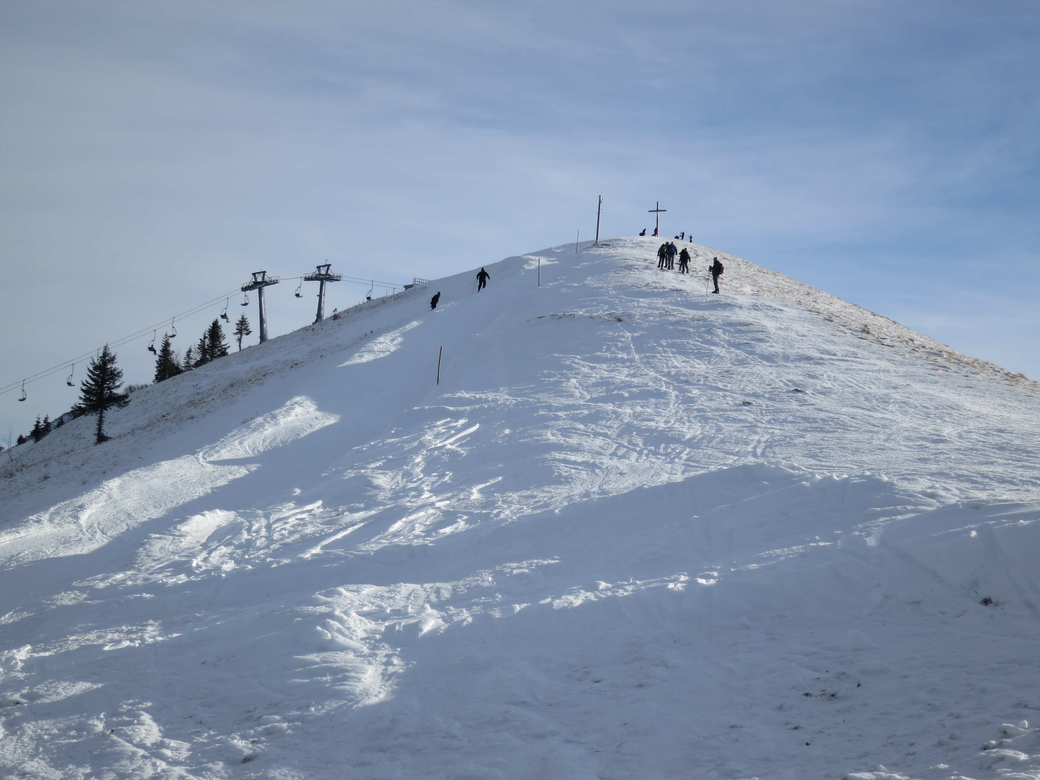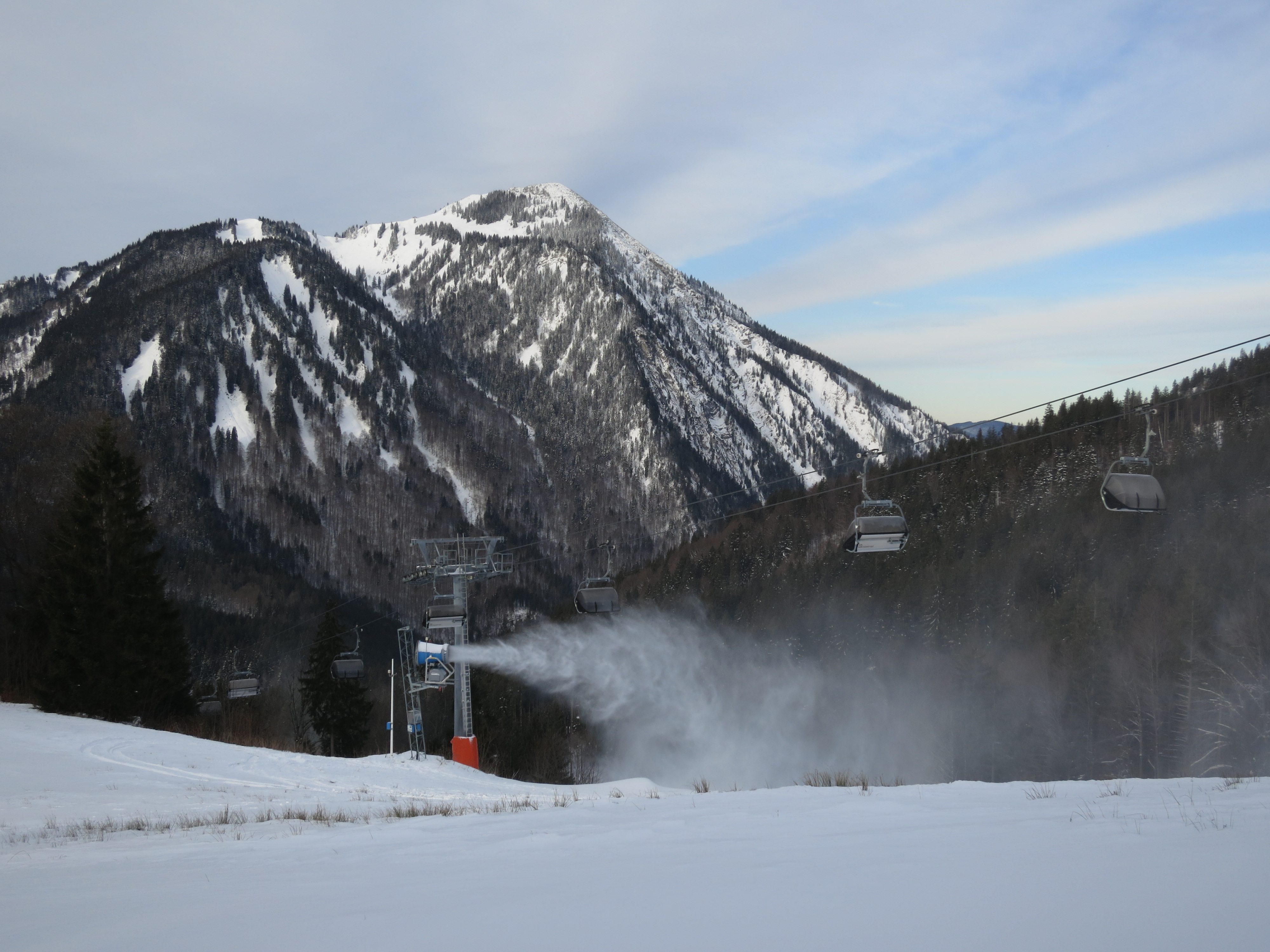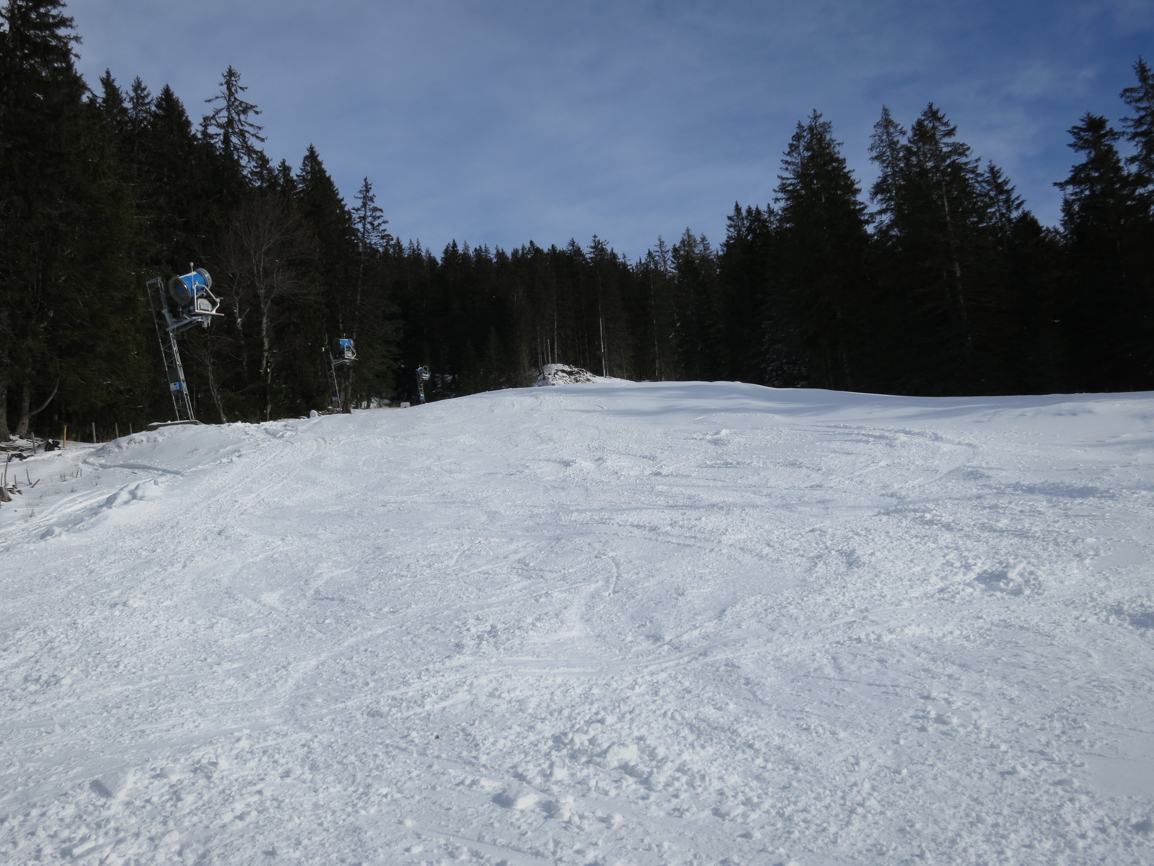 Tourenverhältnisse: Aufstieg teils auf, teils neben der Piste problemlos möglich. Die Schneekanonen liefen auf Hochtouren. Abfahrt auf unpräparierter - aber bereits eingefahrener - Piste gut und ohne Steinkontakt möglich. Heute viele Tourengeher unterwegs.