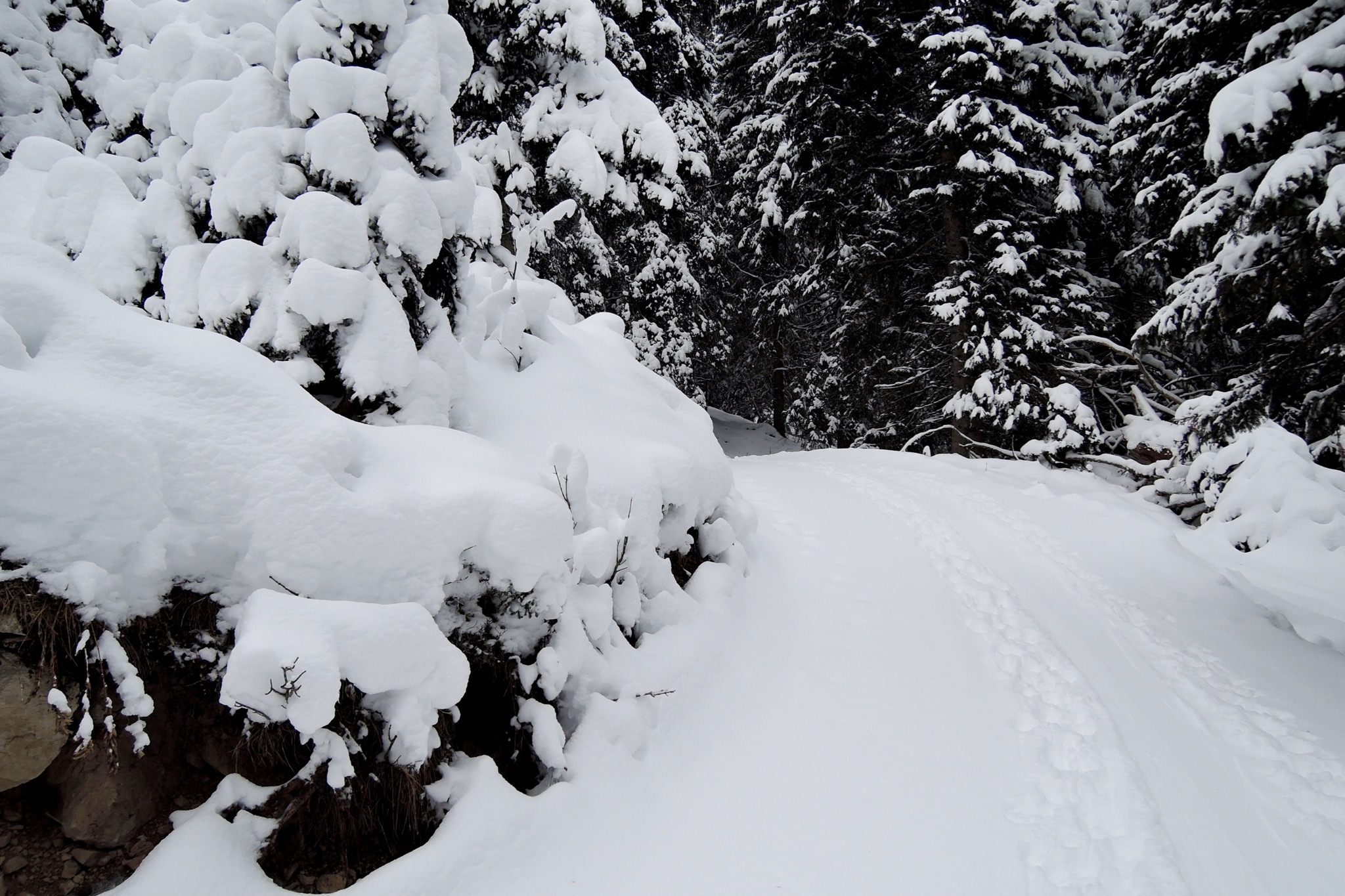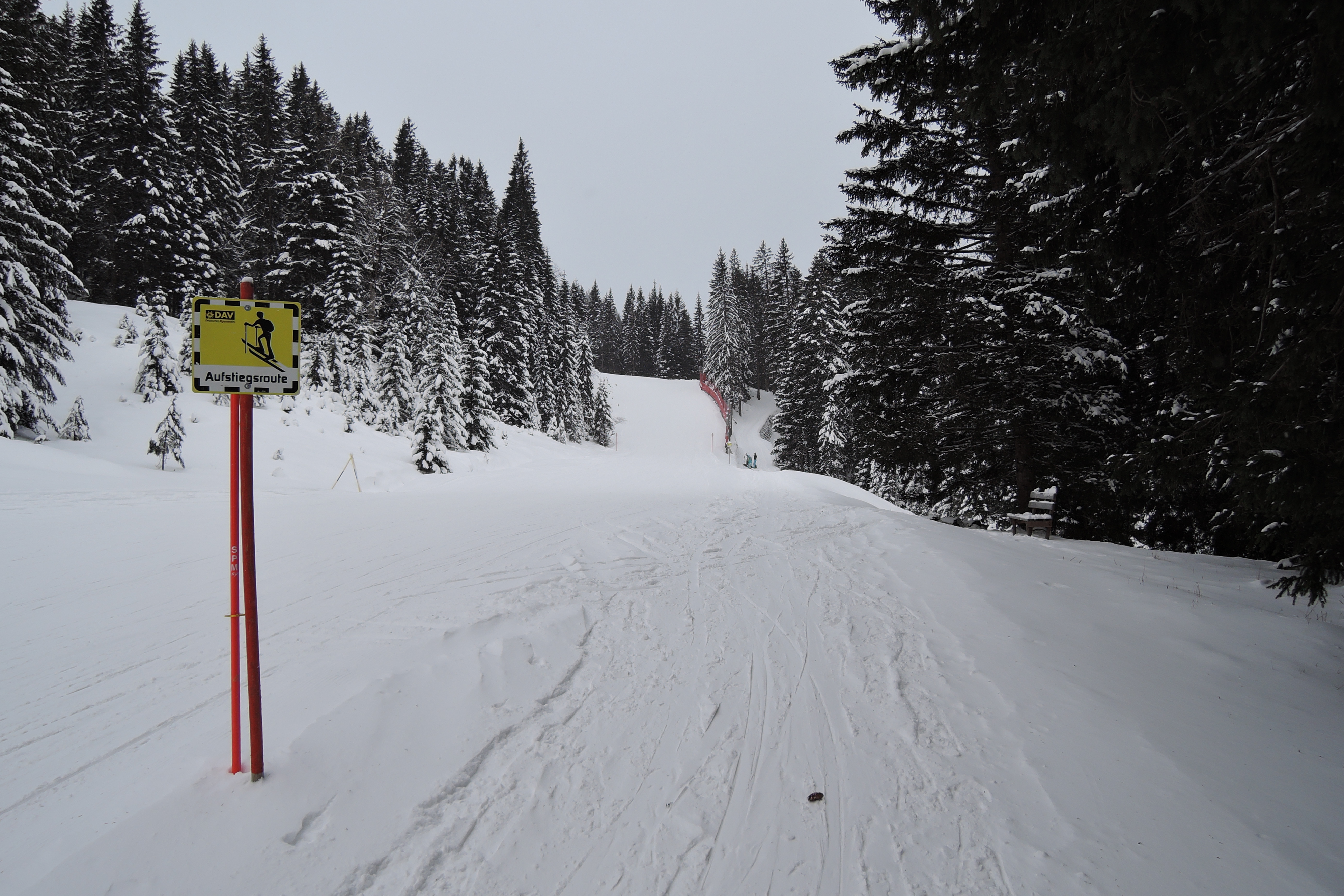 Tourenverhältnisse: Im Tal 10cm, ab 1000m dann 20cm Neuschnee, im Wald – von Lichtungen abgesehen – noch praktisch nix