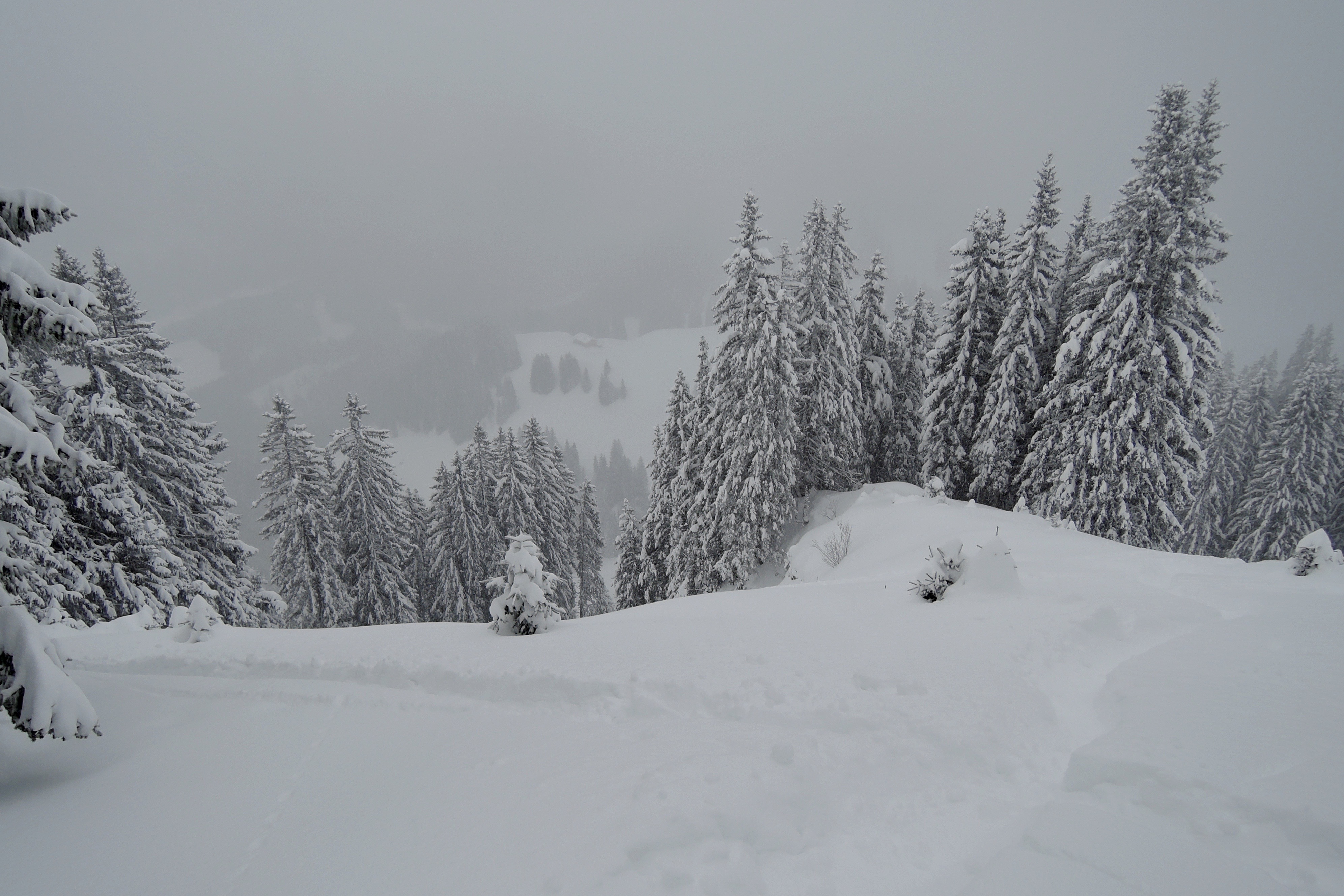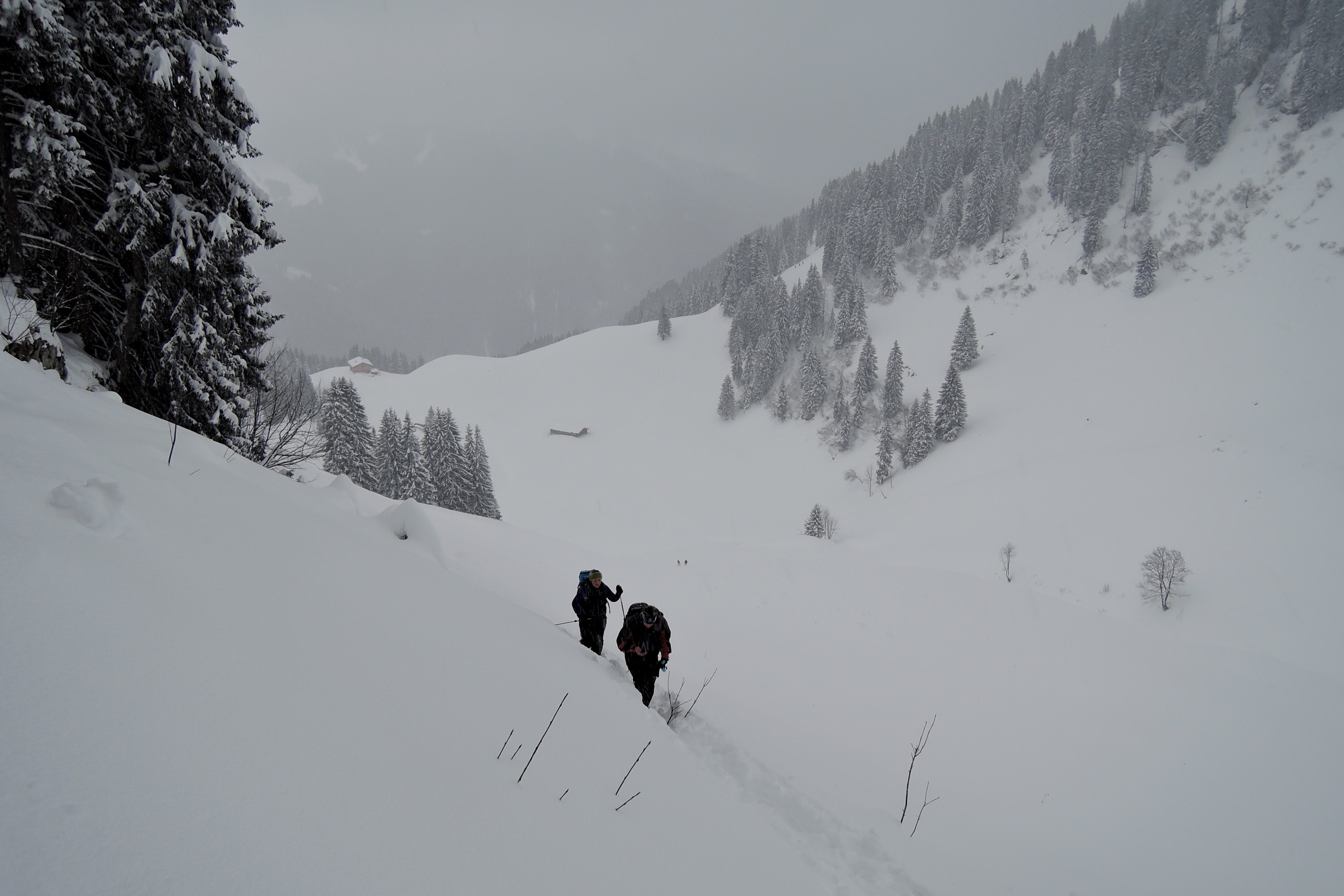 Tourenverhältnisse: Unten bereits 25cm cm Neuschnee, weiter oben in Lee noch mehr. In Luv jedoch Rücken abgeblasen.