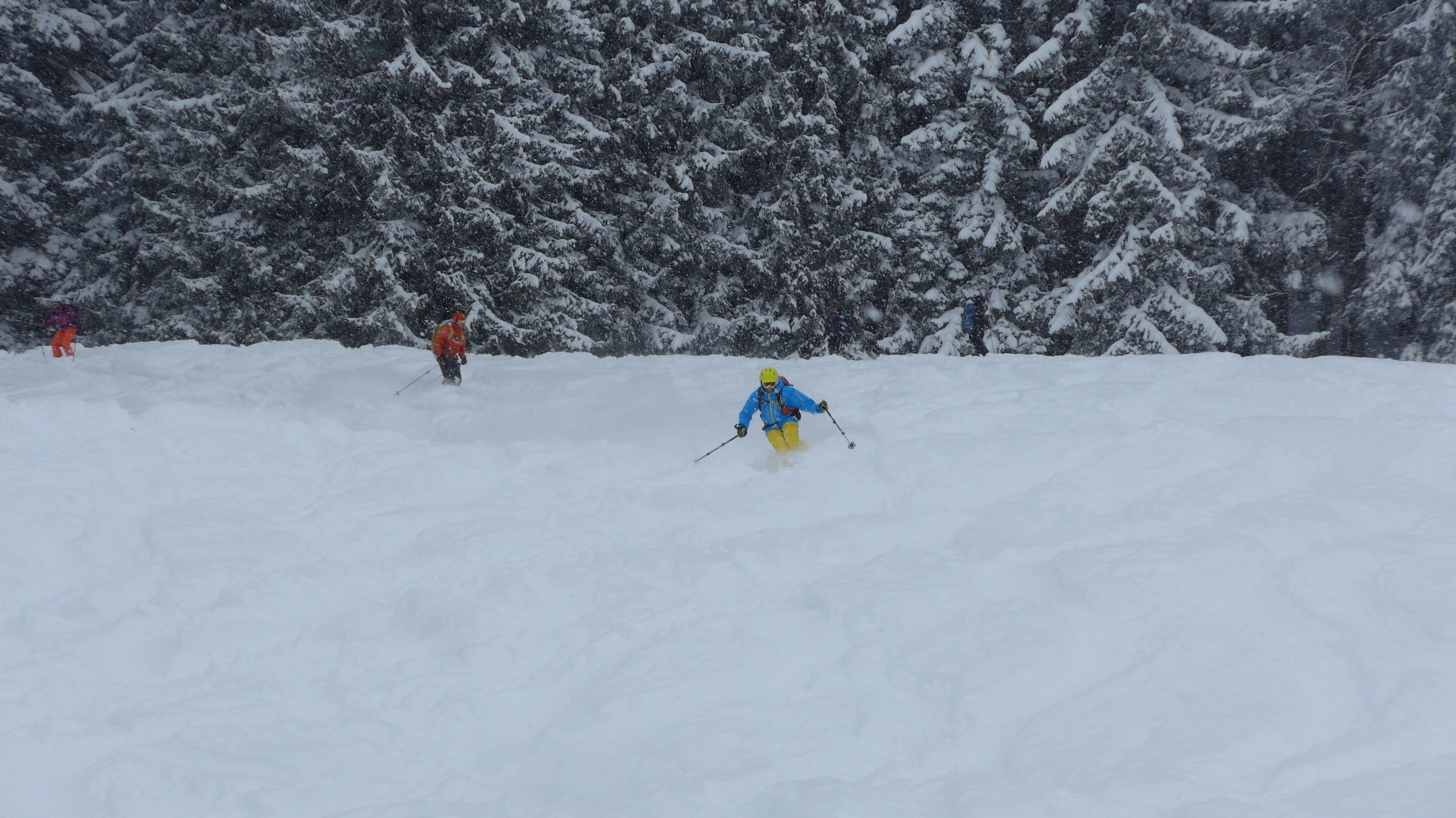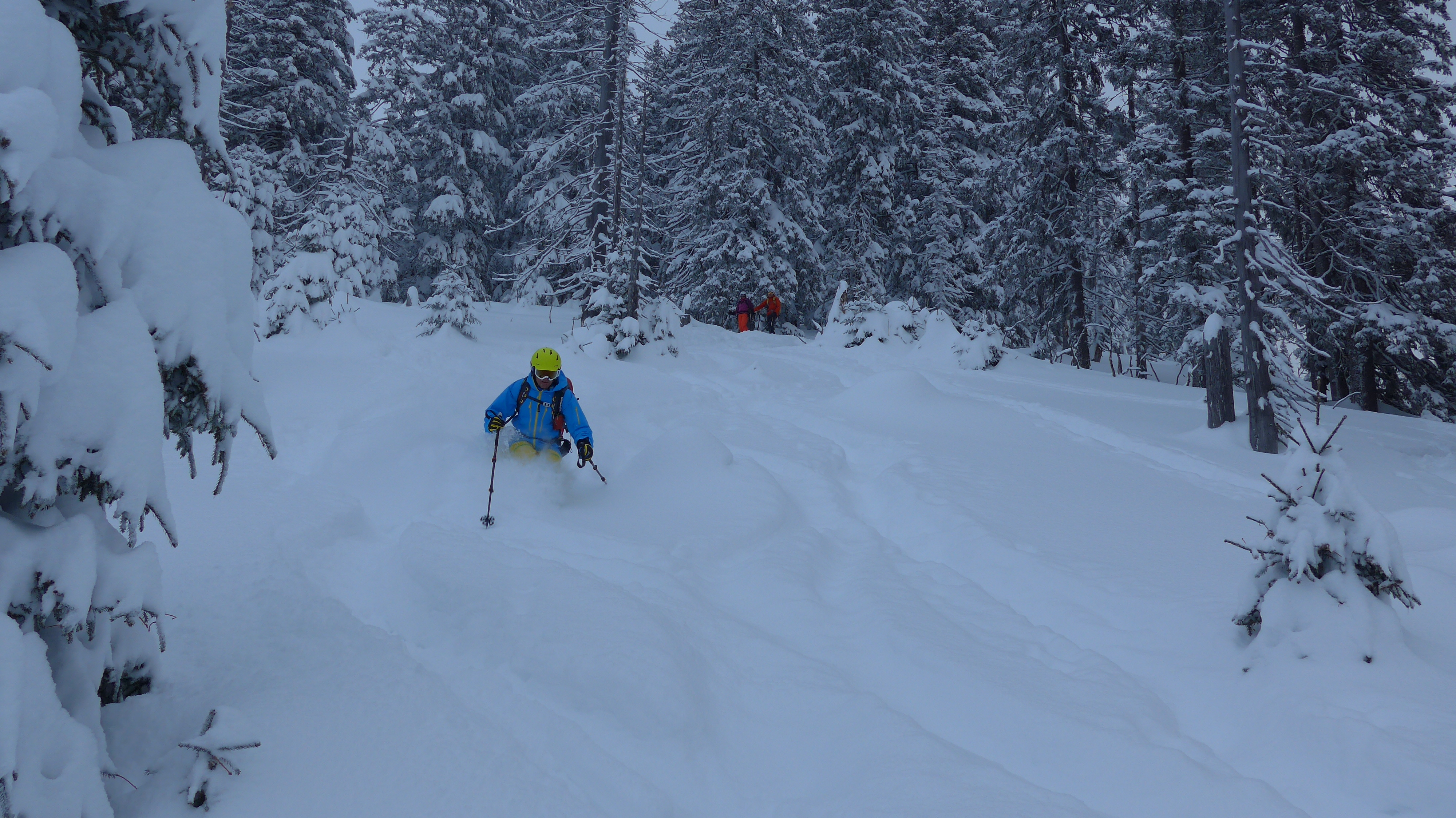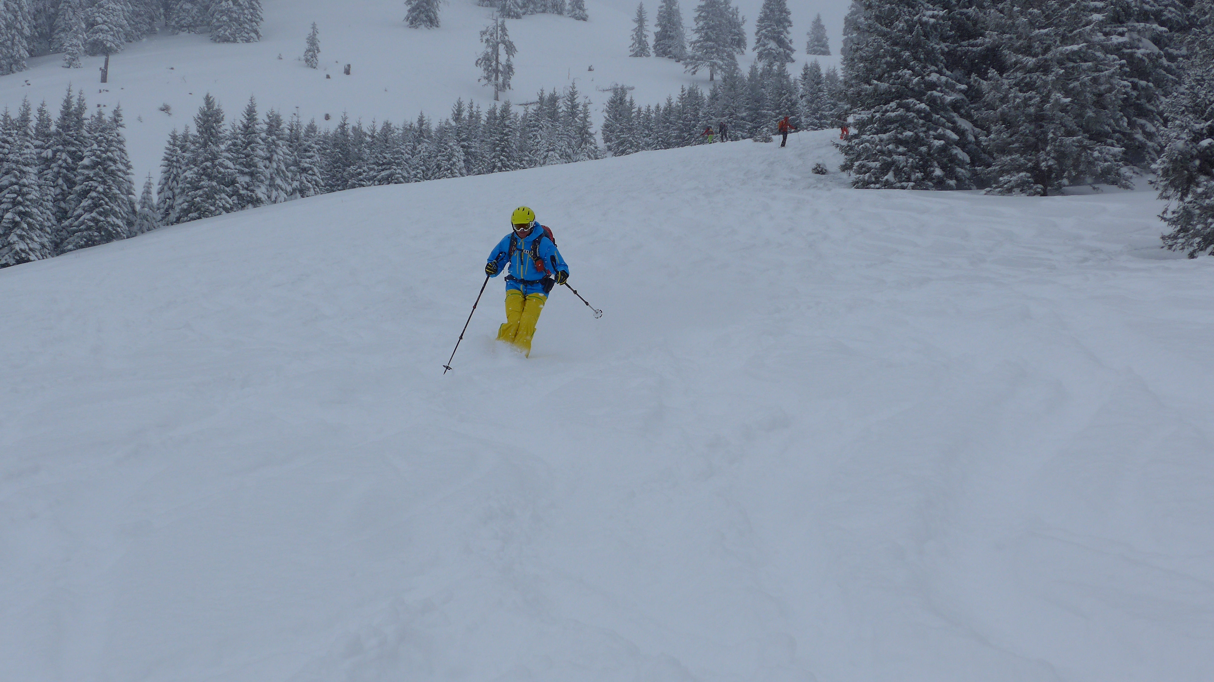 2. Abfahrt nahe der östlichen Aufstiegsvariante durch lichten Wald (unverspurt). Normalabfahrt verspurt, trotzdem fluffig.