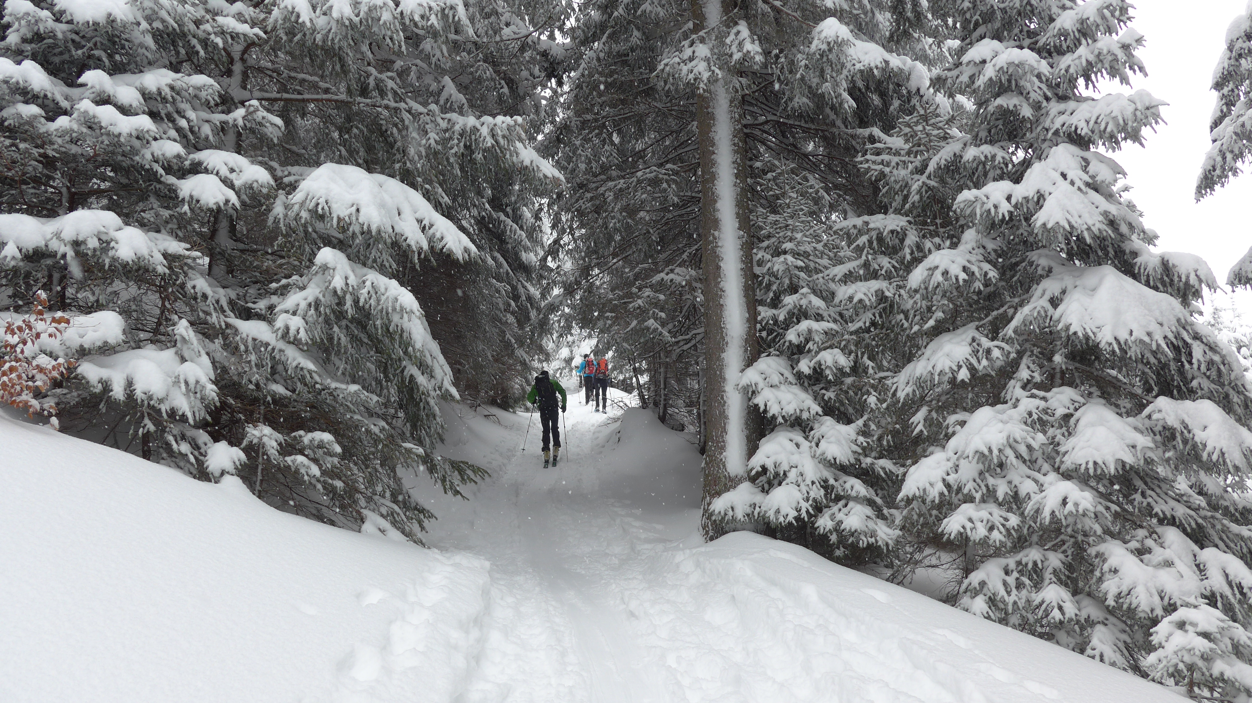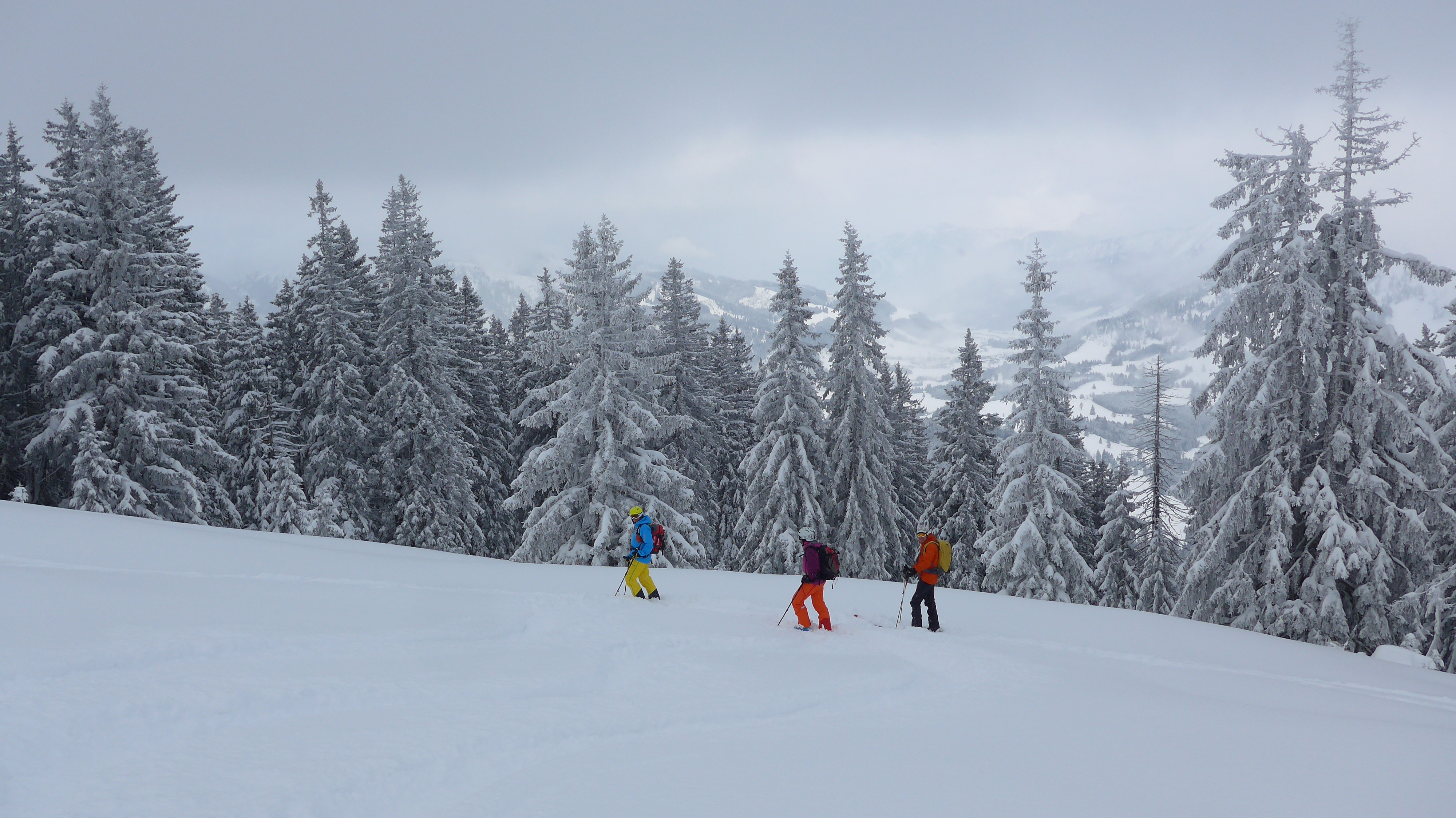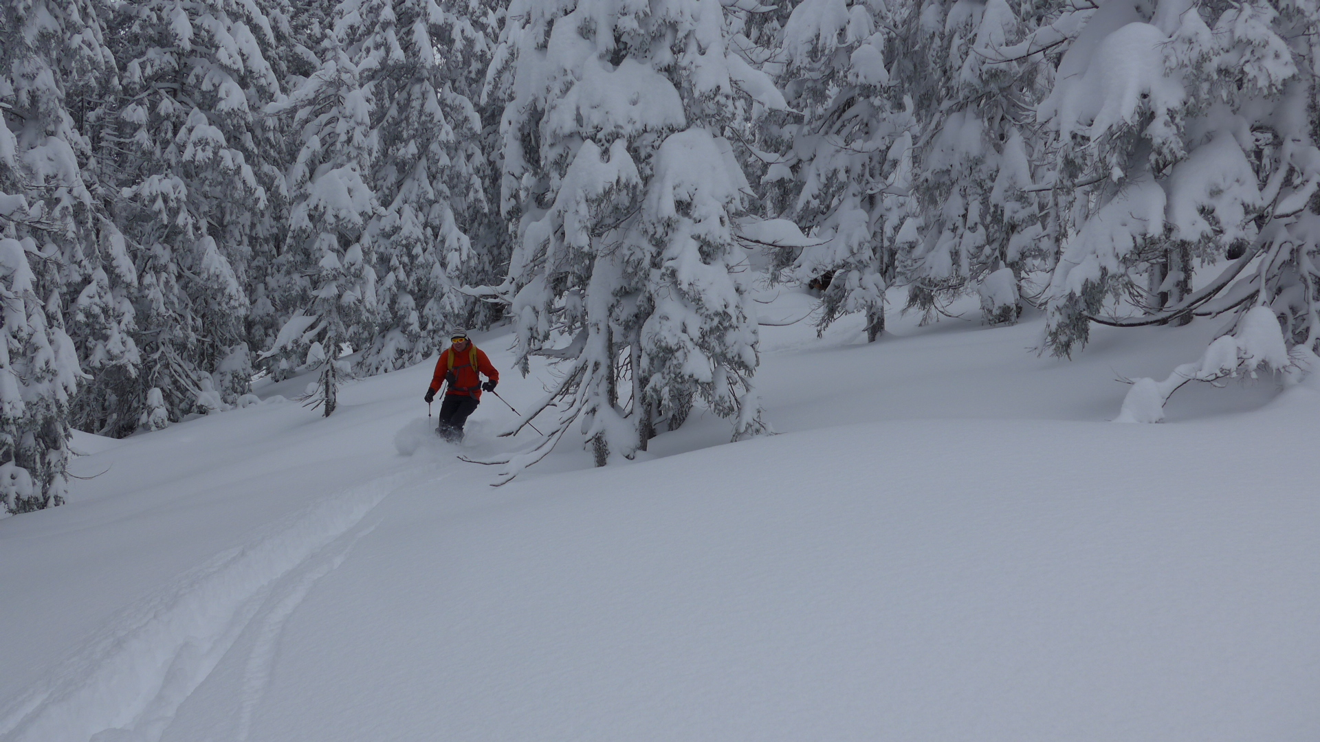 2. Abfahrt nahe der östlichen Aufstiegsvariante durch lichten Wald (unverspurt). Normalabfahrt verspurt, trotzdem fluffig.