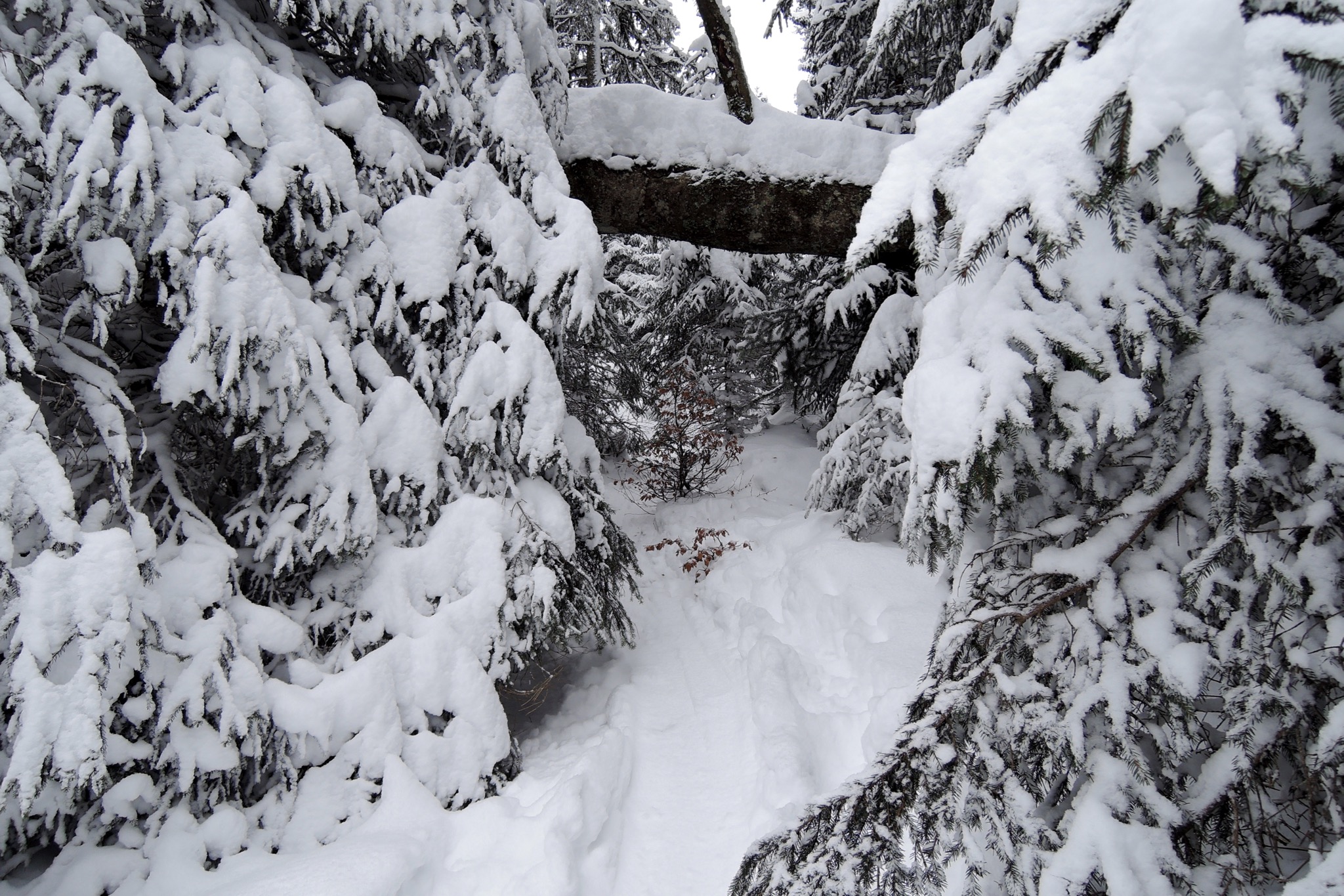 Sonstiges: Am Mittag vom PP Hausbergbahn (710m) Richtung Horn-Abfahrt und weiter über die Skiroute Standard-Tonihütte Richtung Tonihütte. Auf 1140m, statt links der Standard-Tonihütten-Abfahrt hinauf zu folgen, den Steig geradeaus in den Wald hinein Richtung Olympiaabfahrt genommen. Auf 1240m statt halbrechts zur Piste scharf links Richtung SO weiter in den Wald, teils steil hinauf, ab 1320m Richtung S drehend bis man letztlich kurz vor der Trögelhütte (1436m) wieder die Skiroute erreicht. Bei zunehmend schlechterer Sicht weiter den oberen Skiweg zur zünftigen Kreuzalm (1600m).