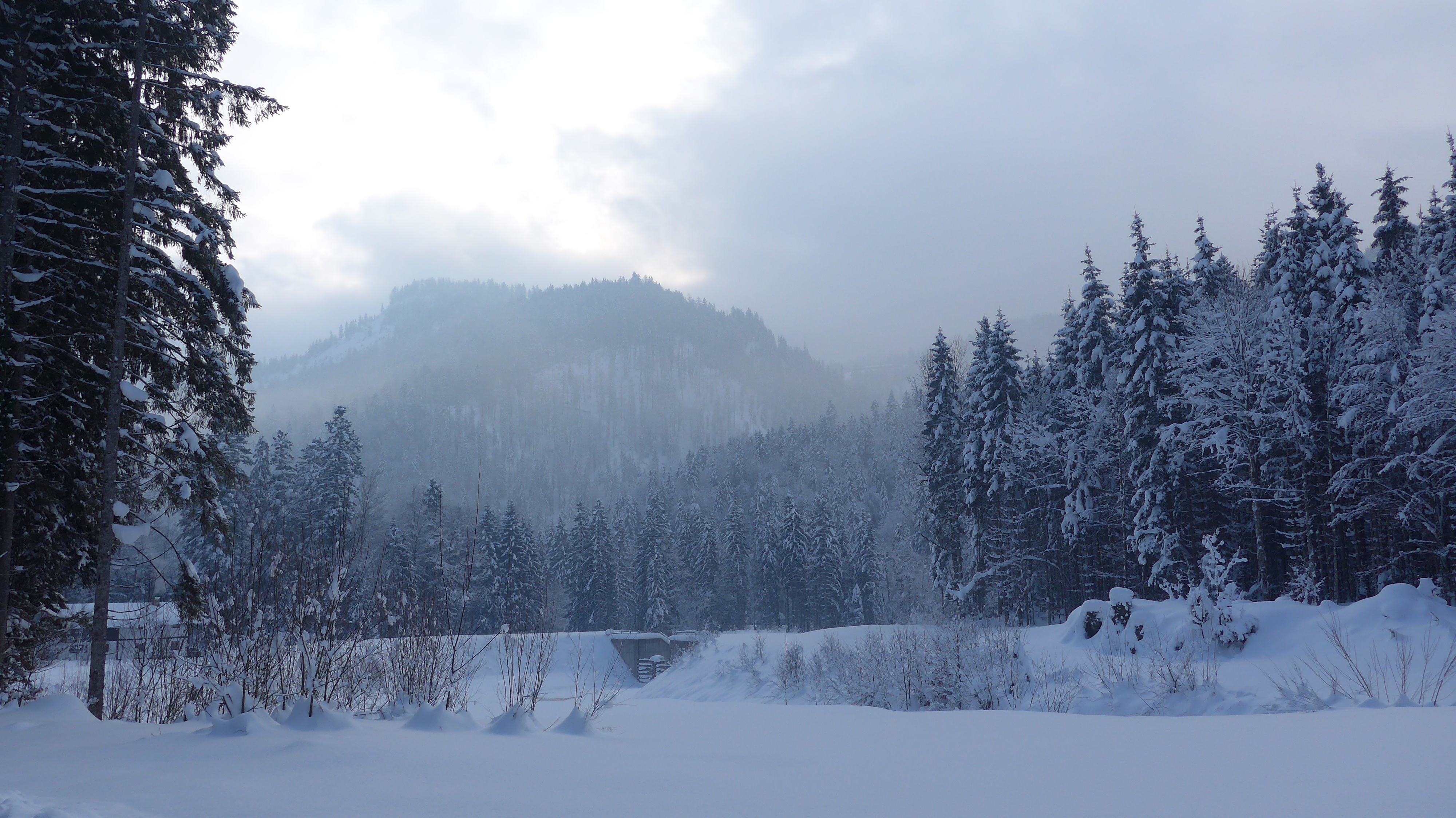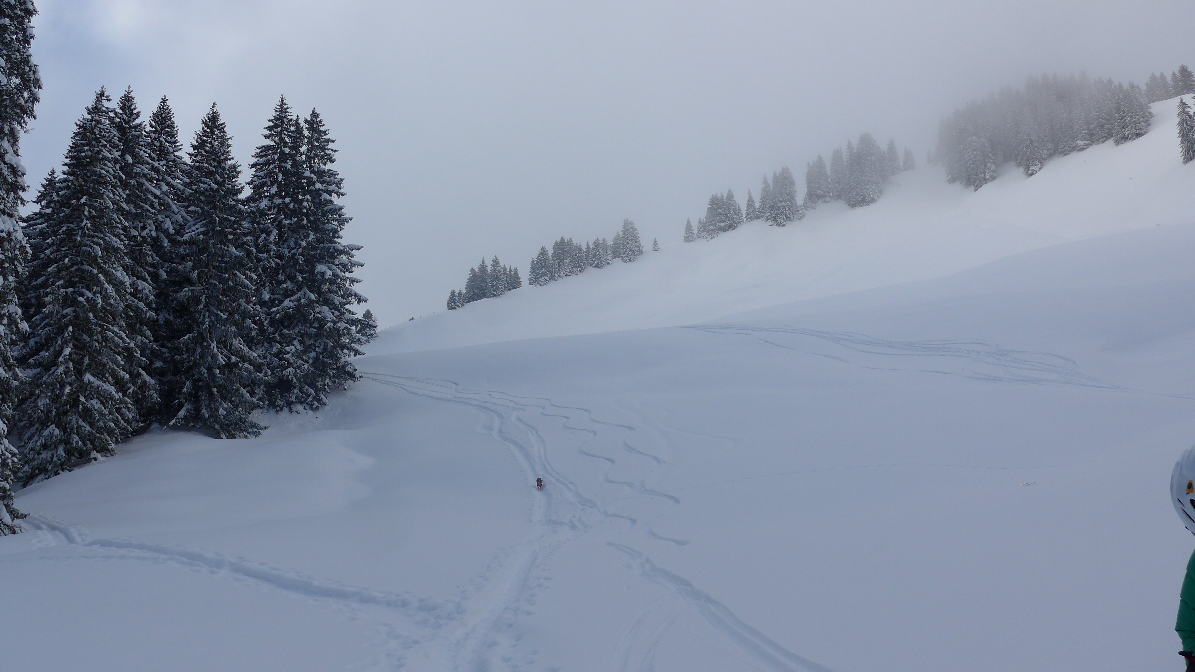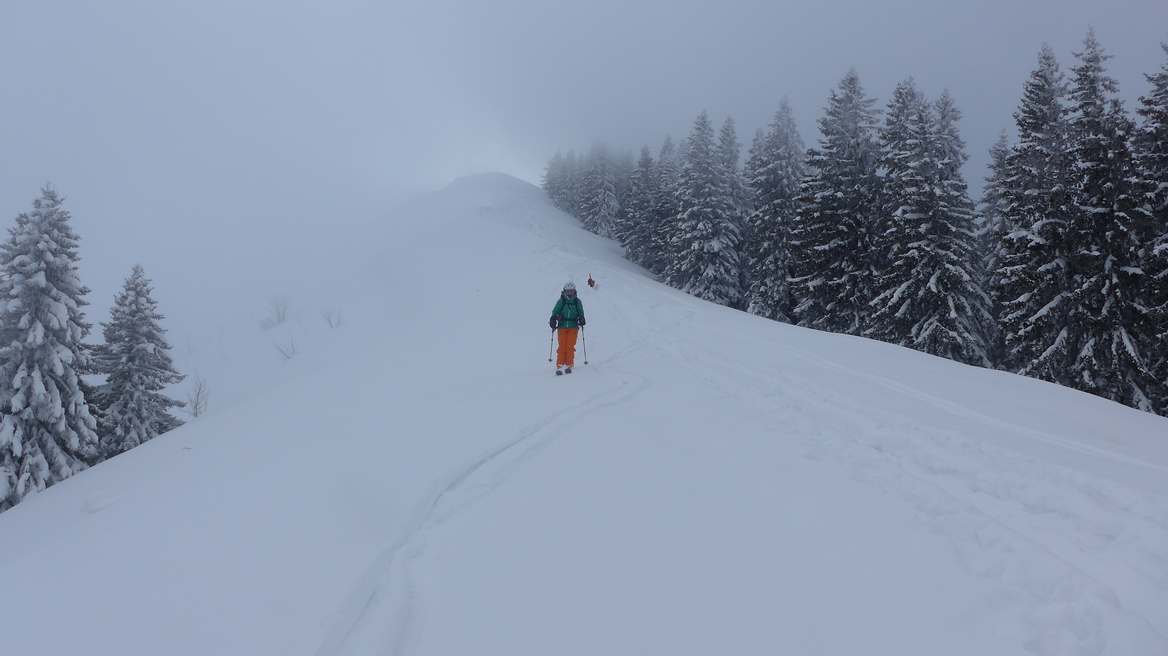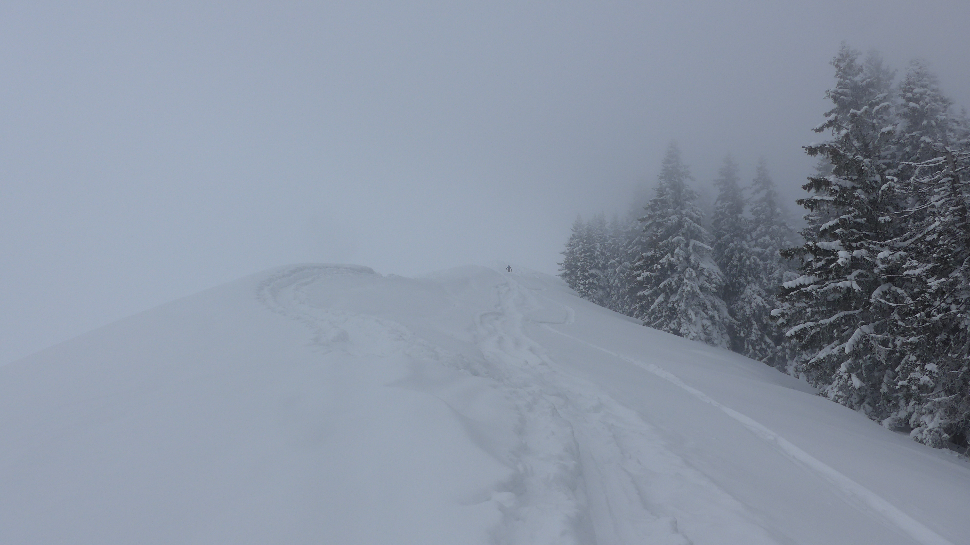 Wieder schlechte Sicht, daher notgedrungen dem Aufstiegsweg folgend zurück: 7 min. hochstapfen zur Anhöhe der Rauhalm. Abfahrt. Rauf stapfen. Abfahrt über die Forststraße nett mit Pulver. Rauf stapfen. längere Skatingpassage. Versöhnliches Abfahren auf der Schwarzentenn Forststraße.