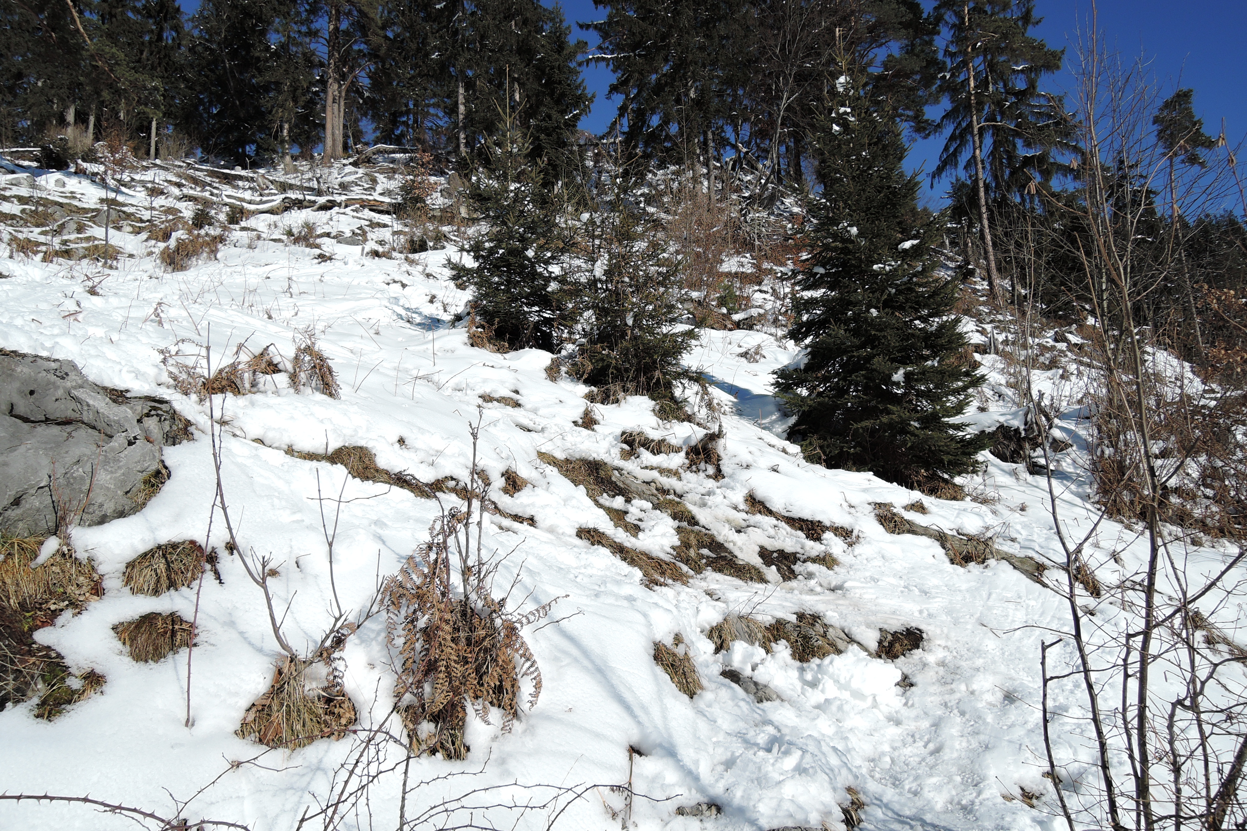Runter über den W4 bzw. die Skiroute zur Esterbergalm (1260m) und weiter über den Forstweg bzw. Waldschneisen zurück zum PP.