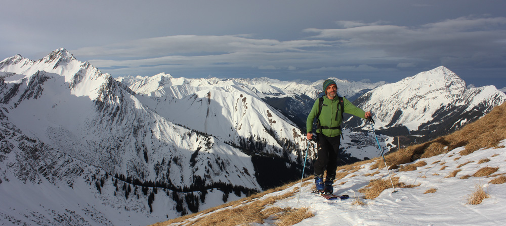 Tourenverhältnisse: Grundsätzich ausreichend Schnee. Bei der Abfahrt wegen der warmen Temperaturen (nach teils nächtlicher Ausstrahlung) alle Schneearten außer Pulver angetroffen. Gipfelrücken oben pickelhart, dann sogar Firn und weiter unten Sulz und Nasschnee - aber fahrbar.