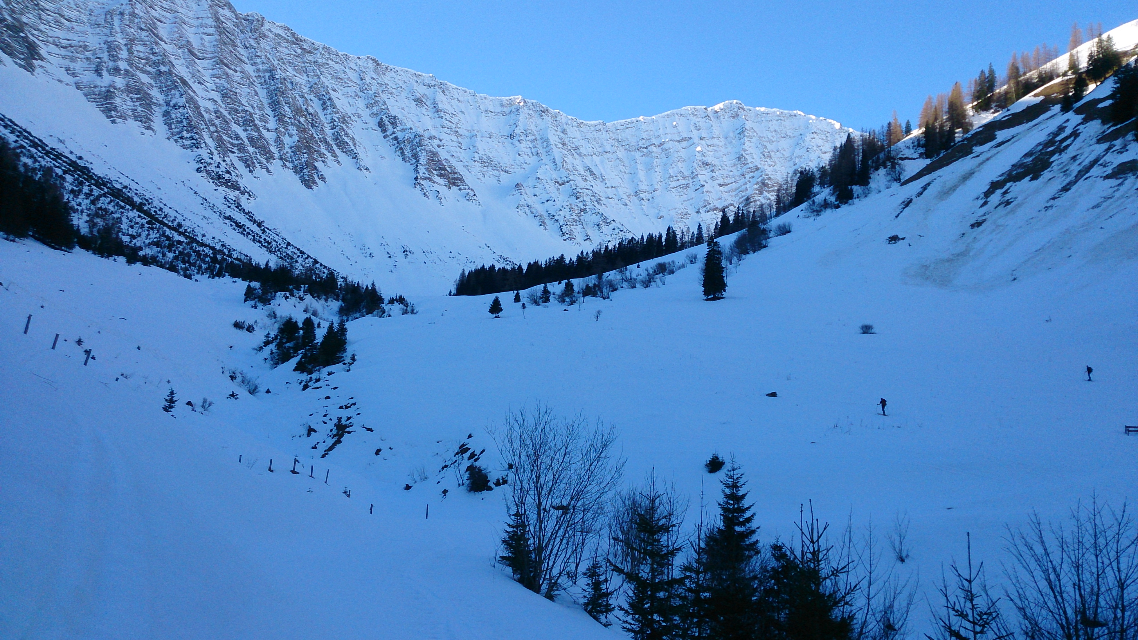 Tourenverhältnisse: Im Aufstieg von Lermoos (Untergarten) genügend Schnee, der vormittags Skifahrer-tragfähig verharscht war. Auf dem Forstweg zwei Stellen mit wenig Schnee, hier wird bald einige Meter abzuschnallen sein. Gartner Tal vormittags viele harschige Spuren, nach oben firnte es auf (ca. ab 11.30 Uhr, je nach Exposition auch etwas früher). Bei der Abfahrt bis zum Sommerbergjöchle Firn, dann extrem schattseitig unter der Gartner Wand Restpulver, Mittelteil harschig, ganz unten beim Bachbett wieder aufgefirnt.