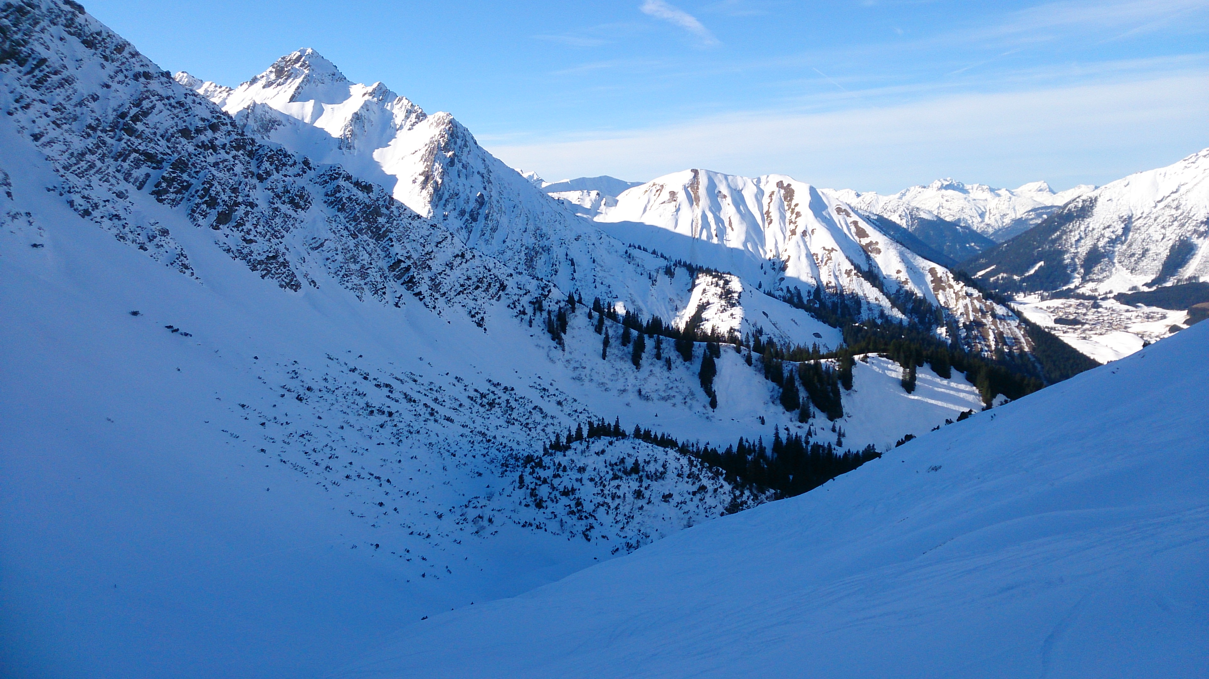 Leider brach mir (bzw. lockerte) schon kurz unterhalb des Sommerbergjöchle bei einem Ski der Vorderbacken der Fritschi-Bindung, danach ging nur noch frustrierendes Spitzkehrenfahren, Einbeinfahren und Skitragen. Wenn so etwas aber in einem harschigen Steilhang passieren würde, wäre es wohl aus ... Lieber nicht zuviel darüber nachdenken, der Bruch erfolgte jedenfalls völlig anlasslos (kein vorangehender Sturz o.ä.) und ohne dass vorher ein Defekt an der Bindung zu erkennen gewesen wäre.