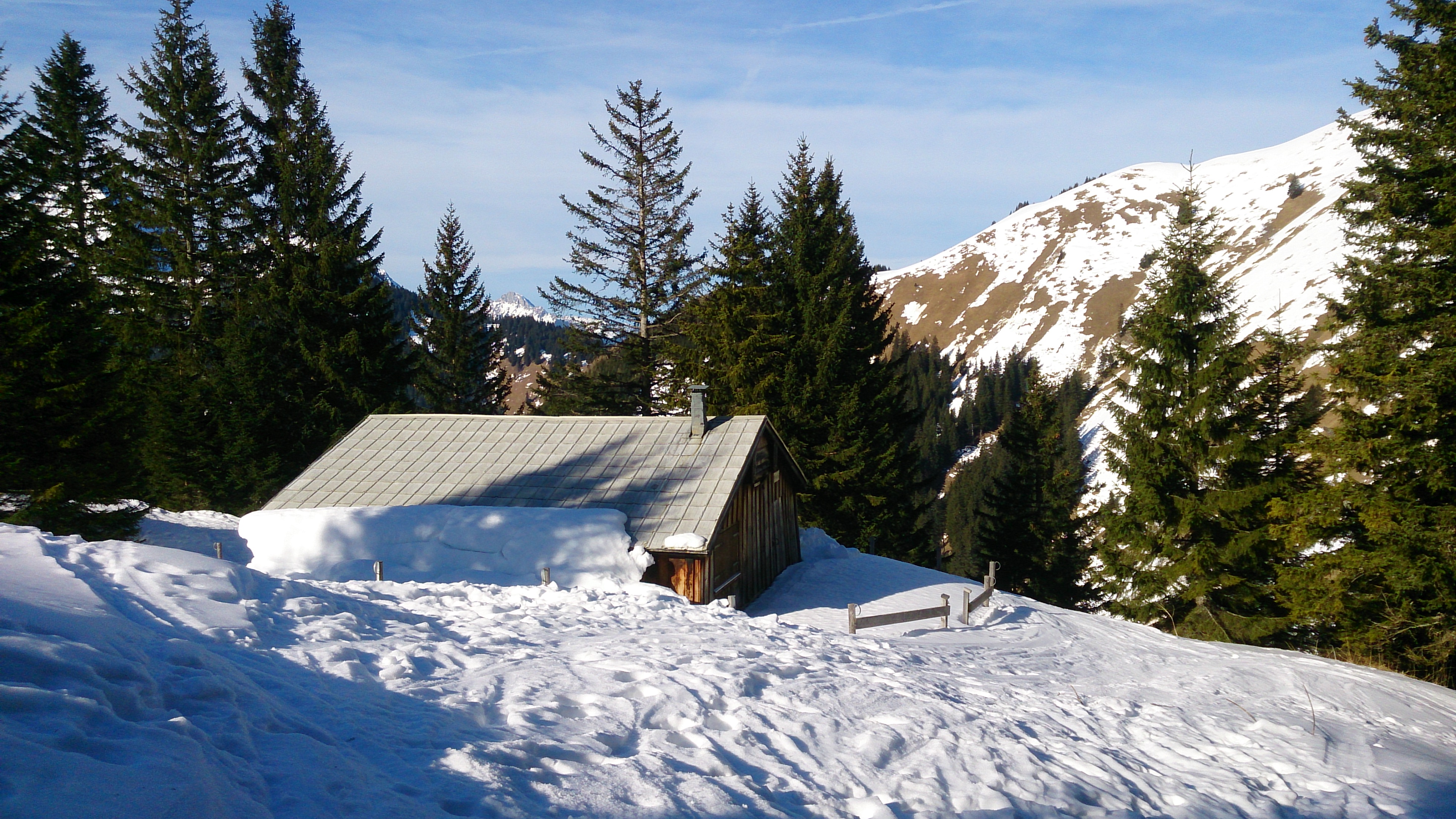 In der Abfahrt nach Bichlbächle kommt man an dieser Hütte der Bichlbächler-Alm vorbei, dahinter dann 200 Hm hakelige Steilstufe im Wald: