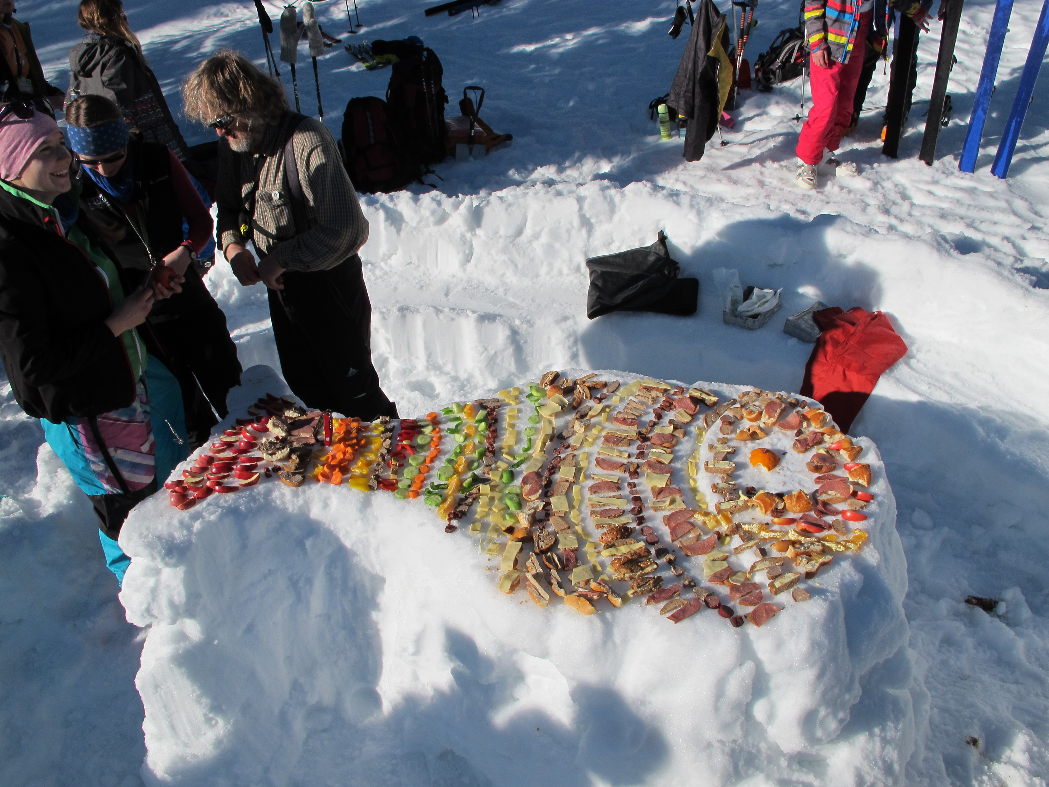 Wir waren mit einem DAV- Fortbildungskurs (Thema Skitouren mit Kindern) und somit mit vielen Kindern unterwegs. Die Route und das GElände habe sich sehr gut für das spielerische Skitourengehen geeignet. Wir haben einen Schneetisch gebaut (siehe Bild).