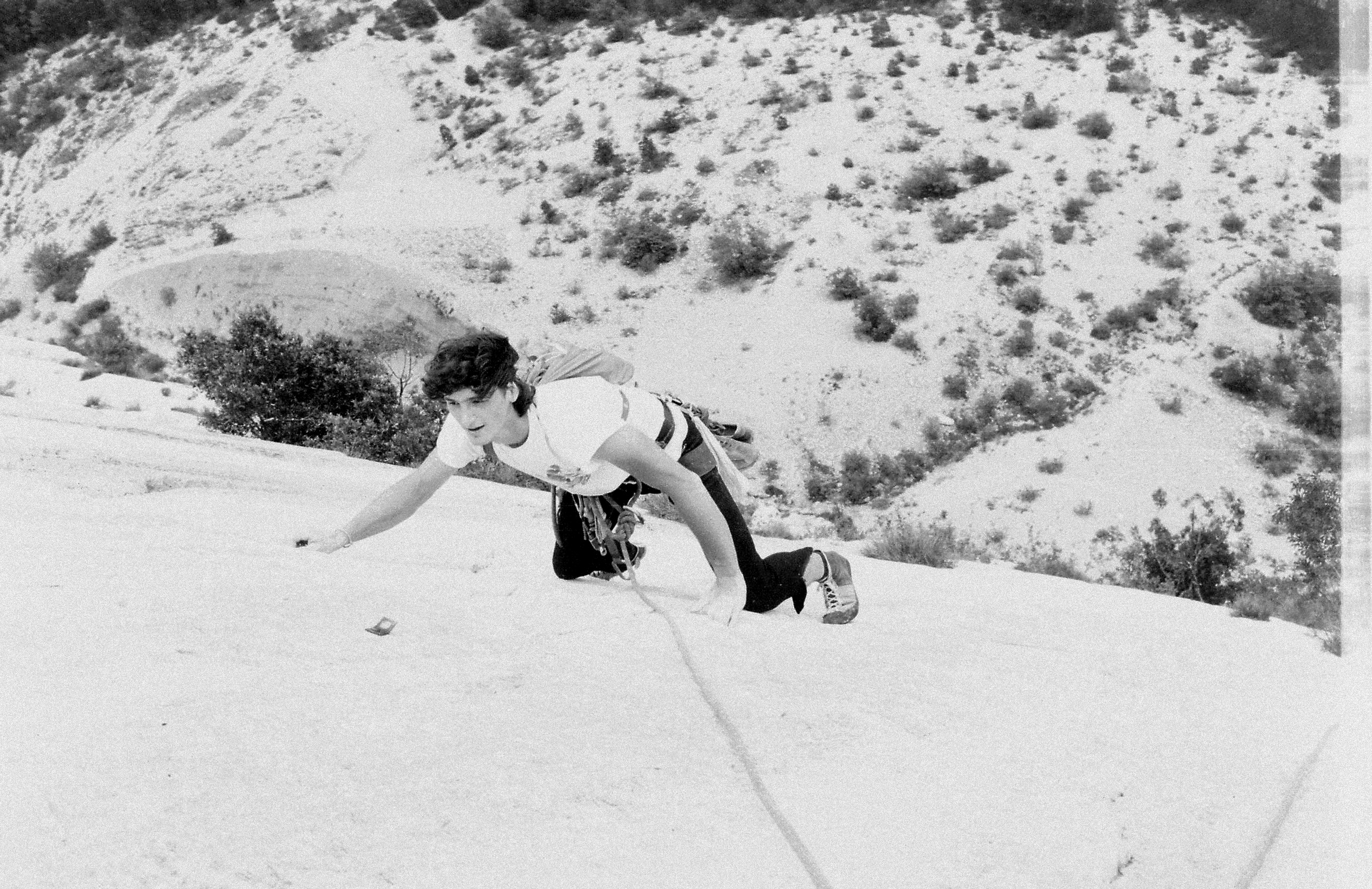 2.Bild: SW Bild von einer sehr frühen Wiederholung, im April 1981, der sichtbare Haken, war der einzige in der Seillänge. Die damals mit "sechs" angegeben war. Mögliche Sturzstrecke damals 50-60m. Heute mit Bohrhaken im Abstand von 4 - 5m in dieser Seillänge gesichert.