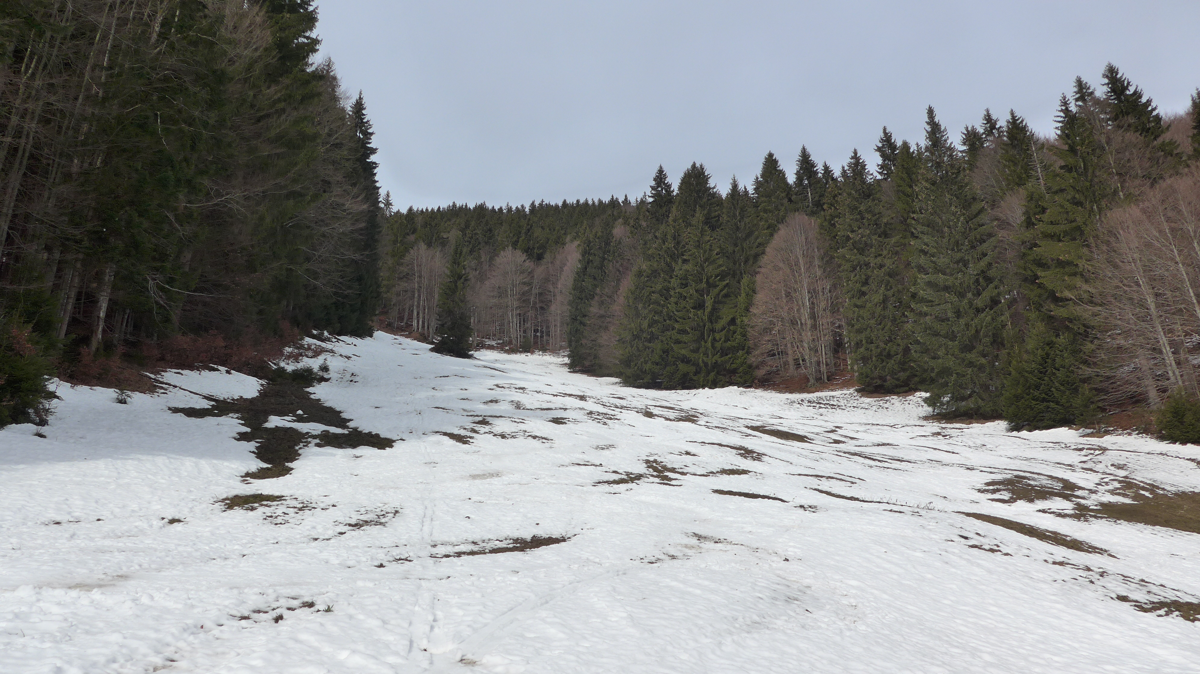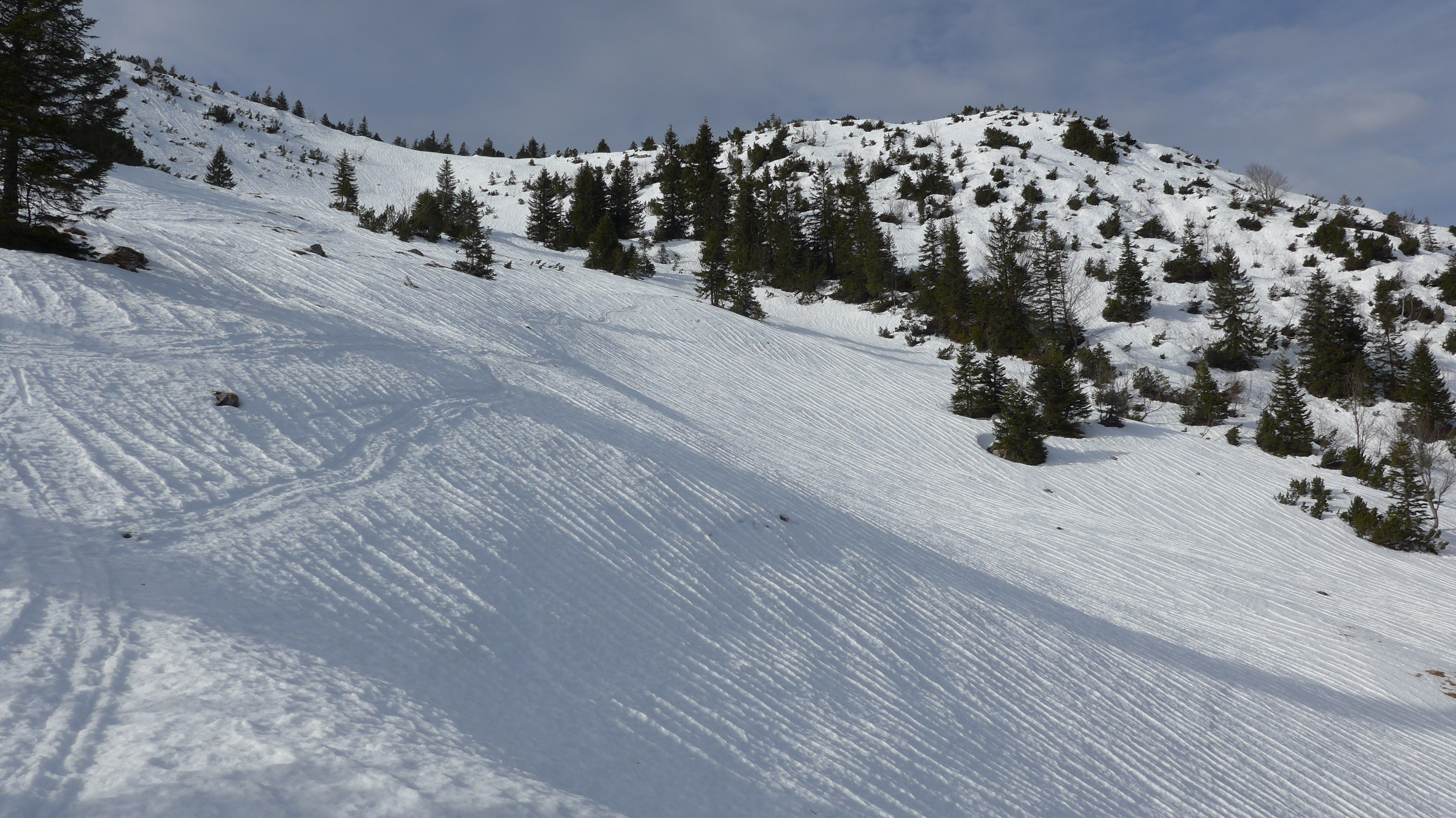 Tourenverhältnisse: von unten weg Schnee, fast etwas eisig. Die zwei Zwergal-Lifte waren heute in Betrieb. Der oberste Pistenabschnitt ist teils schon aper od. sehr geringe Schneedecke. Der Weiterweg ist gut mit Schnee bedeckt, ausser kleine Wasserläufe + der Hüttenhang (S). Windstill.