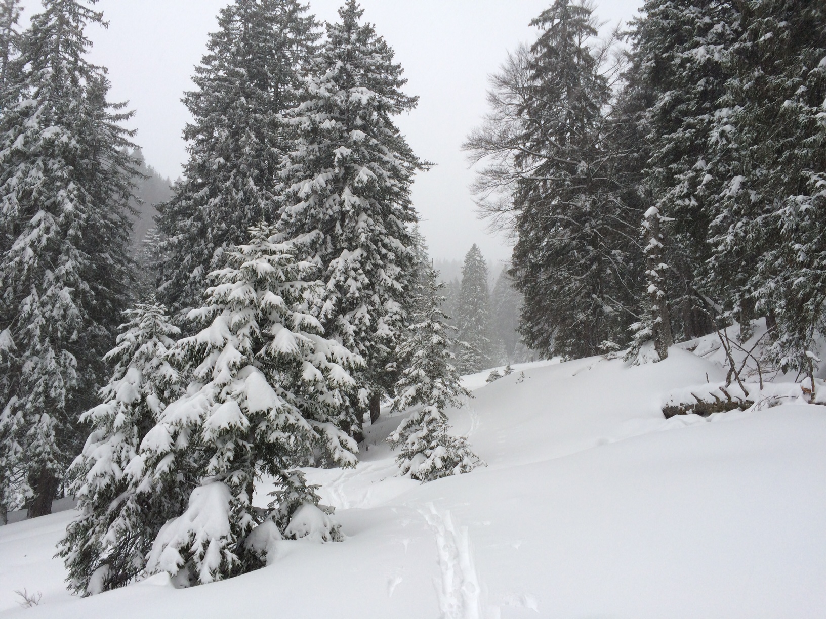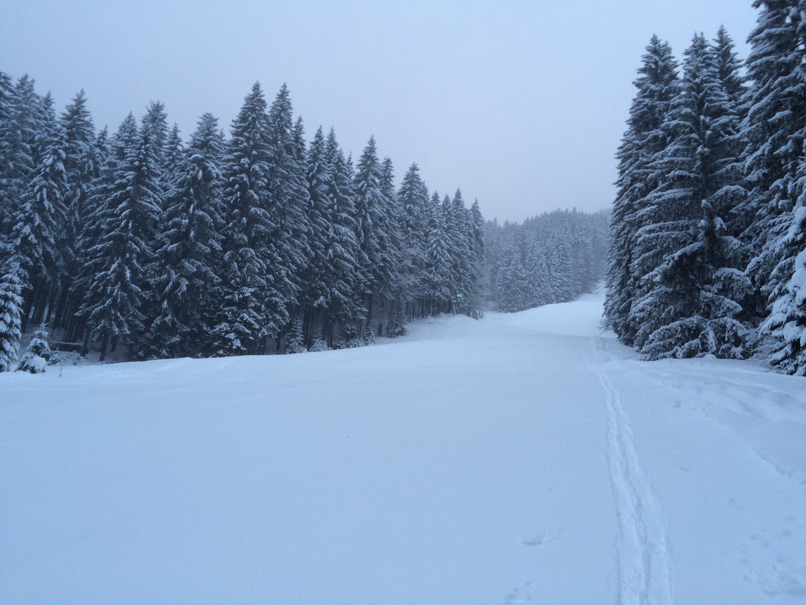 Prognose: Während der Tour hatte es kontinuierlich leicht geschneit. Wenn die Temperaturen heute nicht zu sehr ansteigen und heute Nacht noch etwas Schnee dazukokmmt, könnte es morgen noch einmal sehr gut werden. Vor allem für die, die früh dran sind.