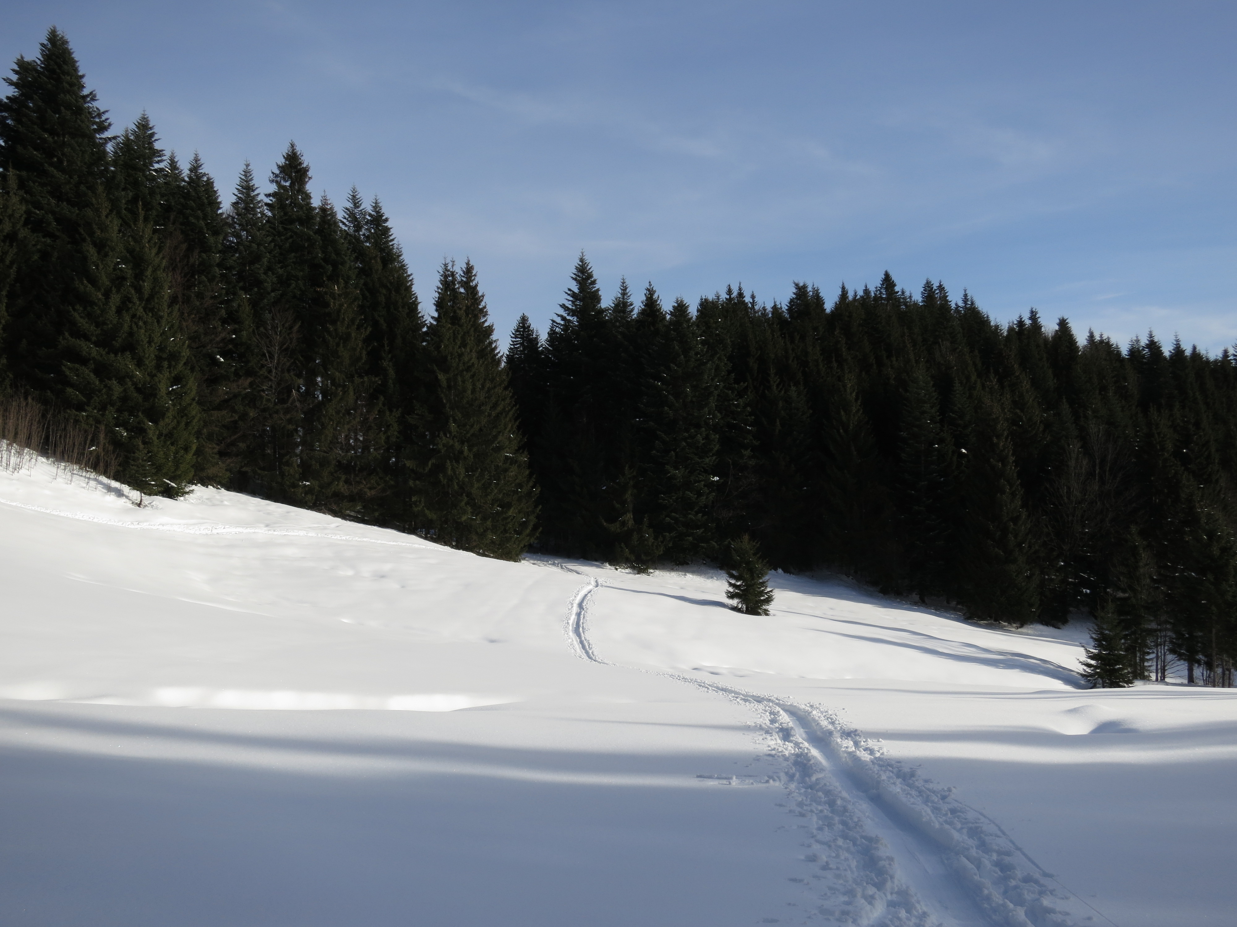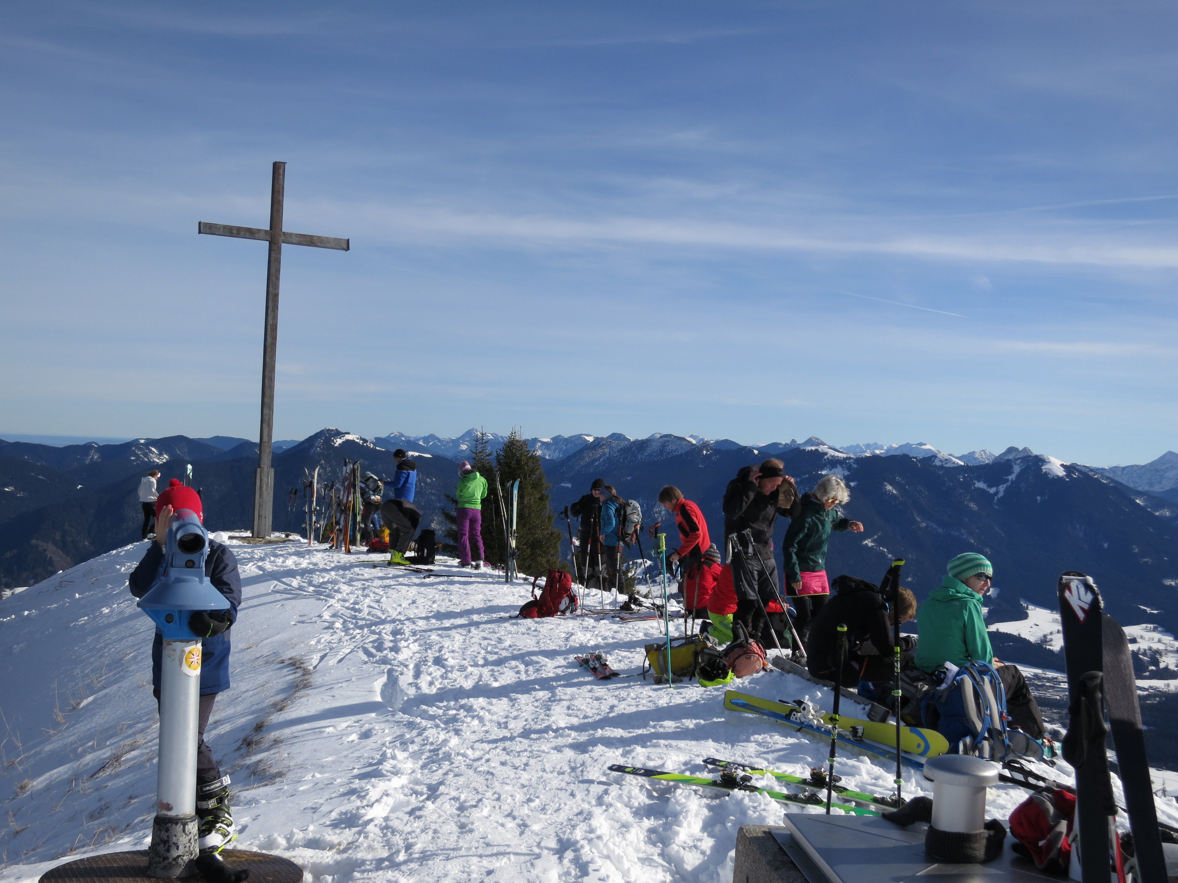 Tourenverhältnisse: Tourenaufstieg im unteren Waldabschnitt: Schnee gerade noch ausreichend. Im weiteren Verlauf durch den Wald und dann über die Florihütte zum Gipfel genügend Schnee. Am Gipfel war's noch nicht so richtig föhnig windig und so gut zu sitzen (aber fast Platzkarten nötig). Abfahrt auf Piste, die durchgehend in einem guten Zustand war (meist leicht sulzig). Bereiche abseits der Piste hatten meist schon etwas schwereren Schnee. Heute viele Tourengeher und viele Pistler unterwegs (na ja, bei dem Wetter.. ..und Wochenendtag).