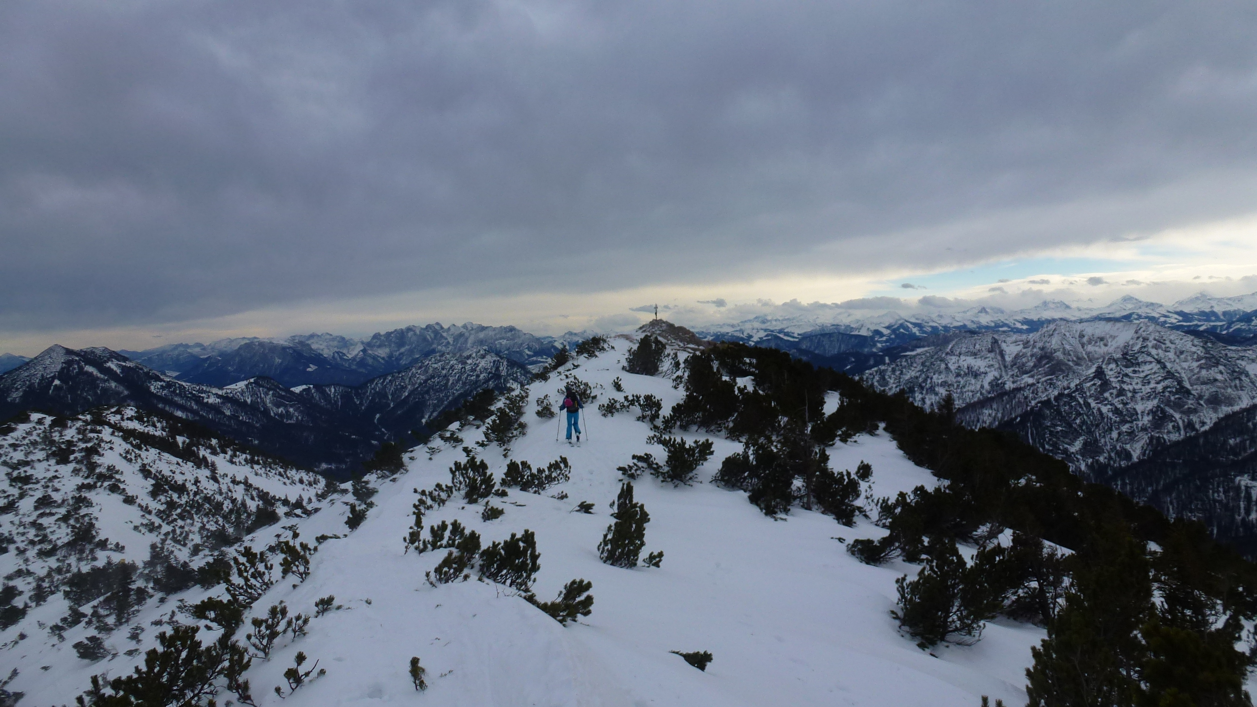 Taubenstein (windig) - Lämpersberg - Rotwand (sehr straffer Wind - torkelnder Gang) - auf Grund eines "technischen" Defekt´s die Nordrinne (einige Abfahrtsspuren) ausgelassen. Abfahrt zum Rotwandhaus tragender, aber sehr zerfurchter Schnee im Wechsel mit aperen Inseln -> kein Genuss. Dafür den Auerspitz über den Rücken noch besucht. Hier war´s stürmisch!