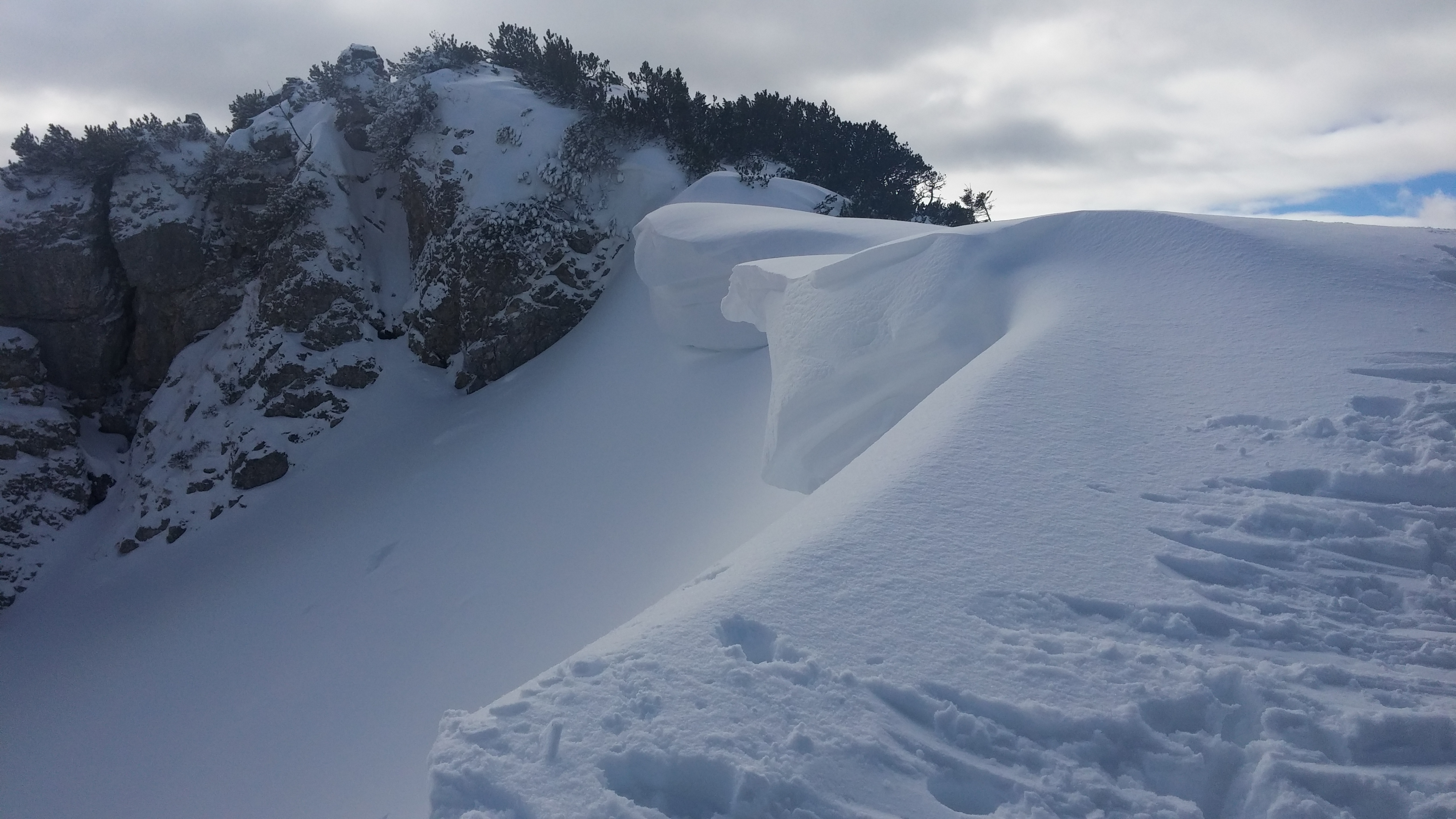 Teilweise hatte der gestrige Sturm ganze Arbeit geleistet, viele Schneeverfrachtungen, Rücken und Grate abgeblasen.