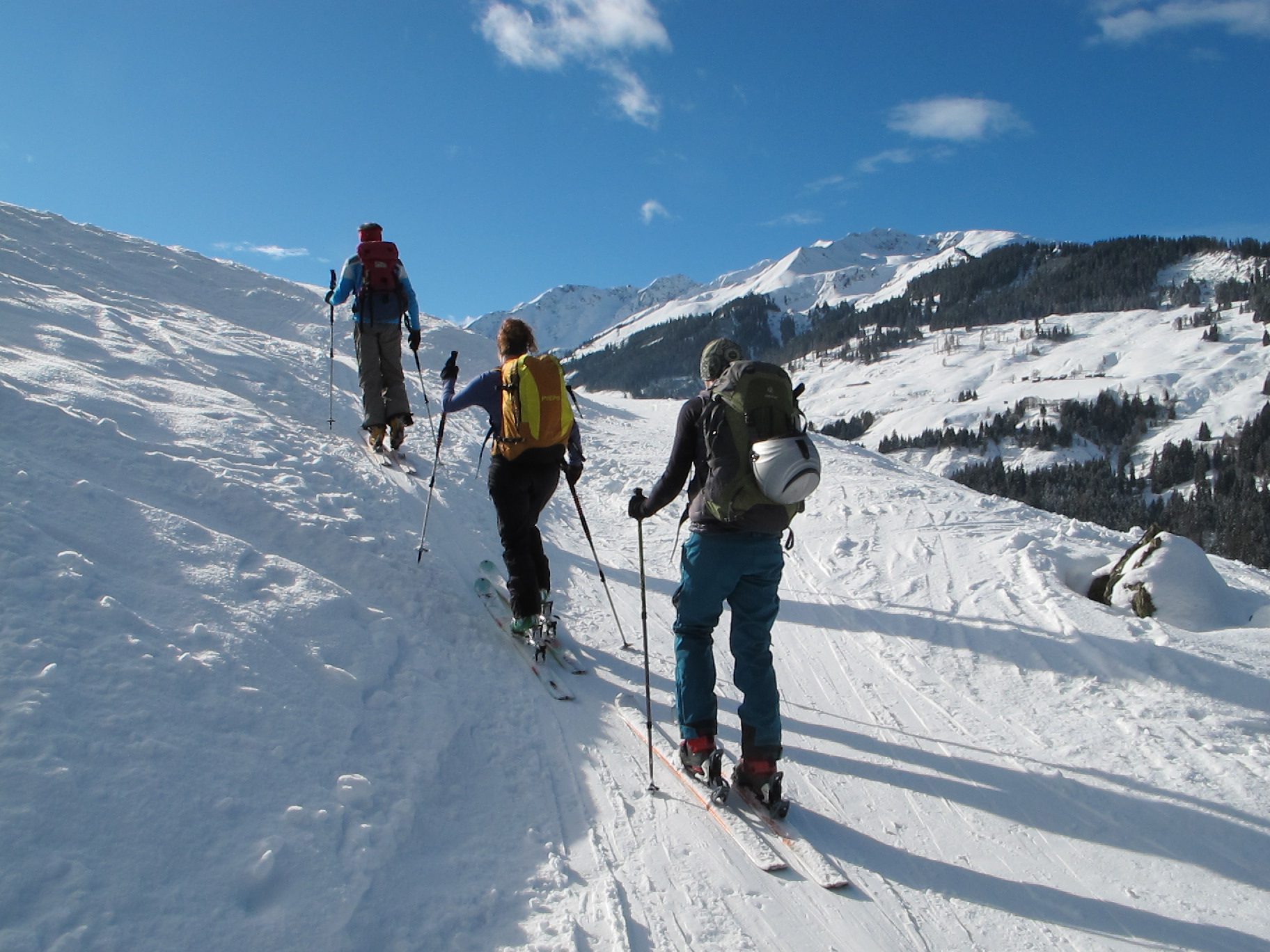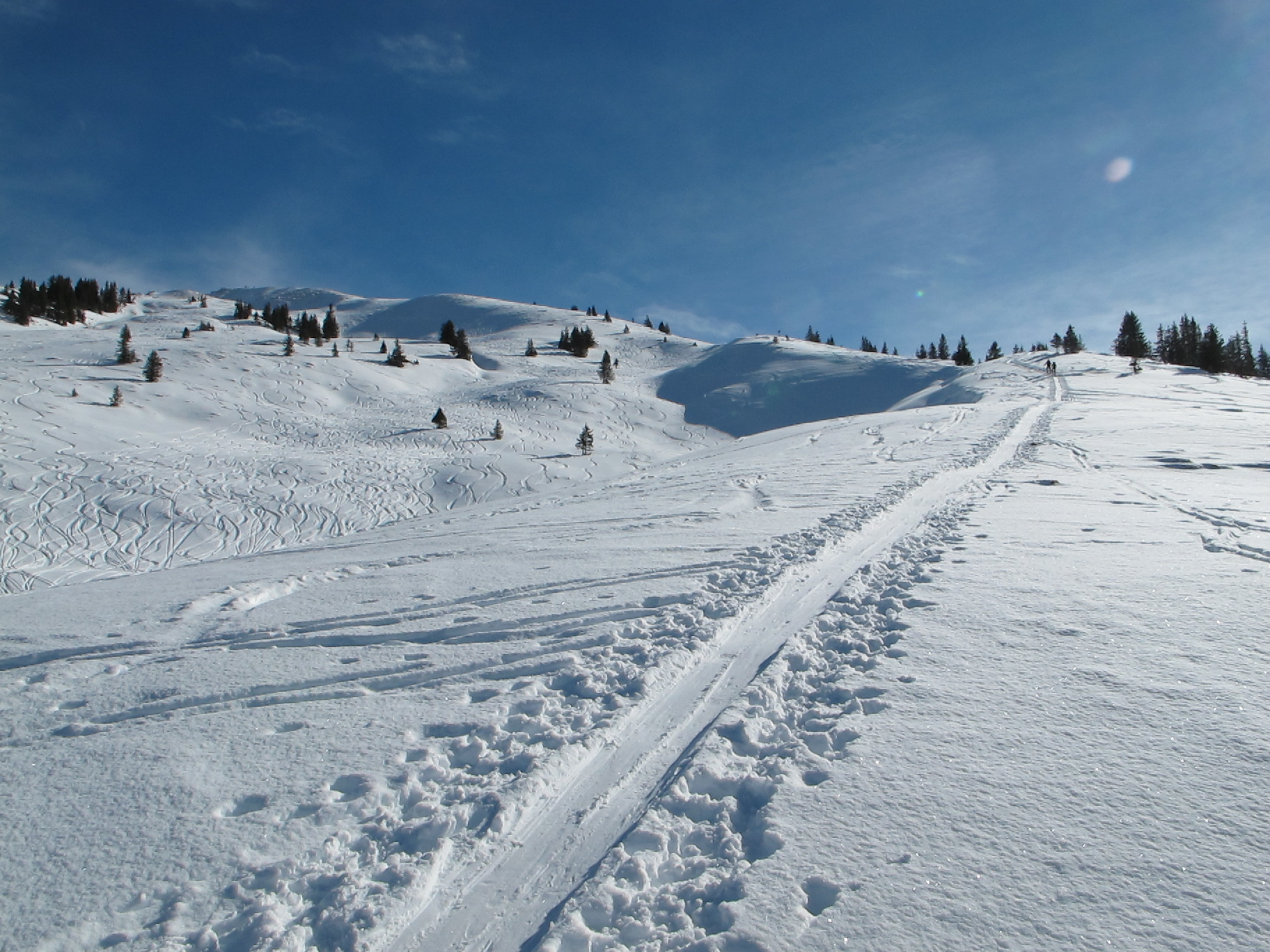 Tourenverhältnisse: Für diesen Winter sehr gute Verhältnisse. In der Nacht hat es ca. 10 cm geschneit. Darunter harschige Unterlage. Nur wenige Stellen leicht braun, konnte man aber gut umgehen. Schöne Abfahrt bis zum Parkplatz, jetzt im letzten Teil schon pistenmäßig eingefahren. Wetter: warm und sonnig.