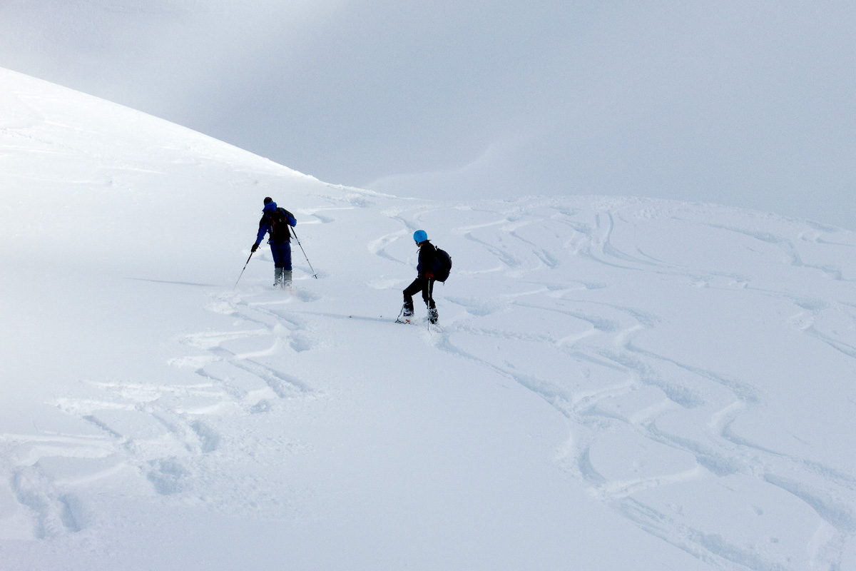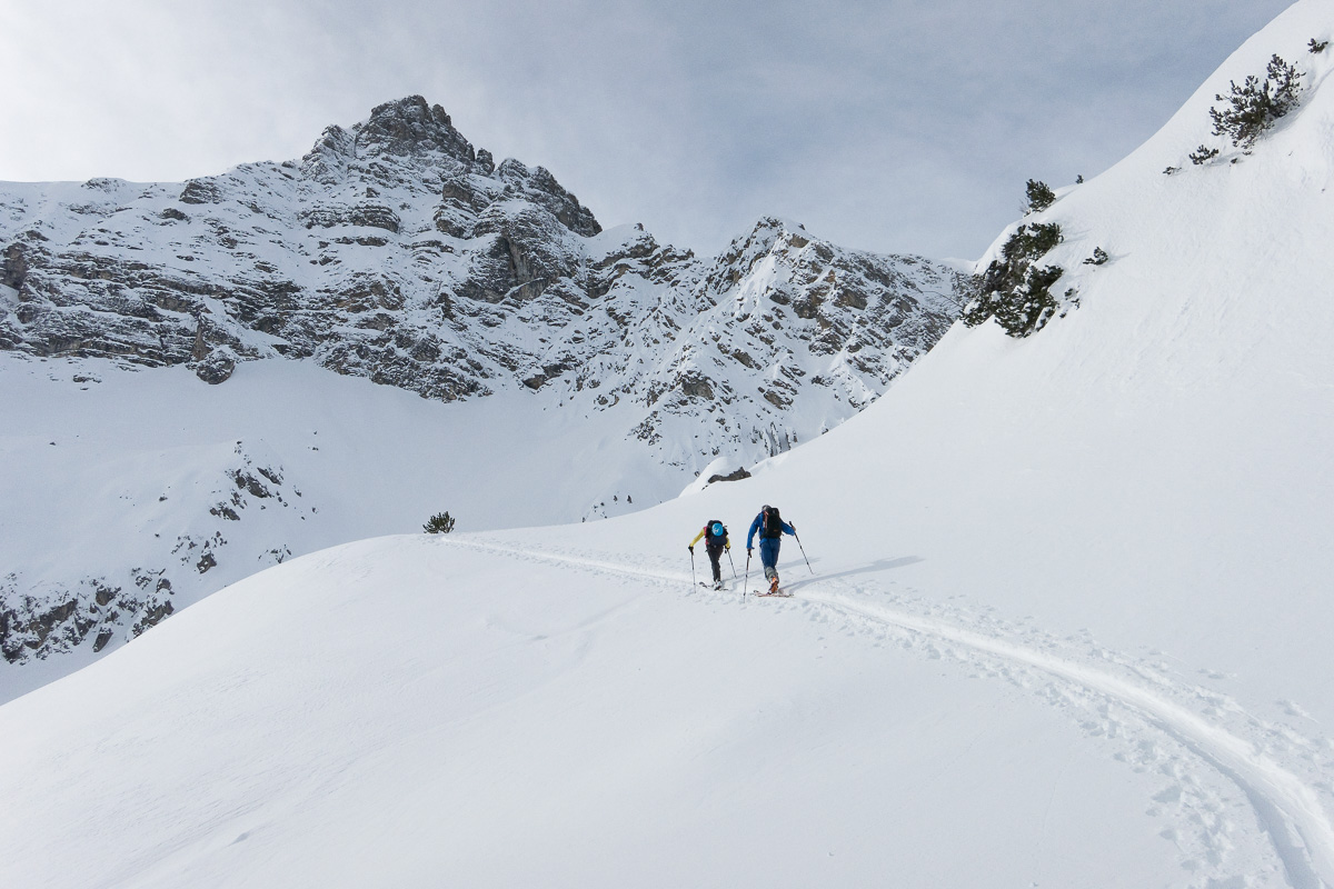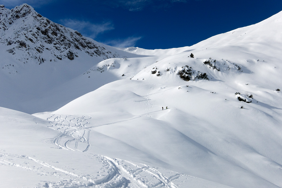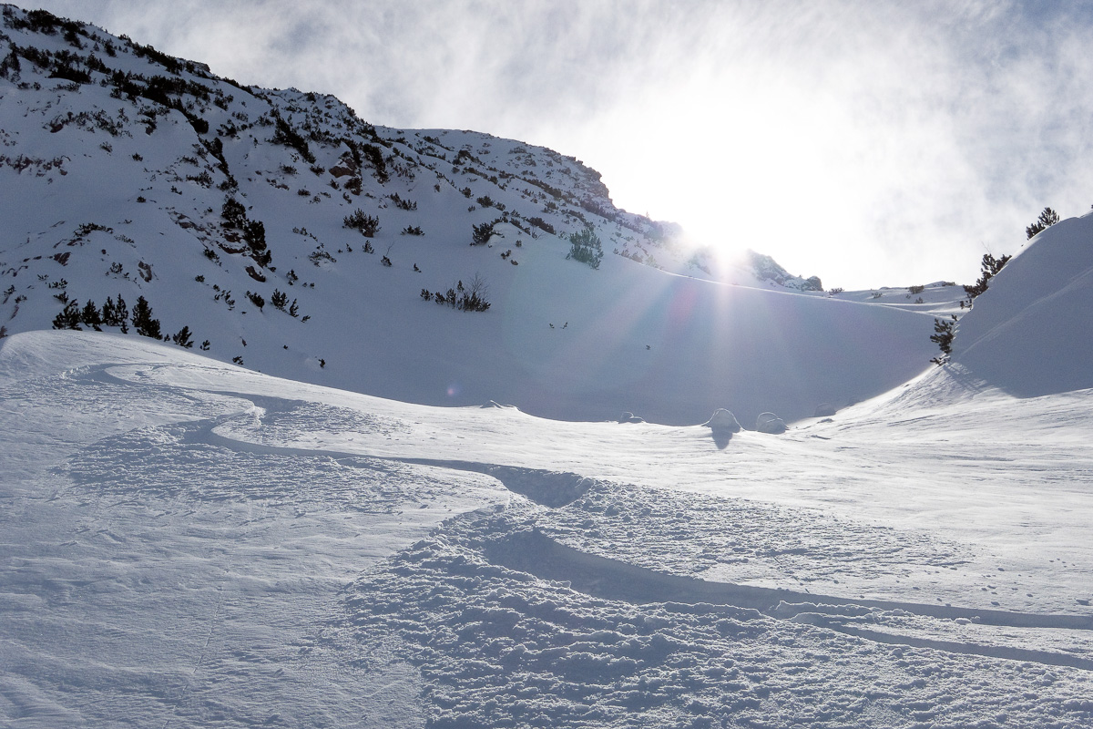 Oben am Gipfelhang festgeblasener Schnee, der Rest guter Pulver (unten schon etwas schwer). Landschaftlich schöne Tour.