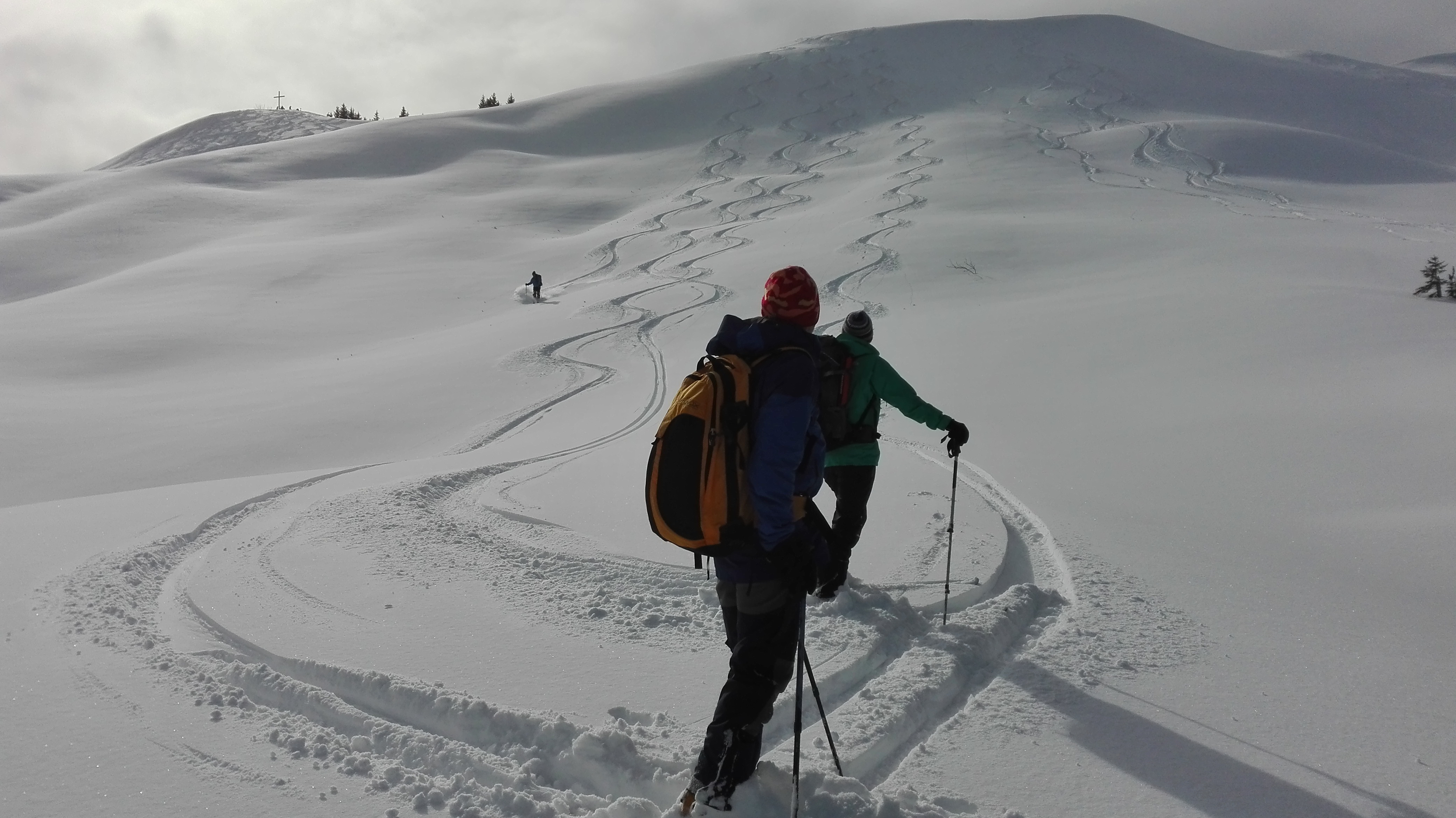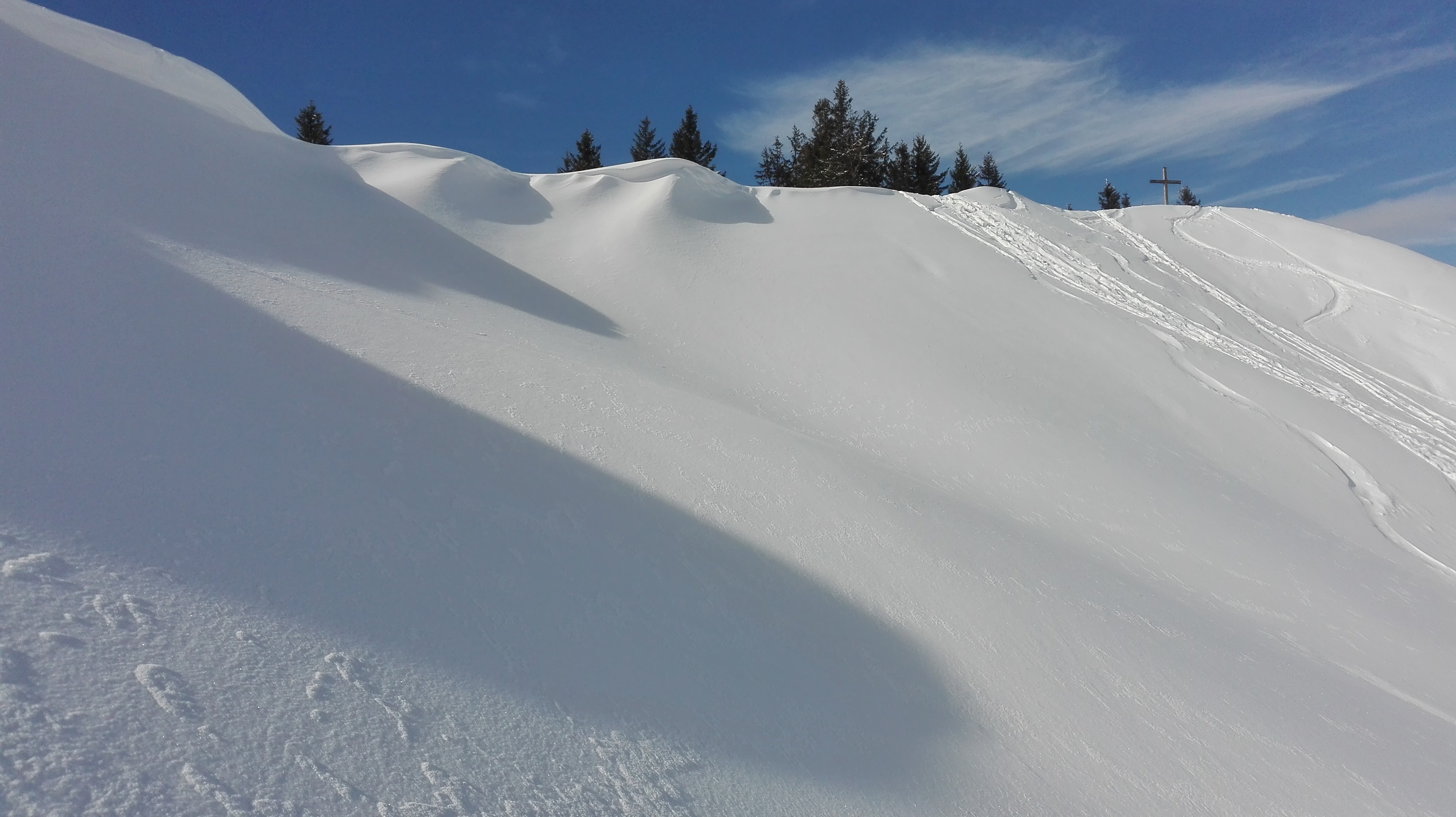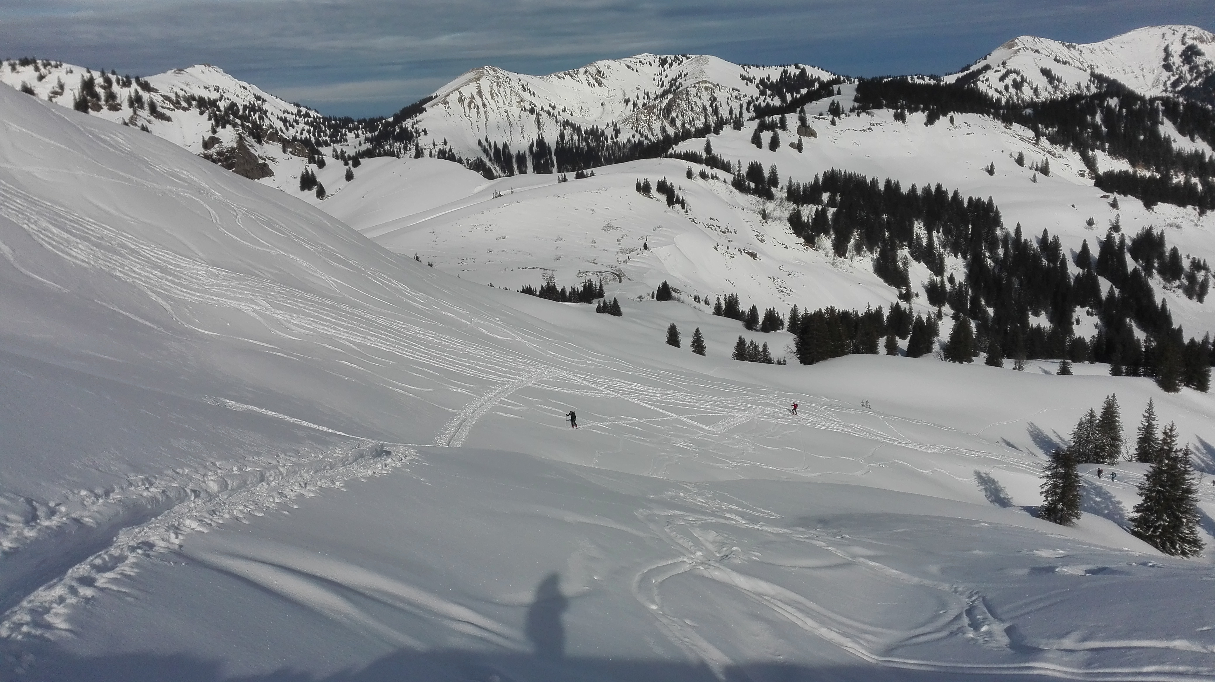 Tourenverhältnisse: Vom P über Vorsäß und die Forststraße/Rodelbahn zur Rappengschwendalp. Von dort weiter zum Höllritzereck. Ca. 150 Hm Abfahrt bei gutem Pulverschnee und Wiederanstieg, diesmal zum gleich nebenan liegenden Bleicherhorn. Von hier ca. 170 Hm Abfahrt Richtung Nordost bei nunmehr etwas schwererem, aber immer noch gut fahrbarem Pulverschnee. Wiederanstieg vom Sattel 1489m nach Norden zum Tennenmooskopf. Hier wurde das Wetter schlecht und es begann (ziemlich feucht) zu schneien. Abfahrt über steile Hänge nach Nordosten direkt zur Rappengschwendalp, nun bei schwerem, schon anstrengend zu fahrendem Schnee. Von der Alp auf der Rodelbahn zurück zum Auto bei Schneeregen, zuletzt Regen.