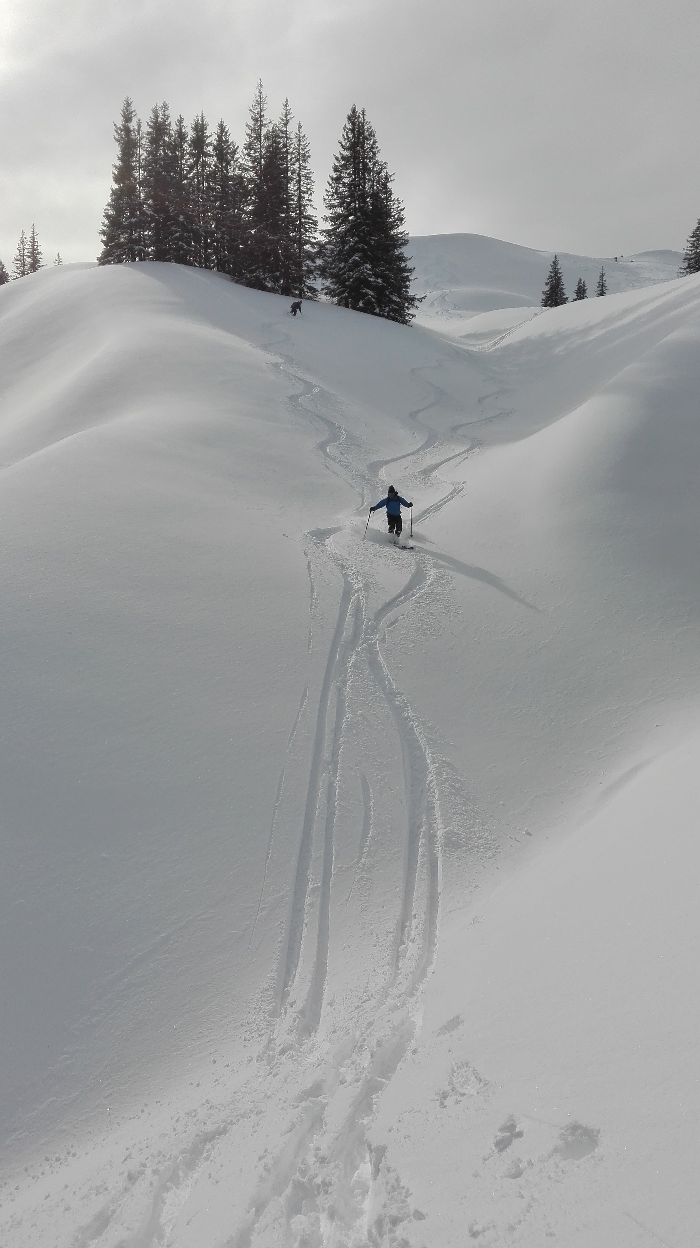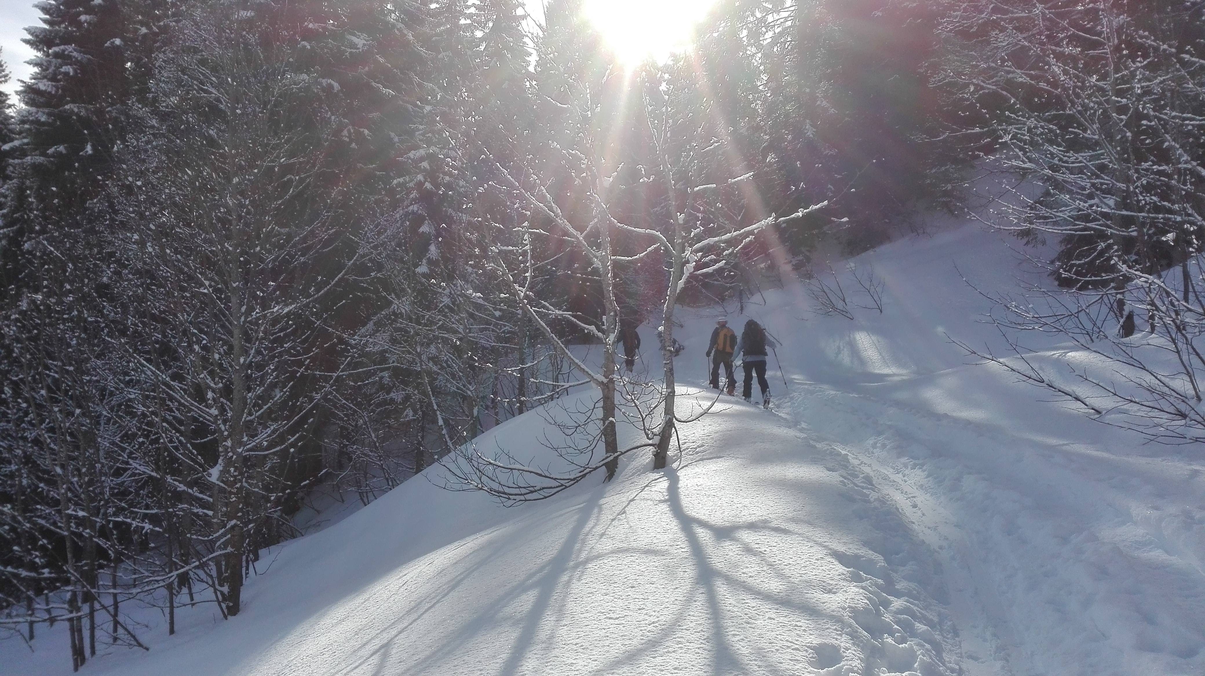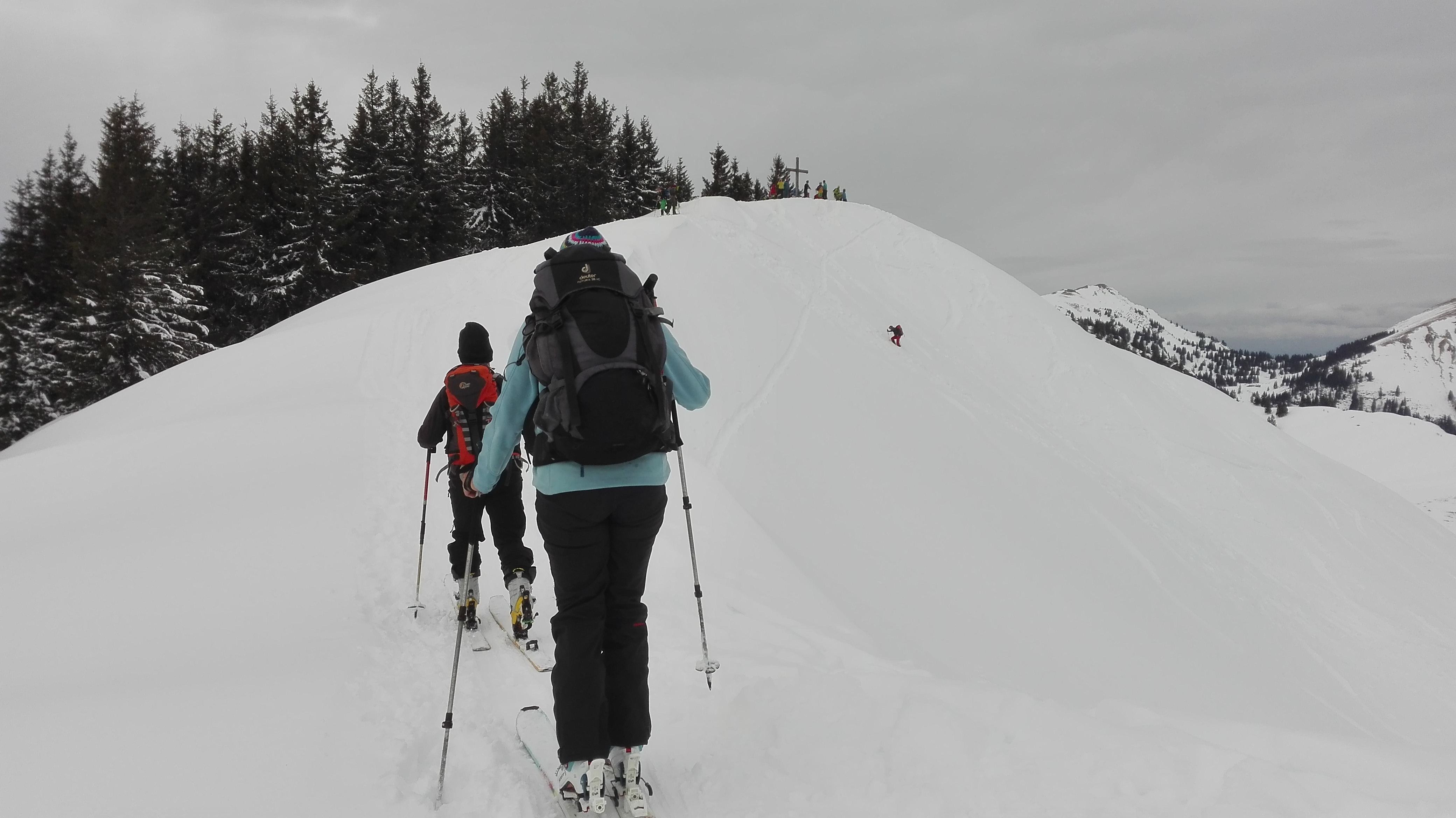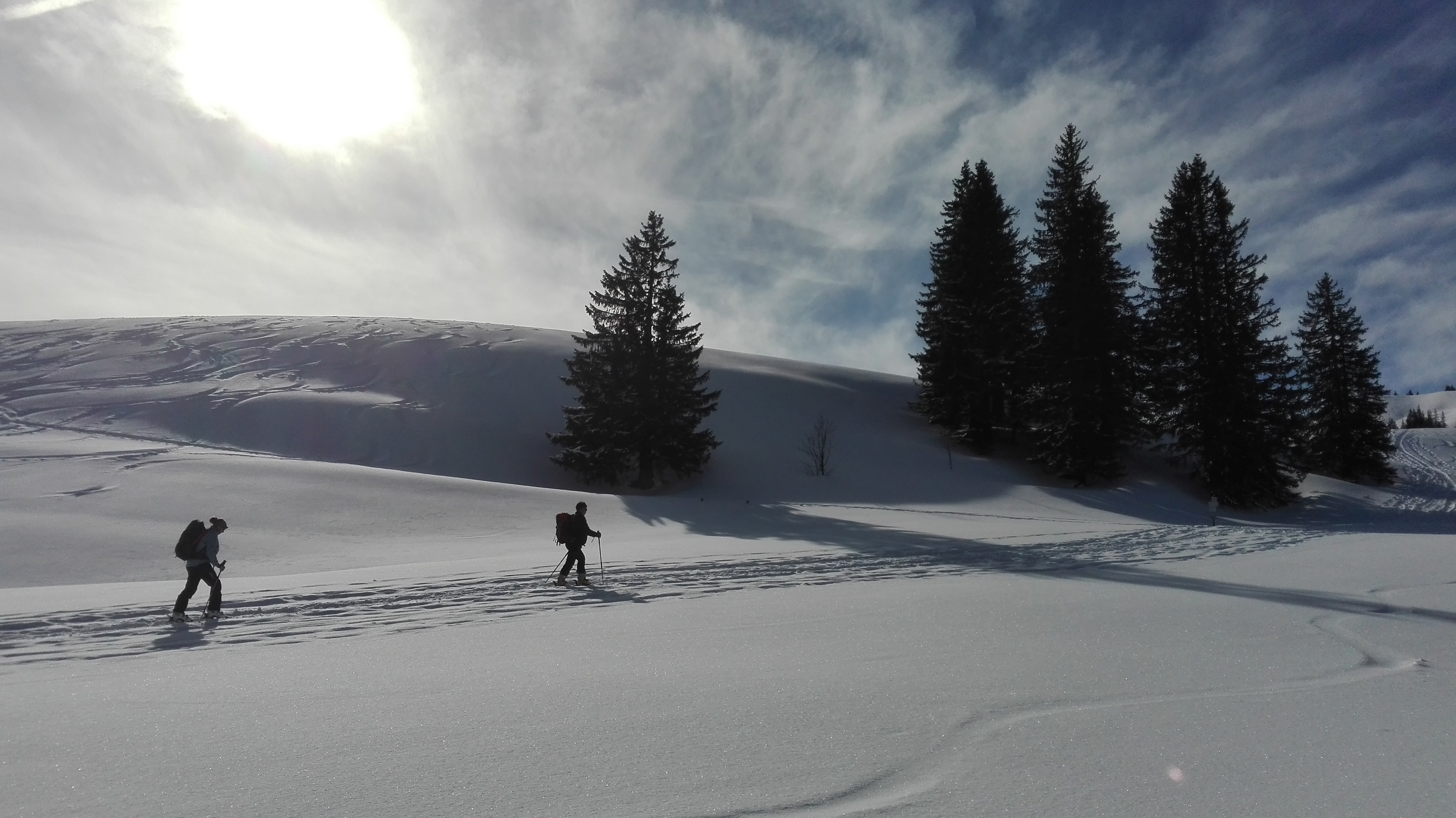 Tourenverhältnisse: Vom P über Vorsäß und die Forststraße/Rodelbahn zur Rappengschwendalp. Von dort weiter zum Höllritzereck. Ca. 150 Hm Abfahrt bei gutem Pulverschnee und Wiederanstieg, diesmal zum gleich nebenan liegenden Bleicherhorn. Von hier ca. 170 Hm Abfahrt Richtung Nordost bei nunmehr etwas schwererem, aber immer noch gut fahrbarem Pulverschnee. Wiederanstieg vom Sattel 1489m nach Norden zum Tennenmooskopf. Hier wurde das Wetter schlecht und es begann (ziemlich feucht) zu schneien. Abfahrt über steile Hänge nach Nordosten direkt zur Rappengschwendalp, nun bei schwerem, schon anstrengend zu fahrendem Schnee. Von der Alp auf der Rodelbahn zurück zum Auto bei Schneeregen, zuletzt Regen.