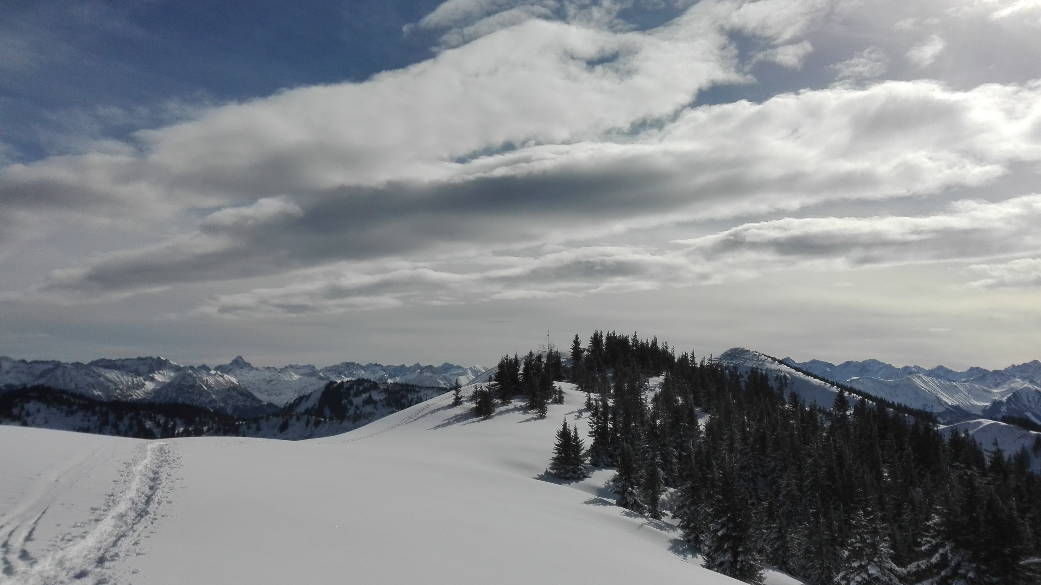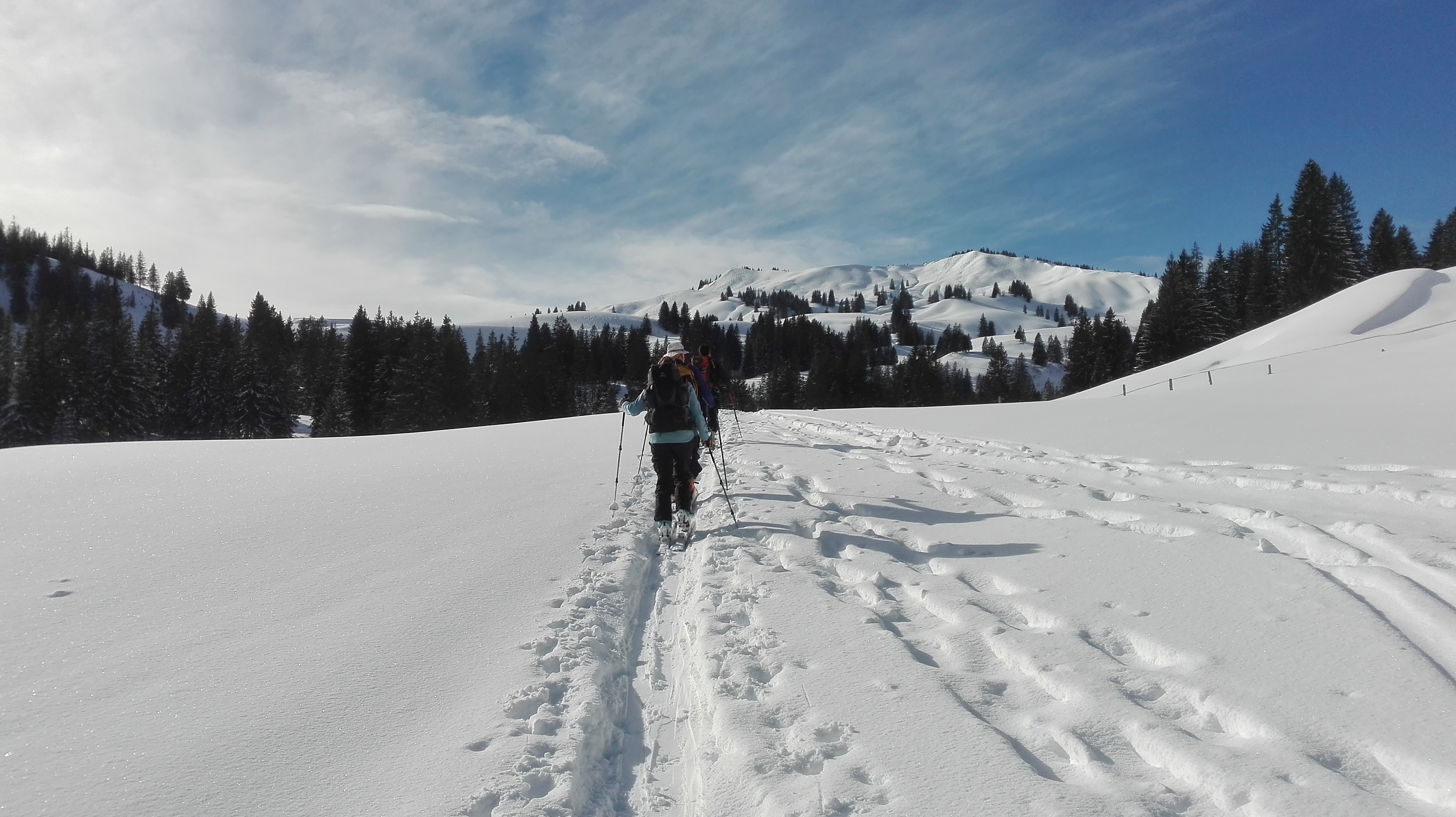 Sonstiges: Leider ist die Tour meistens ziemlich flach. Viele Schneeschuhgeher unterwegs. Das Wetter verschlechterte sich von nahezu wolkenlos am Morgen bis zu eingehüllten Gipfeln und Schneefall/Regen ab ca. 14.30. Schnee lag ab Parkplatz.