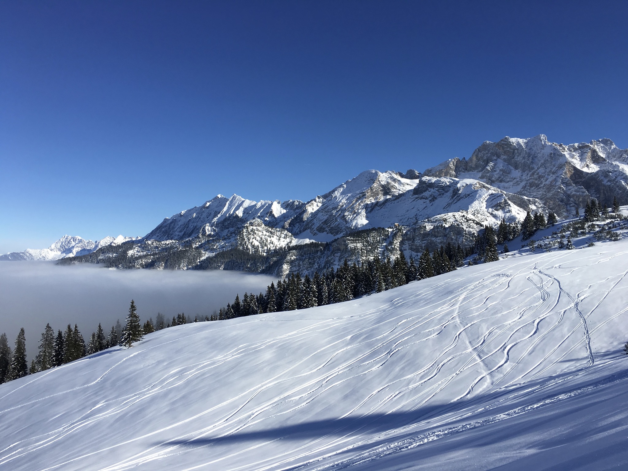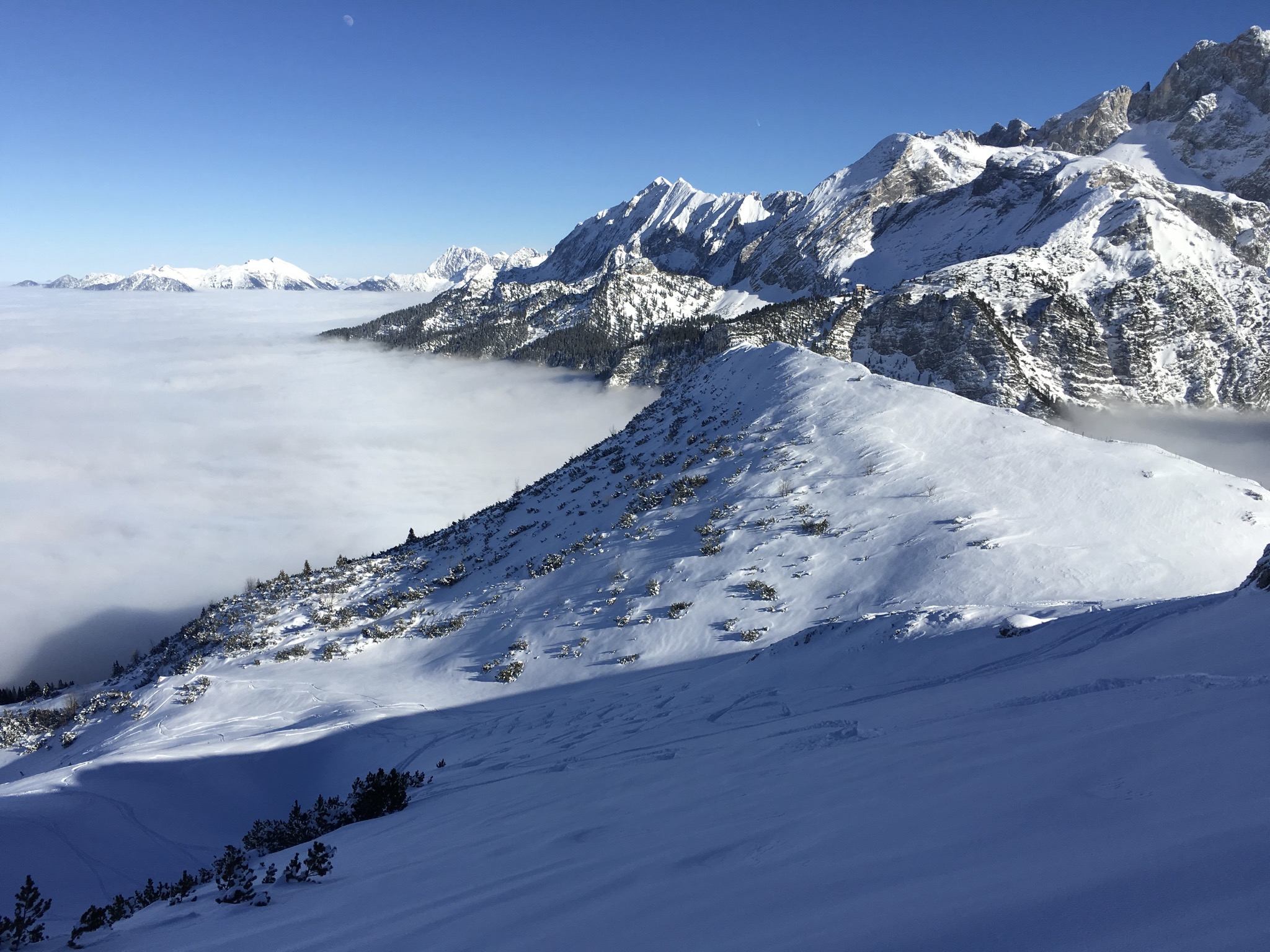 Sonstiges: Herrliches Bergwetter verspricht der ZAMG, also vom vollen PP Hausbergbahn (730m) Richtung Hornabfahrt und weiter über die Skiroute Standard-Tonihütte Richtung Tonihütte bzw. Trögelhütte (1436m). Weiter den oberen Skiweg zur Kreuzalm (1600m). Full House, aber drinnen geht ein schnelles zweites Frühstück. Weiter Richtung Kreuzeck und auf den Hochalmweg, dort links in den Bernadeinsteig. Auf diesem Richtung SO bis zu einem kleinen Zaun erst ohne Felle, dann wieder mit. Immer schön auf und ab und ja nicht nach links runterpurzeln, ist mit Bike schon mies, im Tiefschnee wär’s noch mieser. Irgendwann kommt dann die Bernadeinhütte (1520m). Der Pfad knickt nach rechts ab und weiter geht’s Richtung SW bis man den Bernadeinlift und die Bernadeinabfahrt quert. Auf dem KE5 „Stuiben/Alpspitze/Bockhütte/Reintal“ wieder Richtung SO bis nach einem Gatter an einer Lichtung endlich ein Wegweiser „Stuiben“ nach rechts Richtung SW auftaucht. Die Lichtung hinauf und aus dem Nichts taucht die Stuibenhütte (1640m) vor gewaltigem Panorama auf. Weiter Richtung SW hinauf auf den Mauerschartenkopf zu, diesen rechts liegen lassend und den NO-Hang des Stuiben zur Stubenspitze (1908m), zuletzt zwei Meter zu Fuß. Weiter auf Skiern zum Stuibenkopf (1924m).
