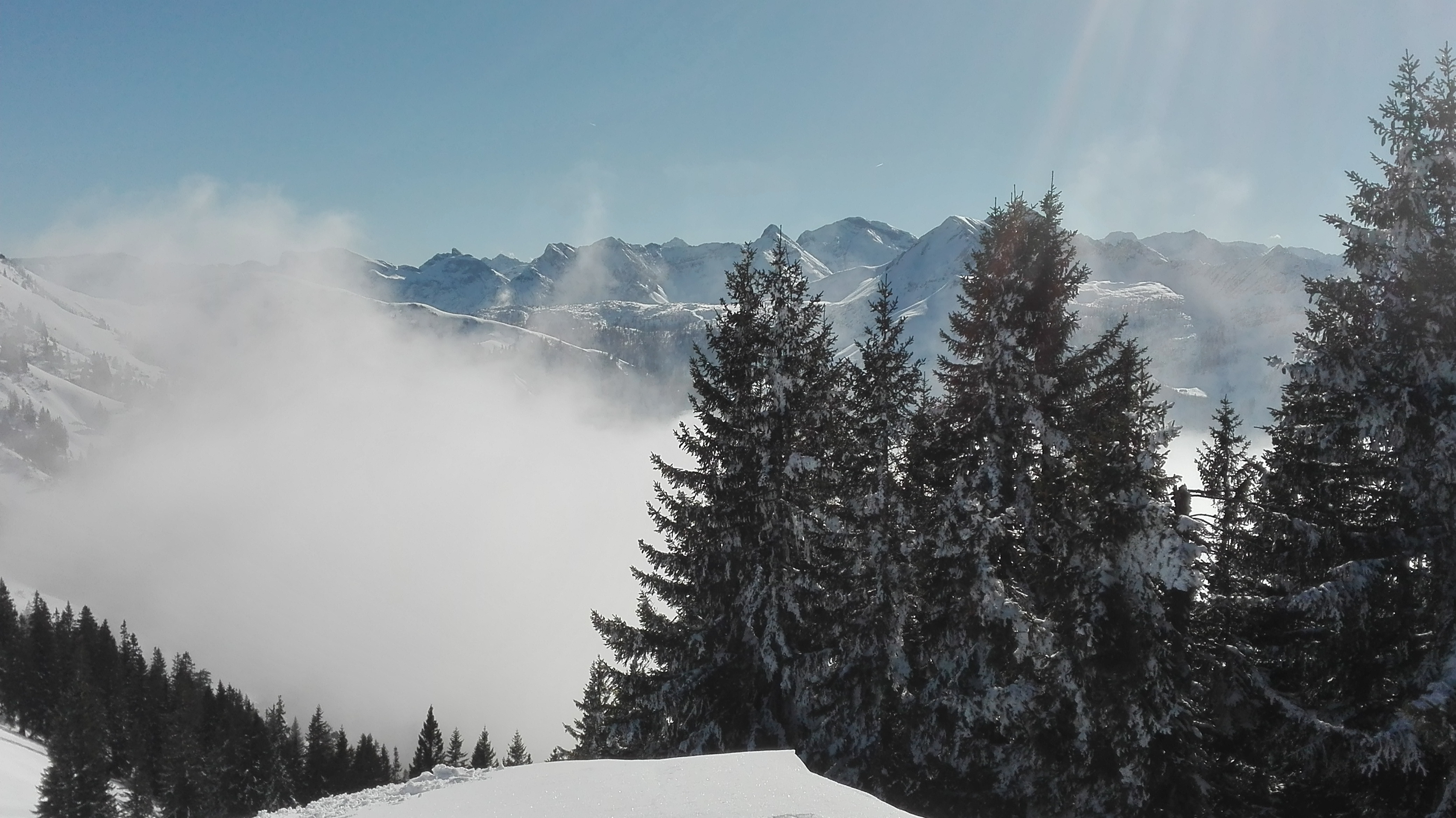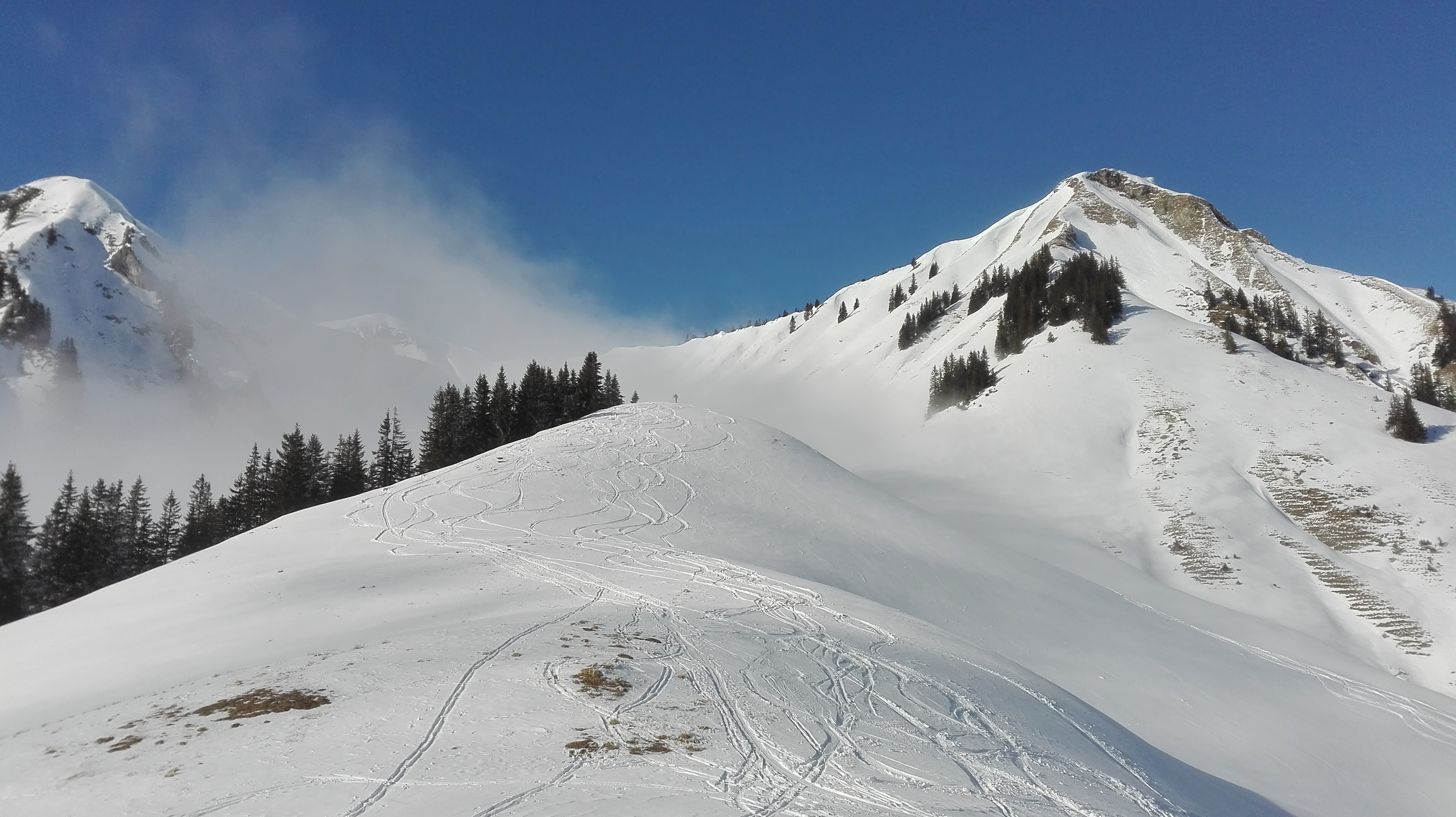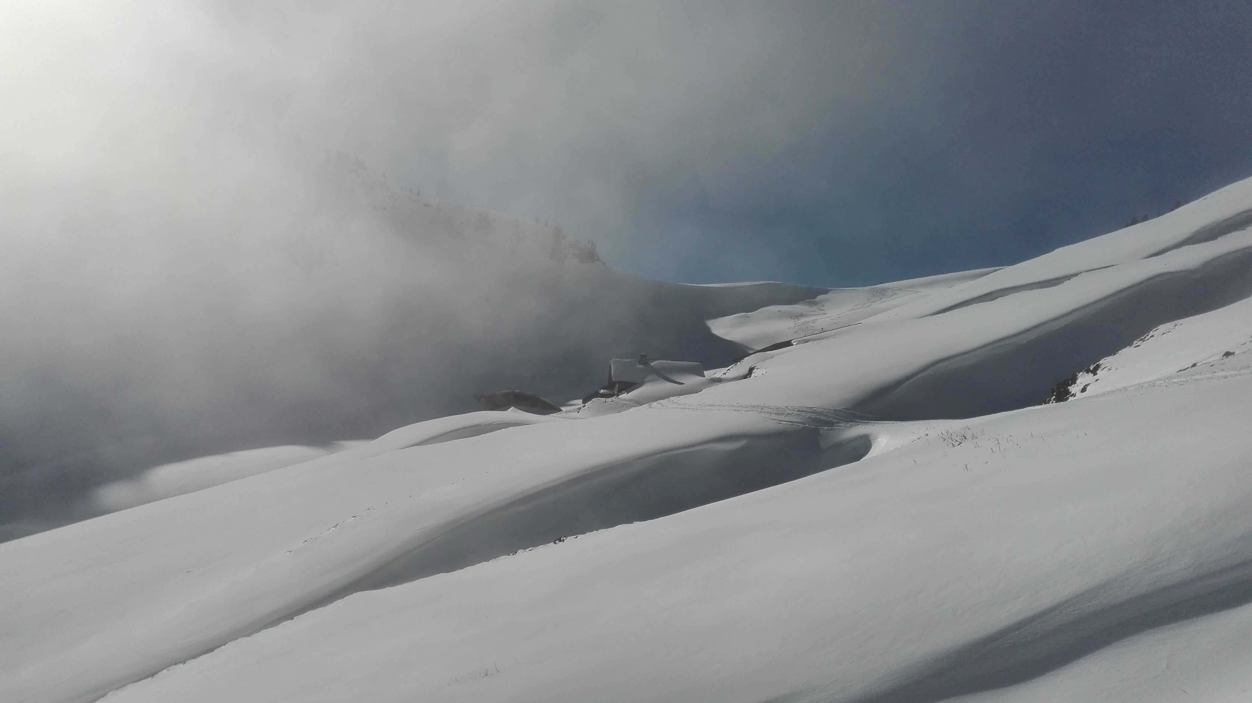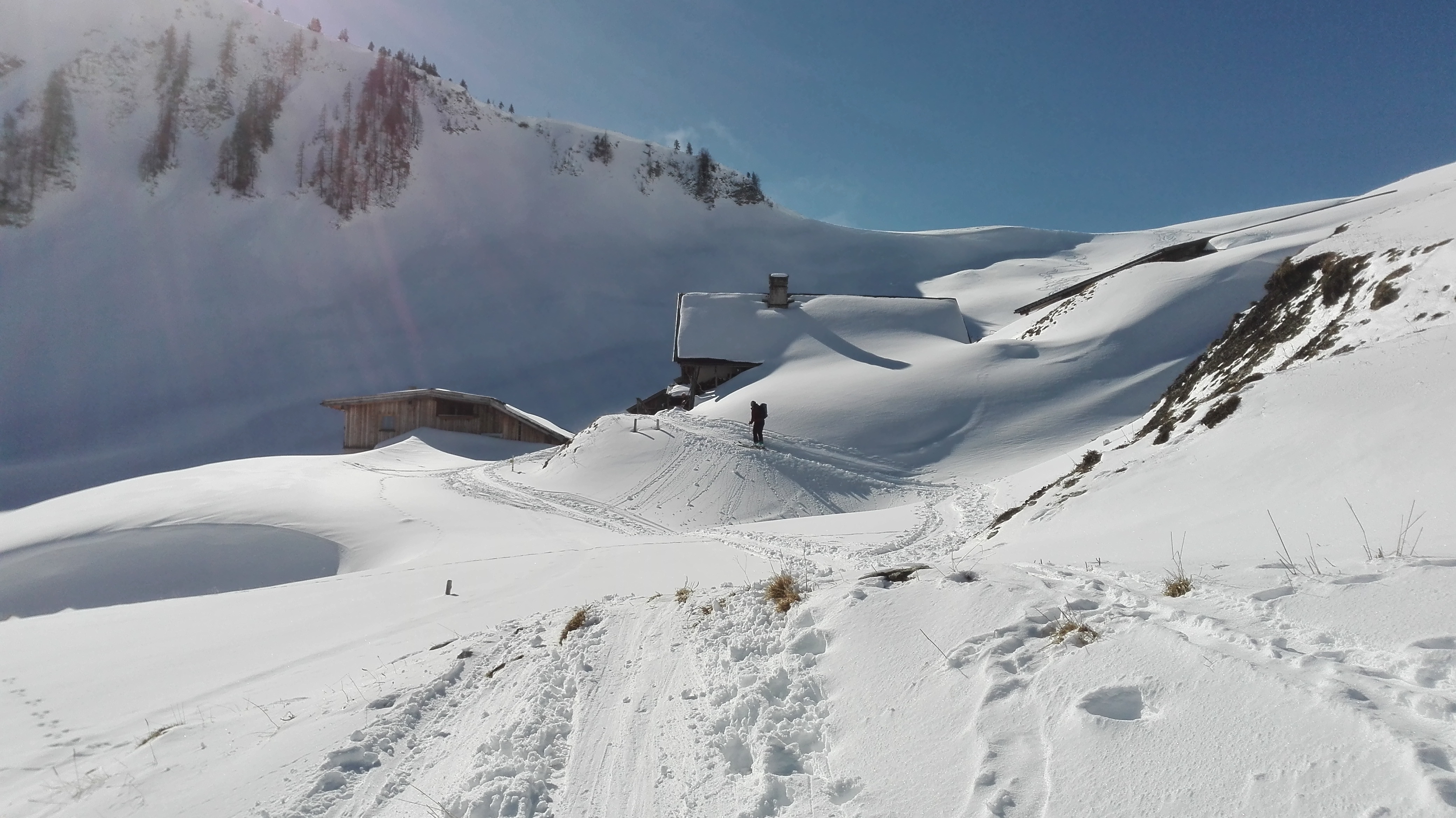 Tourenverhältnisse: Wie in tourentipp beschrieben auf den Gröbner Hals. Forststraße von Anfang an schneebedeckt; unten wenige, oben etwa 10 cm Neuschnee. Im oberen Teil im Schatten noch pulverig, weiter unten schon etwas schwerer, obwohl die Sonne nur oberhalb etwa 1400m schien. Darunter ganztägig Hochnebel.